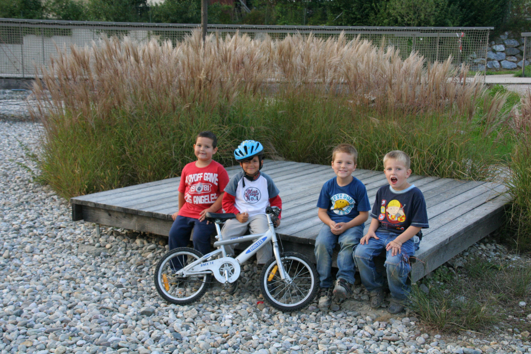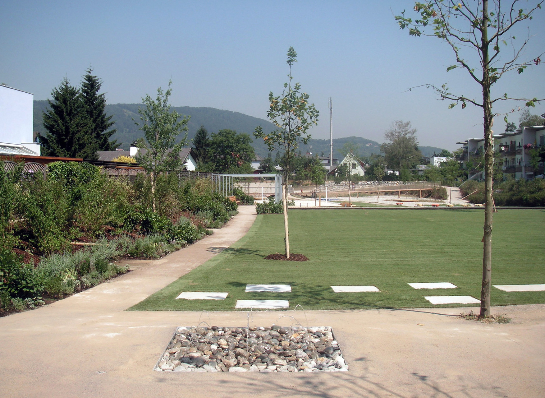 Diese Bereiche durften zum Teil nicht als Pflanzflächen ausgebildet werden. Um einen Übergang zwischen den Wiesenflächen und den Schotterflächen zu erzielen, wurden „Grünzungen“ in das Rückhaltebecken gezogen. In den Schotterflächen selbst gibt es Pflanzinseln mit trockenheitsverträglichen Gräsern.