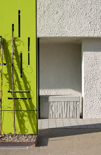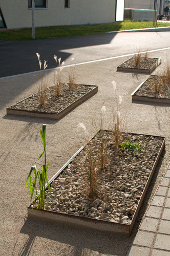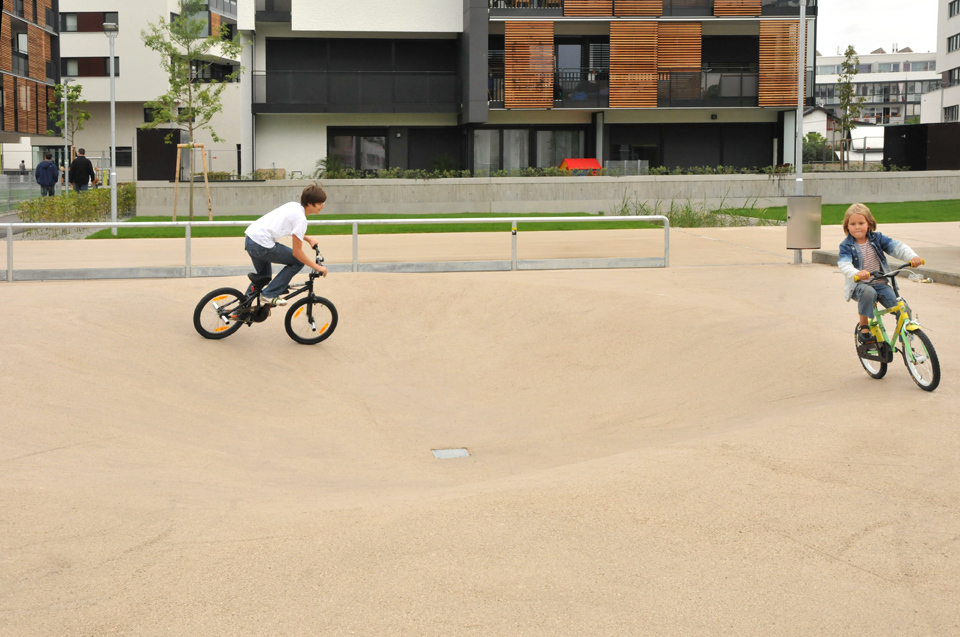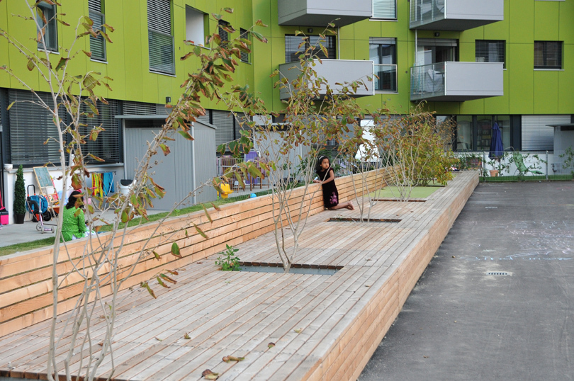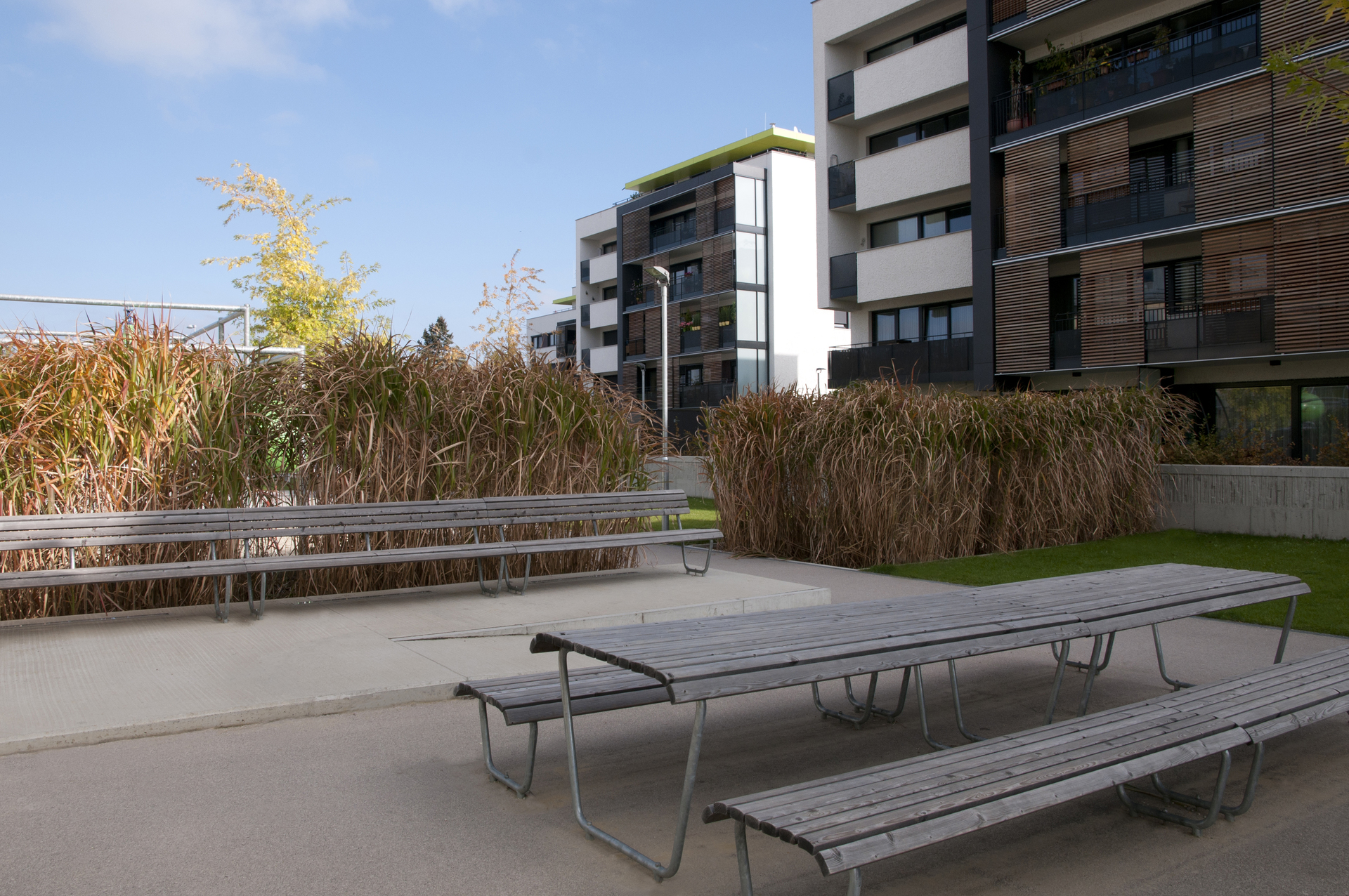 Zwei Zonen bestimmen den Außenraum: Die westlich anschließende, zentrale und öffentliche Parklandschaft einerseits und die kleinräumlichen, intimen Bereiche innerhalb der Zeilen-Punkt-Struktur. Beide Freiräume fließen ineinander und erfüllen jeweils unterschiedliche Aufgaben mit einem großen, gemeinsamen Ziel: die Förderung sozialer Interaktionen. Geringe Niveausprünge und unterschiedliche Materialien zonieren die Räume. Allen Erdgeschosswohnungen wird ein großzügiger Mietergarten vorgelagert. Um die Grenze zwischen öffentlichem und privatem Raum unaufdringlich, aber deutlich zu definieren, wird das Mietergartenniveau gegenüber dem anschließenden Grünraum um 60 cm angehoben. Für die Einfassungen der Mietergärten wählten die Architekten niedrige Stützmauern aus Beton. Wenige Monate nach Schlüsselübergabe ist zu beobachten, dass Thujen dort gepflanzt werden, wo hüfthohe Maschendrahtzäune die Mietergärten abgrenzen, wohingegen jene Gärten, die mit den niedrigeren Betonmauern eingefasst sind, frei von Heckenpflanzungen sind. Am Ende ist den Architekten ein Clou mit der niedrigen Einfriedungsmauer geglückt, indem die Mauer den Mietern das notwendige Maß an subjektiver Abgrenzung bereithält und zugleich den Freiraum als zusammenhängende Einheit erlebbar macht.
