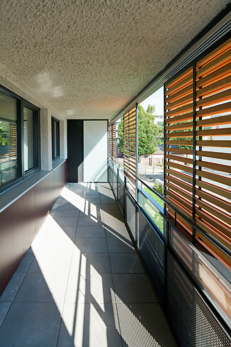 Der Wohnungsmix besteht aus Klein-, Mittel- und Großwohnungen in Form von Geschosswohnungen. Darüberhinaus werden flexible, kombinierbare Wohnungstypen angeboten, für Senioren im Erdgeschoss (2-Zimmer Wohnungen mit vorgelagertem Mietergarten). Alle Wohnungen sind zumindest zweiseitig orientiert. Die bis zu 2 m tiefen Freibereiche erstrecken sich meist über die gesamte Wohnungsbreite. Den Wohnungen in den Dachgeschossen werden Dachterrassen vorgelagert. Die Loggiazone aller Bauteile erhält zur öffentlichen Freifläche hin außenliegende Holz-Schiebeelemente. Diese dienen nicht nur als Sonnen- und Sichtschutz, sondern auch dazu, die Privatsphäre auf den Freibereichen sicherzustellen.