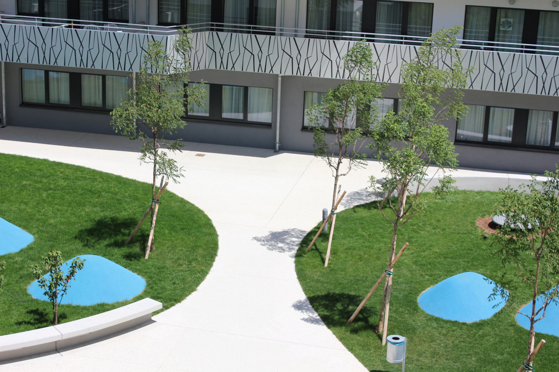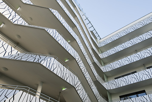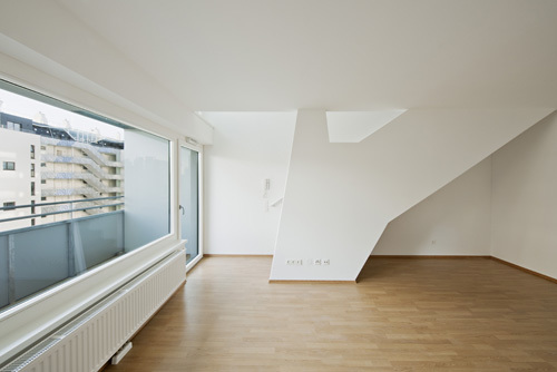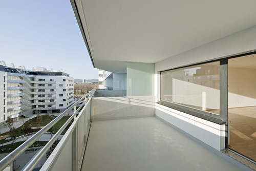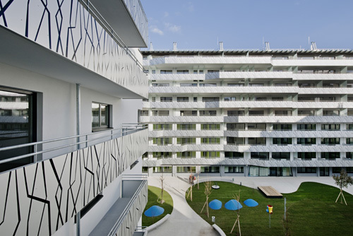 Gute Wohnbauten erkennt man an der Nutzung ihrer halböffentlichen Freiräume – innen wie außen. Im vorliegenden Projekt stehen den Bewohnern im Gebäude Erschließungsflächen zur Verfügung, welche allesamt etwas überdimensioniert ausgeführt sind. Ob offener Laubengang oder Mittelgang, Ecken, Nischen und Durchblicke bieten eine vielfältige erweiterte Wohnzone, die mit Pflanzen und Leben erfüllt werden darf. Die Architekten erwarten sich dadurch gute Nachbarschaften, da erfahrungsgemäß bei der Betreuung dieser Flächen die Bewohner „en passant“ in Kontakt treten. Als ergänzendes Freiraumangebot steht den Mietern am Dachgeschoss des L-Riegels ein Dachgarten als Gemeinschaftsfläche zur Verfügung. Hier können Beete bepflanzt werden, deren Pflege die Menschen formlos miteinander verbinden wird. Auch für die Loggien und Balkone wurde ein Bezug zur Botanik hergestellt: hier zieren grafisch nachgebildete Äste (in Siebdrucktechnik auf den Tafeln aufgebracht) die eloxierten Aluminiumtafeln und prägen den hofseitigen Eindruck der Wohnanlage. (Text: Architekten, redaktionell überarbeitet und erweitert Martina Frühwirth)