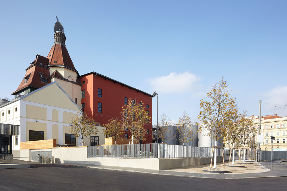 Sofort sticht auch der auffällige „´Barcode-Zaun` ins Auge, der das Gelände von der verkehrsreichen Ottakringer Straße, Feßt- und Grüllemeiergasse abgrenzt. An Stelle der lange den Straßenraum dominierenden Plakatwände wurde ein Metallzaun errichtet, der sowohl Einblicke auf das Gelände als auch Ausblicke nach Ottakring gewährt. Das imposante Brauerei-Gebäude und die auffälligen Tanks präsentieren sich nun endgültig und ohne Sichtbarriere als das stadtprägende Ensemble an diesem Ort – somit ein neuer Hot-Spot für den 16. Bezirk. Bei der Ausführung des Zauns wurde das Motiv des Barcodes aufgegriffen, welcher bereits zu einem klassischen Symbol von Industriegütern geworden ist. Es wurden dafür Zaunfelder entwickelt, deren Stab-Abfolge für ein abwechslungsreiches, rhythmisches Bild sorgt.