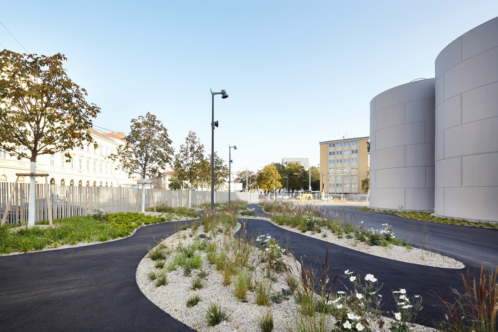 Ein weiteres freiraumplanerisches Element ist die Baumreihe entlang der Ottakringer Straße, die das Gelände zur Straße hin abgrenzt und für ein Pendant zu den Tanks sorgt. Als freiraumplanerisches Motiv standen hier historische Gastgärten in den Innenhöfen der Gründerzeitverbauung Pate, welche mit ihren mächtigen Kronen die Fassadenfluchten durchbrachen und auch heute noch angenehmes Grün sowie Kühlung zur Naherholung in die innerstädtischen Bereiche bringen.