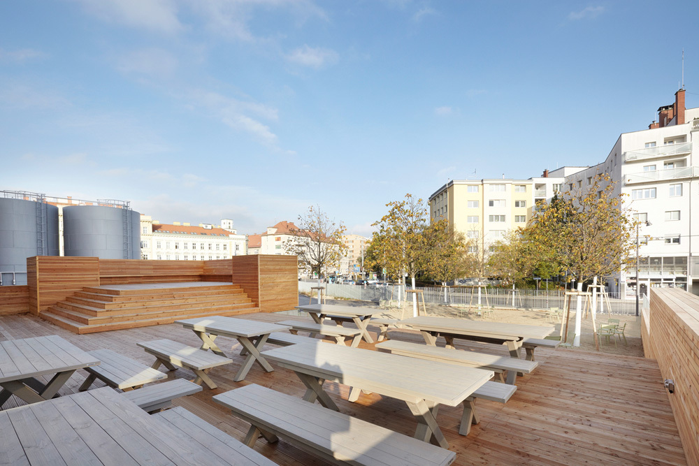 Für Veranstaltungen steht zudem die ´Lounge-Terrasse` vor dem Goldfassl-Magazin als Ort der Begegnung zur Verfügung. Von der Holzterrasse aus bietet sich ein schöner Ausblick auf die darunter liegende Eventfläche. Holztreppen führen die Besucherinnen und Besucher von hier aus in die ´Baumhalle`, welche aus rotblühenden Kastanienbäumen – in Anlehnung an Rosskastanien als typische Biergartenbäume – gestaltet ist. Die Baumkronen sind sowohl Schattenspender im Sommer als auch Blickfang und kennzeichnen den Gastgartenbereich der Ottakringer Brauerei.