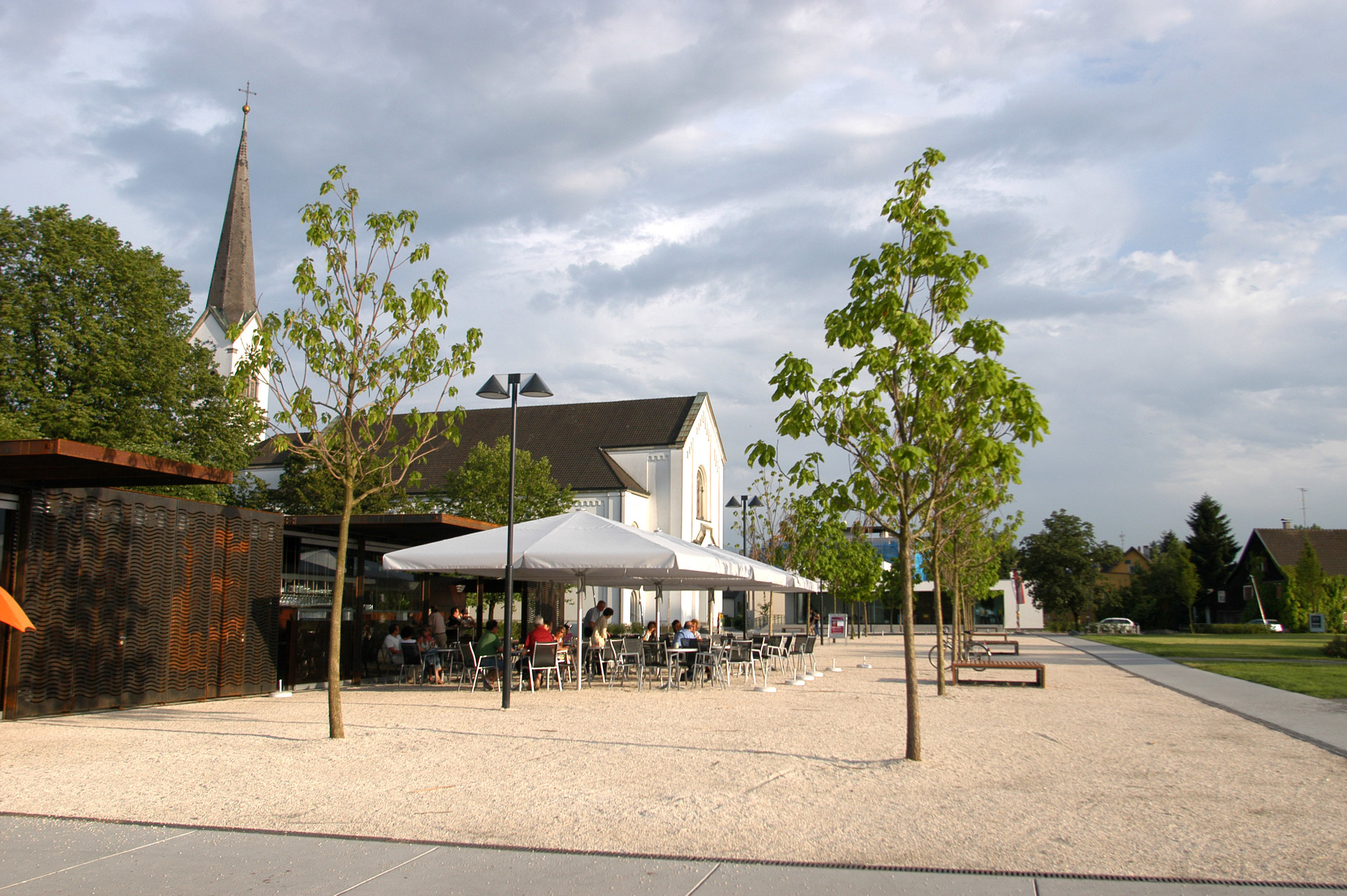 Die wesentlichen Eckpfeiler des Gestaltungskonzeptes sind die neuen Sichtachsen, die sich einerseits vom „Thaler-Areal“ zur Kirche / neues Pfarrzentrum, und andererseits vom Hauptportal der Pfarrkirche zum Harder Binnenbecken erstrecken. Alleeartige Baumpflanzungen mit säulenförmigen Hainbuchen verstärken die räumliche Wirkung der Sichtachsen.