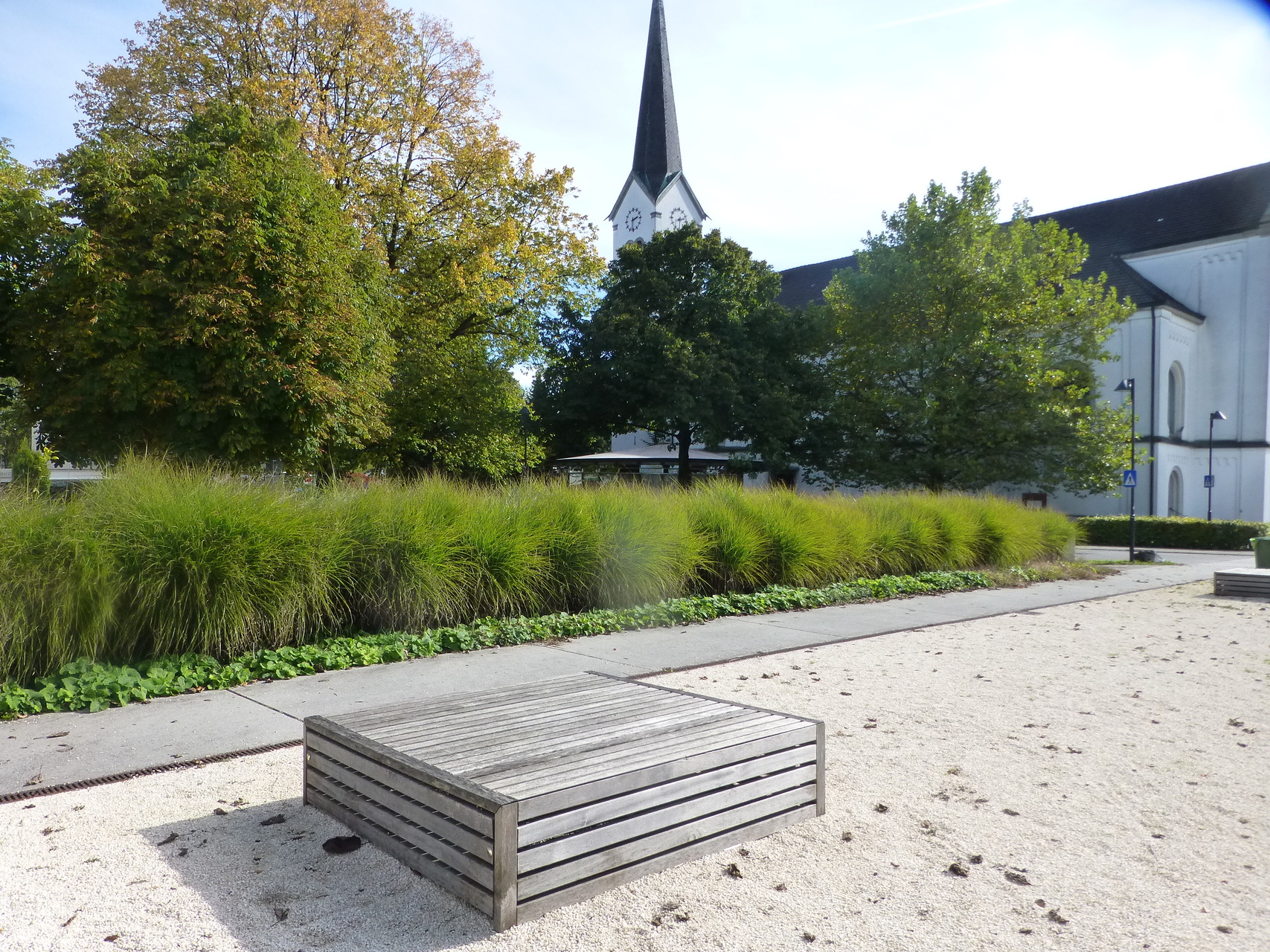 Die Promenade entlang des Sporthafens, mit Sitzstufen und sieben überdimensionalen Staudenbeeten, weitet sich beim Seekiosk zu einem großen gekiesten Platz aus Jurakalk mit Betoneinfassungen und mündet im neuen Kirchplatz.