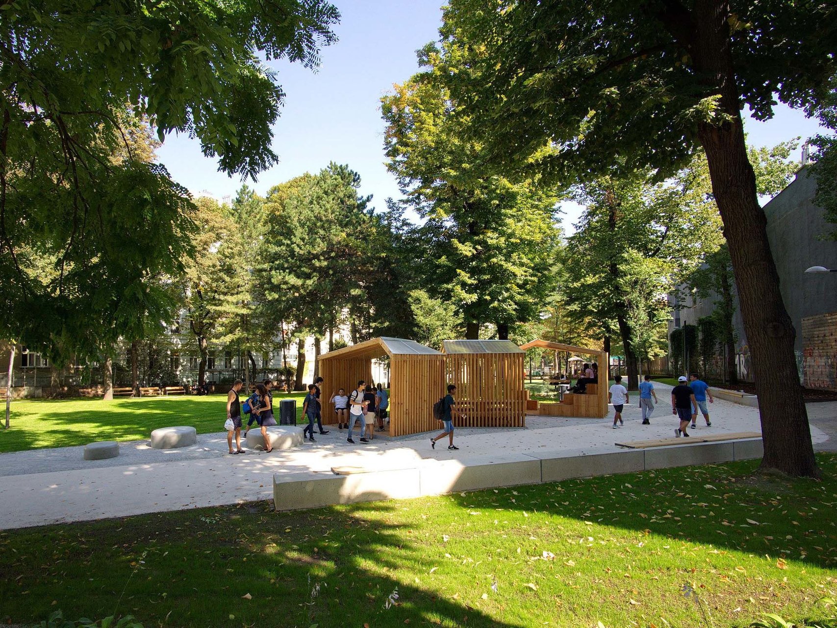 Der Josef Strauss Park bekommt an der Kaiserstraße ein neues Entree. Ein bumerangförmiger Bogen in Asphalt und wassergebundener Decke betont die Breite und verbindet die beiden Achsen.