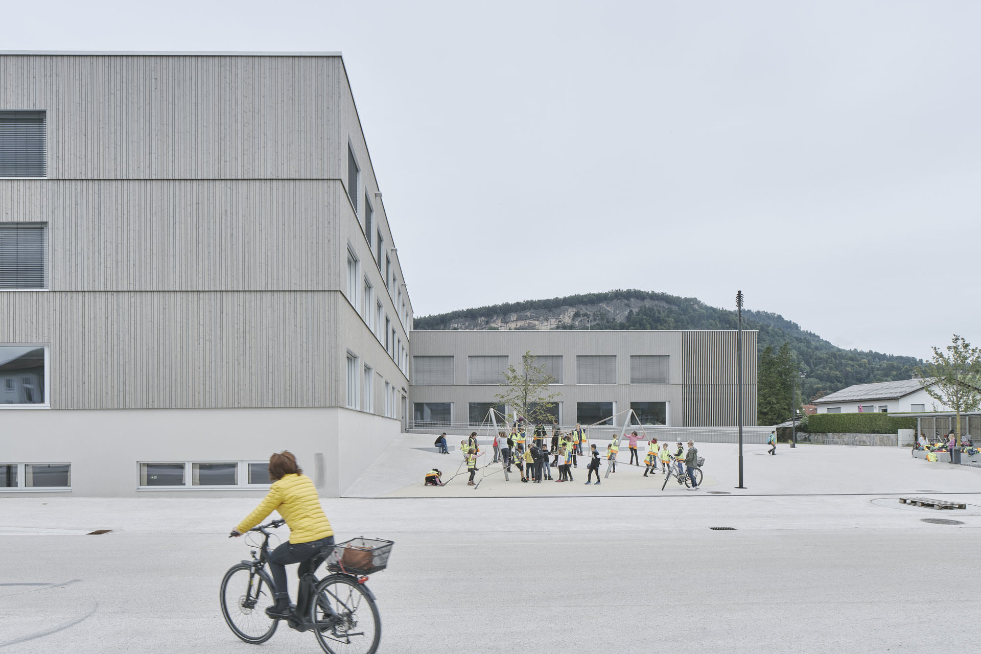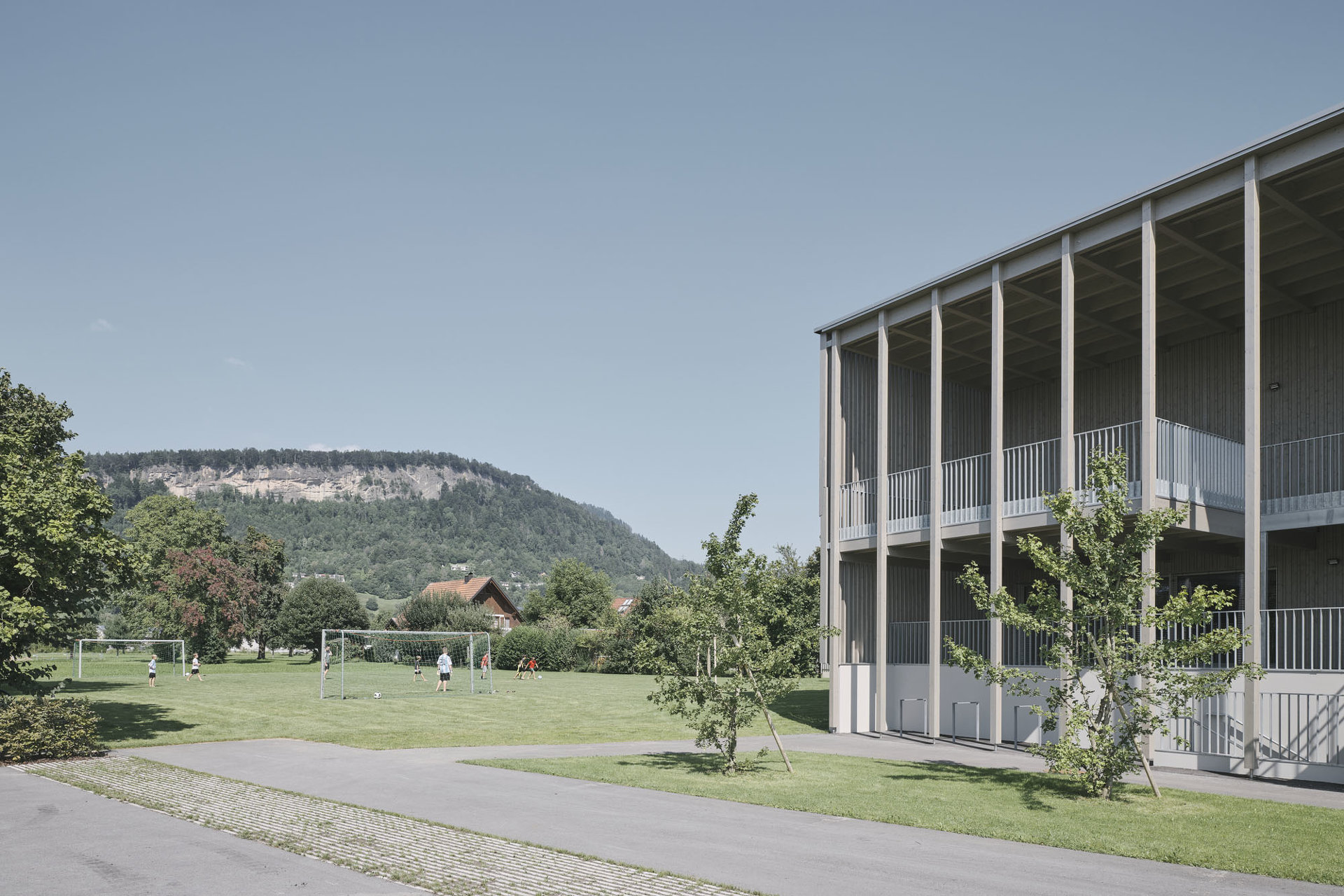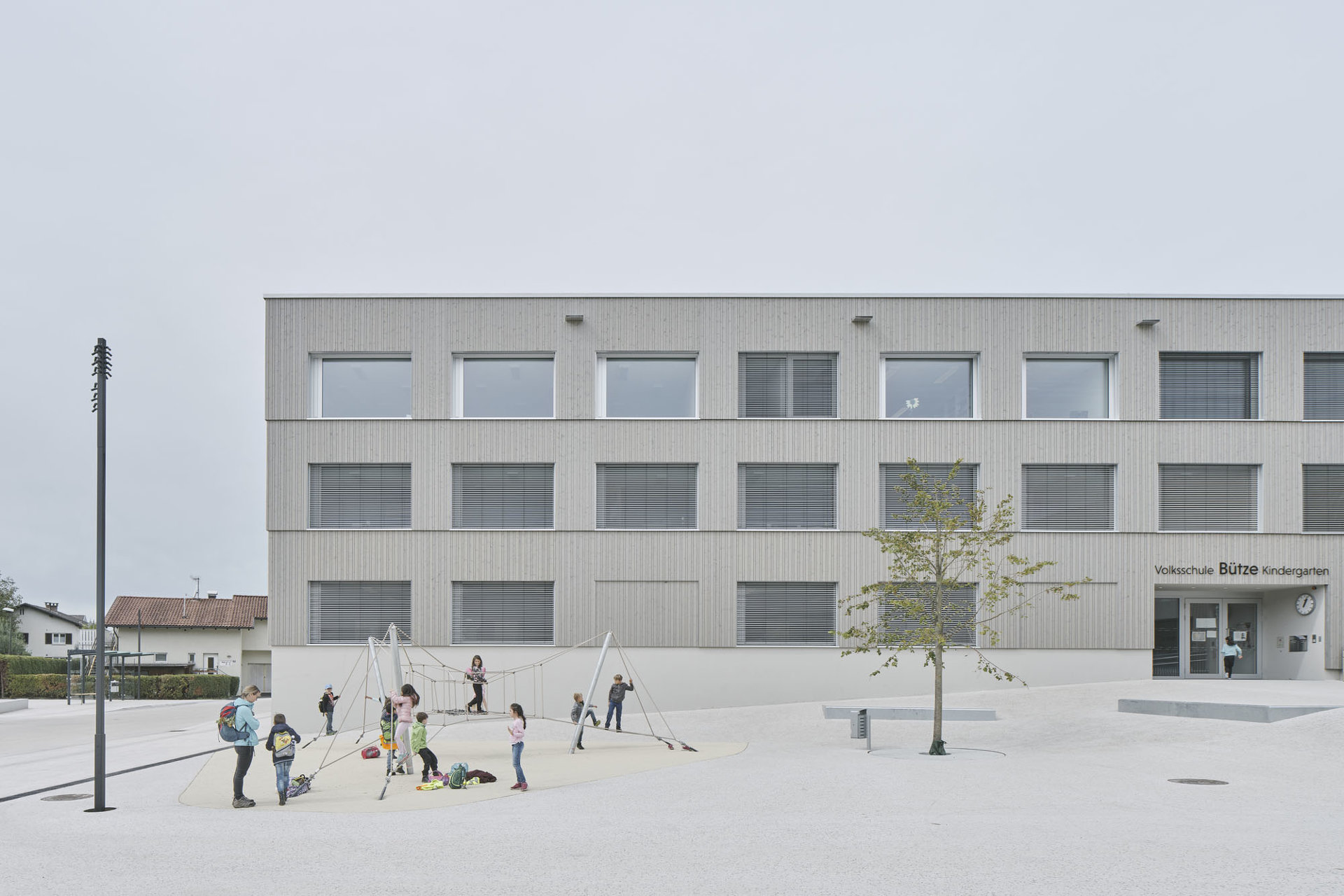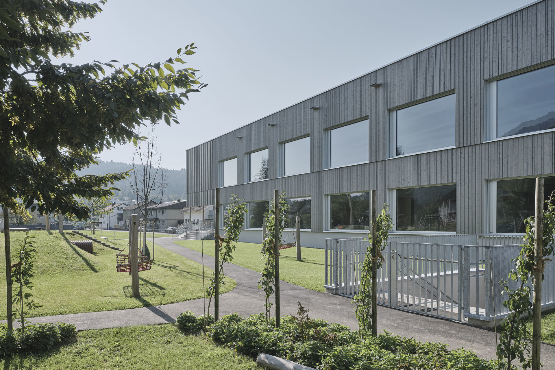 Den diversen Nutzungen des Hauses als Kindergarten, Volksschule, Turnsaal und Veranstaltungsort werden klar definierte Räumlichkeiten zugeordnet, die über die zentralen Atrien und Lichthöfe in Beziehung treten – eine Hausgemeinschaft entsteht. Innerhalb der autarken Zonen können Gemeinschaftsflächen je nach Bedarf generiert werden, unnütze Korridorbereiche werden damit vermieden. Die Pergolen an den Enden des Neubaus, die auch als Fluchtweg dienen, funktionieren wie „Kiemen“ zum Außenraum und legen die Struktur des Baus offen. Die Fensterrhythmik der dezent grauen Holzfassade orientiert sich an der Sitzhöhe von Kindern und fügt sich harmonisch in die ländliche Umgebung ein. (Text: Architekten, bearbeitet)