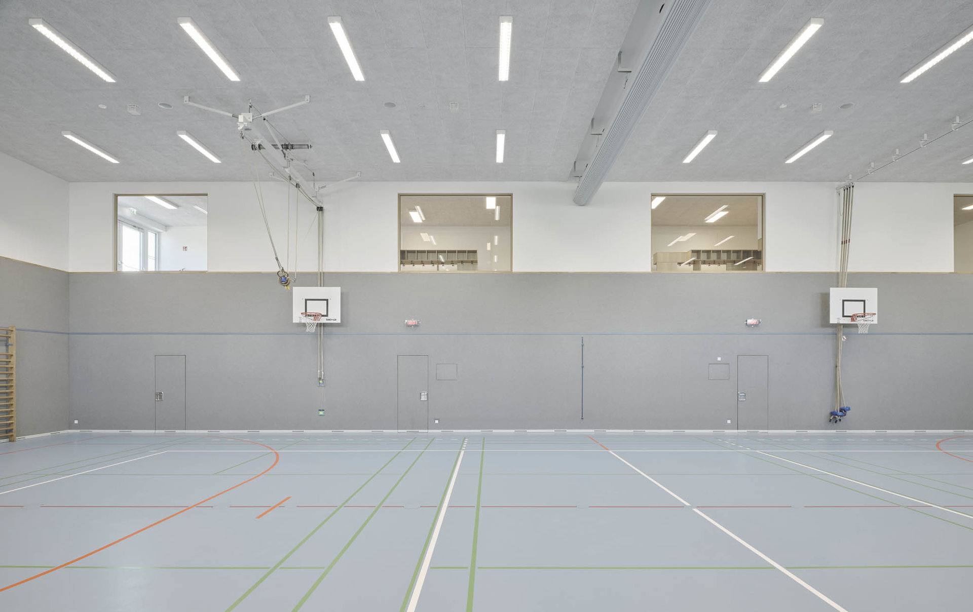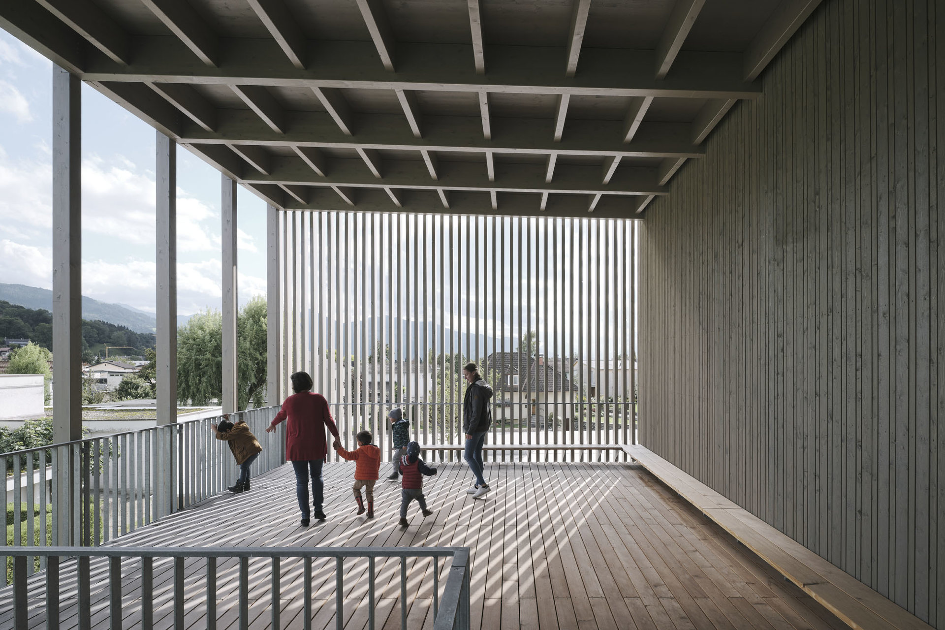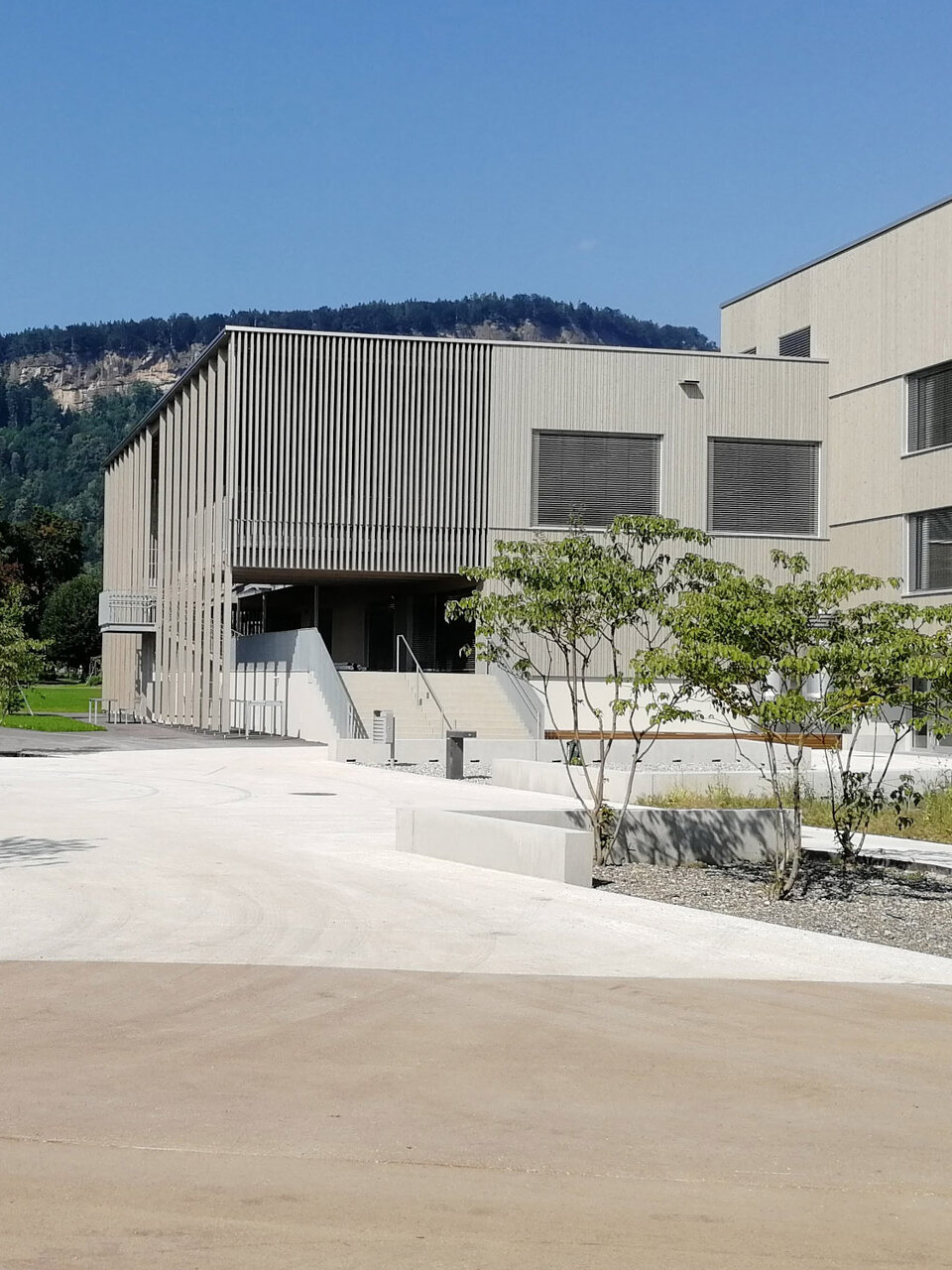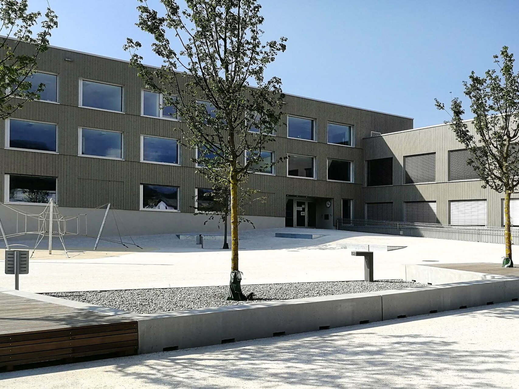 Den diversen Nutzungen des Hauses als Kindergarten, Volksschule, Turnsaal und Veranstaltungsort werden klar definierte Räumlichkeiten zugeordnet, die über die zentralen Atrien und Lichthöfe in Beziehung treten – eine Hausgemeinschaft entsteht. Innerhalb der autarken Zonen können Gemeinschaftsflächen je nach Bedarf generiert werden, unnütze Korridorbereiche werden damit vermieden. Die Pergolen an den Enden des Neubaus, die auch als Fluchtweg dienen, funktionieren wie „Kiemen“ zum Außenraum und legen die Struktur des Baus offen. Die Fensterrhythmik der dezent grauen Holzfassade orientiert sich an der Sitzhöhe von Kindern und fügt sich harmonisch in die ländliche Umgebung ein. (Text: Architekten, bearbeitet)
