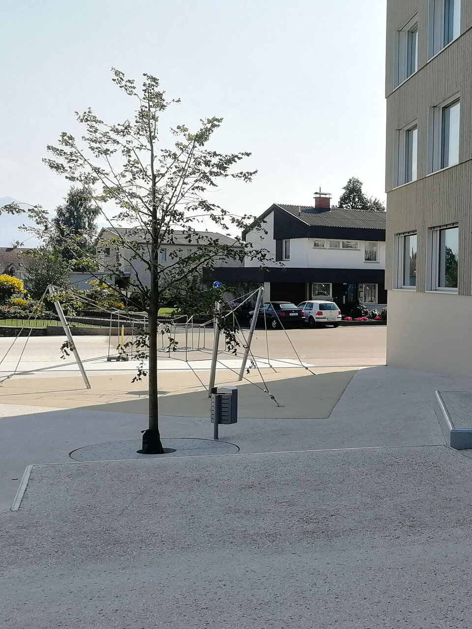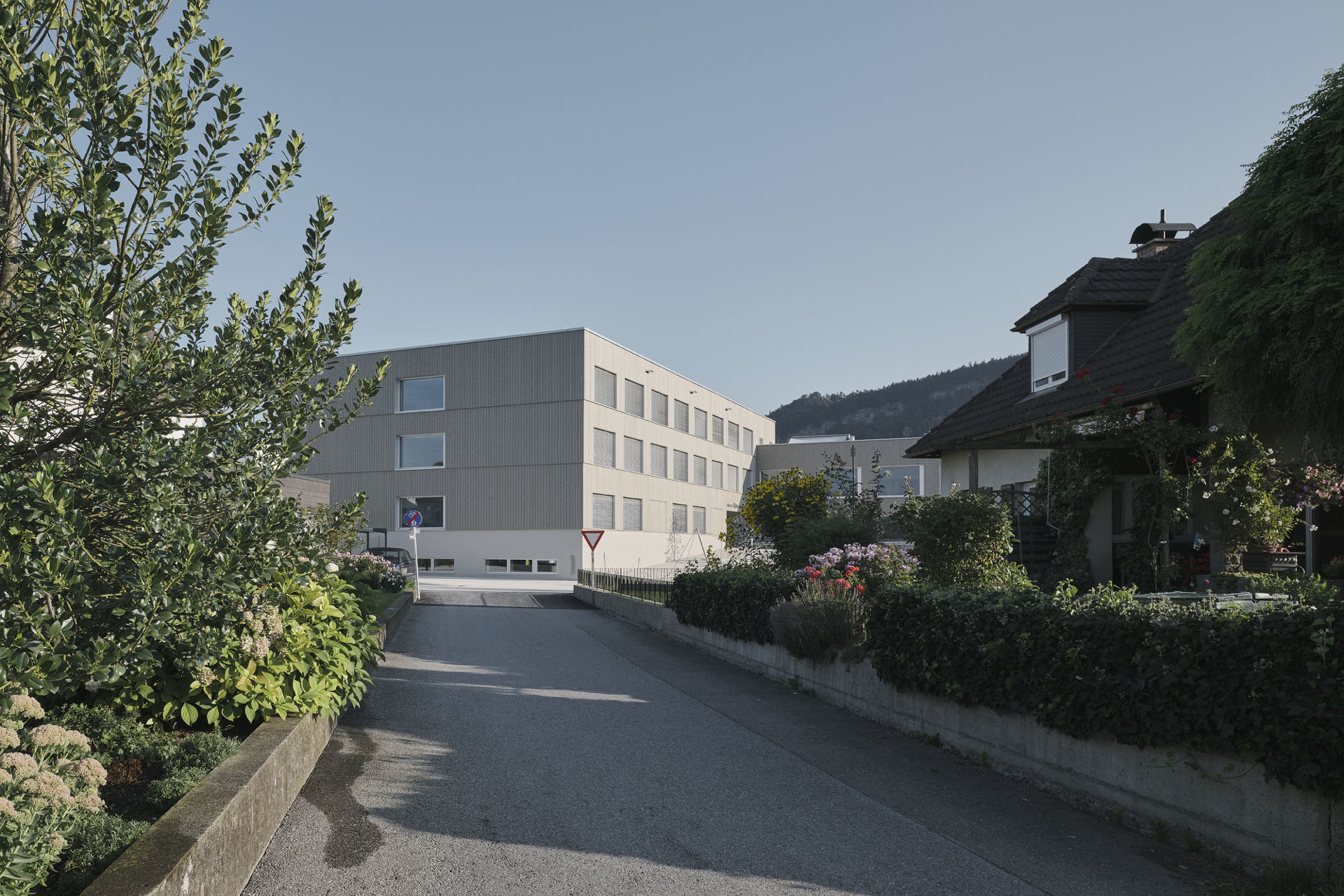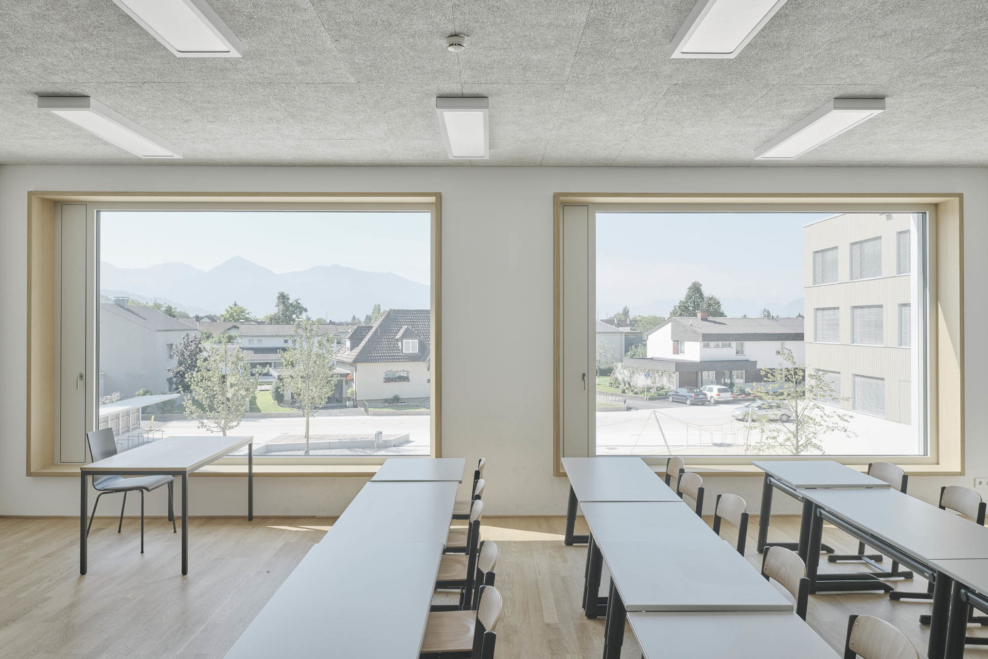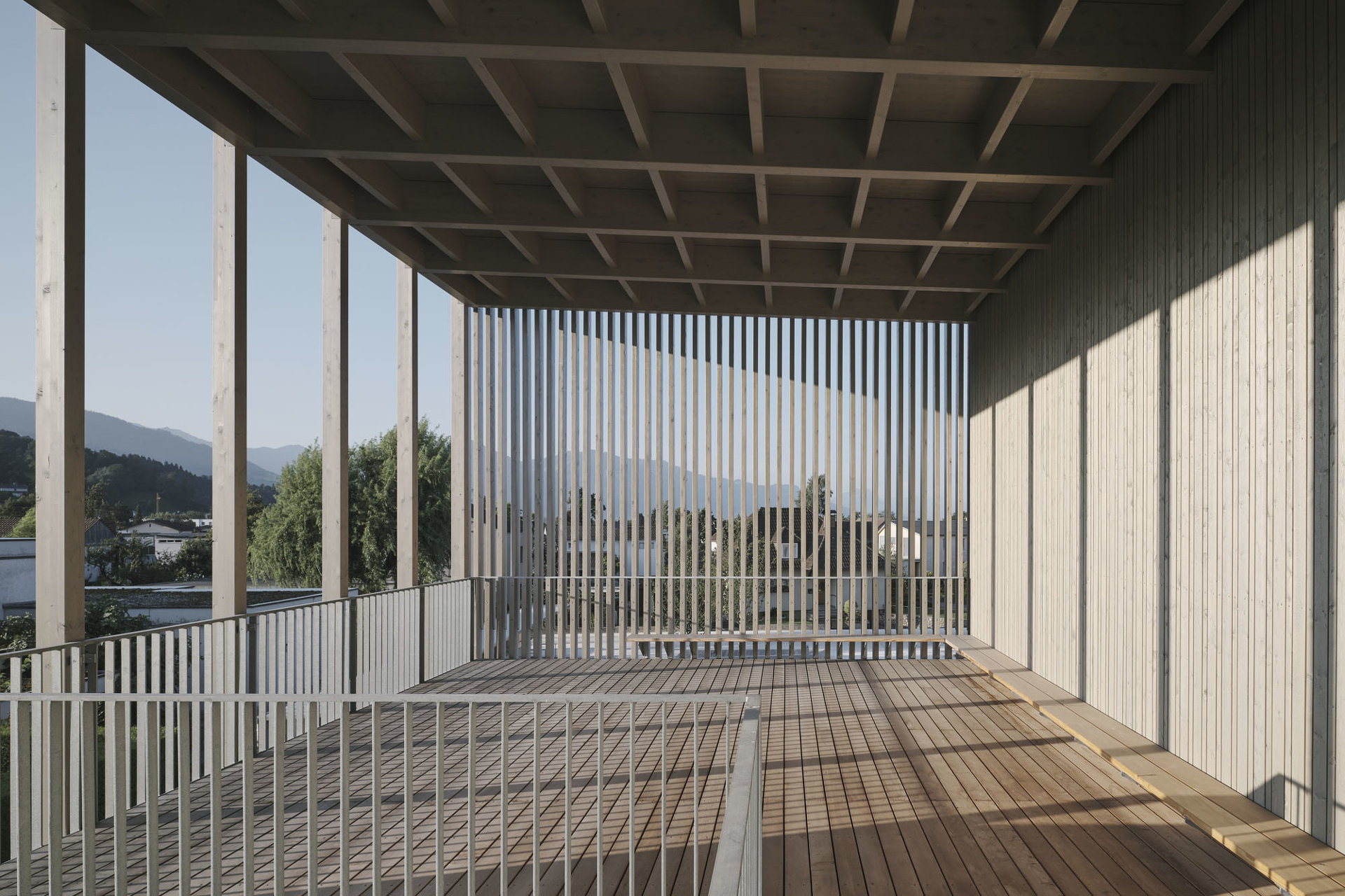 Den diversen Nutzungen des Hauses als Kindergarten, Volksschule, Turnsaal und Veranstaltungsort werden klar definierte Räumlichkeiten zugeordnet, die über die zentralen Atrien und Lichthöfe in Beziehung treten – eine Hausgemeinschaft entsteht. Innerhalb der autarken Zonen können Gemeinschaftsflächen je nach Bedarf generiert werden, unnütze Korridorbereiche werden damit vermieden. Die Pergolen an den Enden des Neubaus, die auch als Fluchtweg dienen, funktionieren wie „Kiemen“ zum Außenraum und legen die Struktur des Baus offen. Die Fensterrhythmik der dezent grauen Holzfassade orientiert sich an der Sitzhöhe von Kindern und fügt sich harmonisch in die ländliche Umgebung ein. (Text: Architekten, bearbeitet)