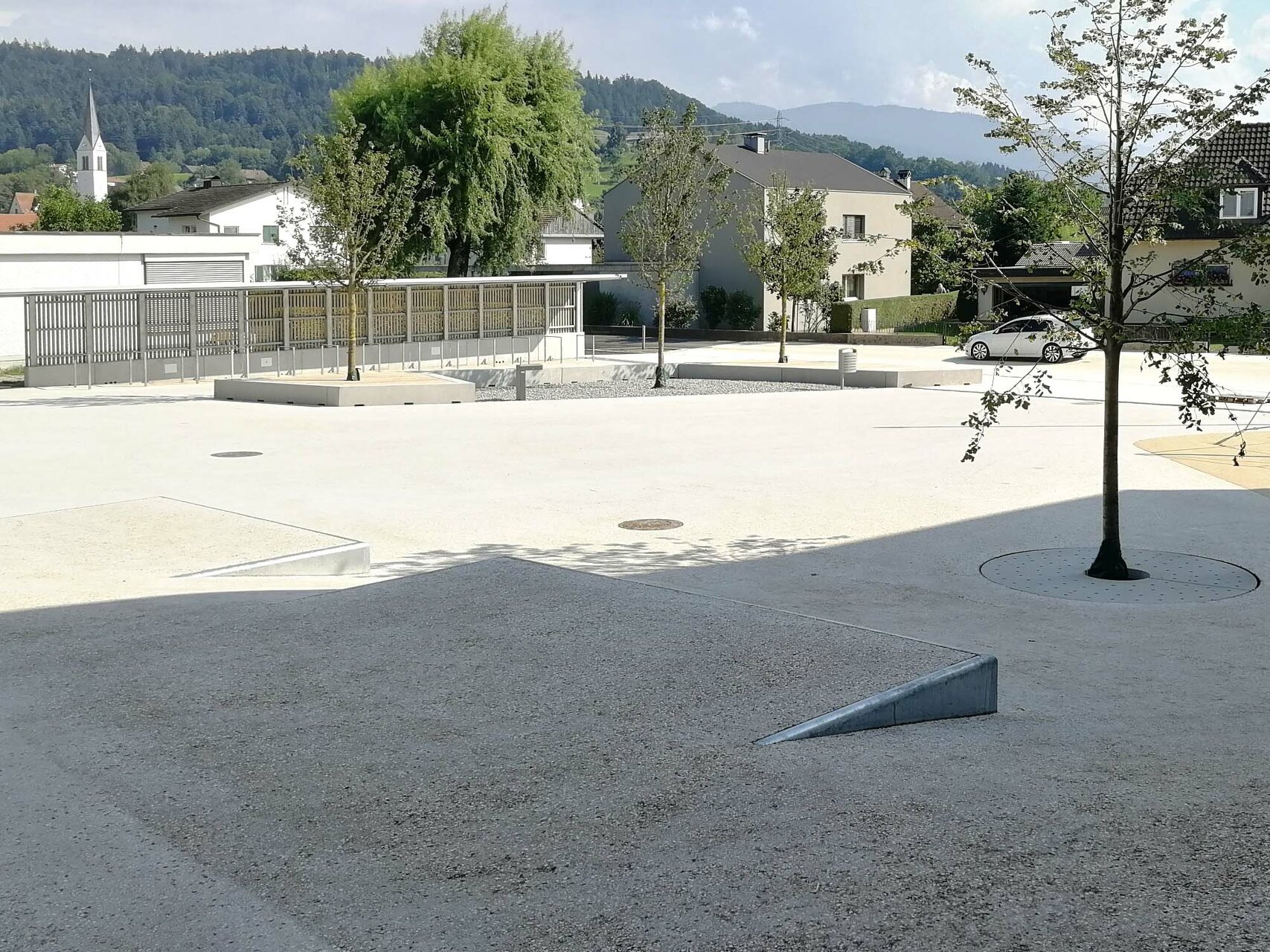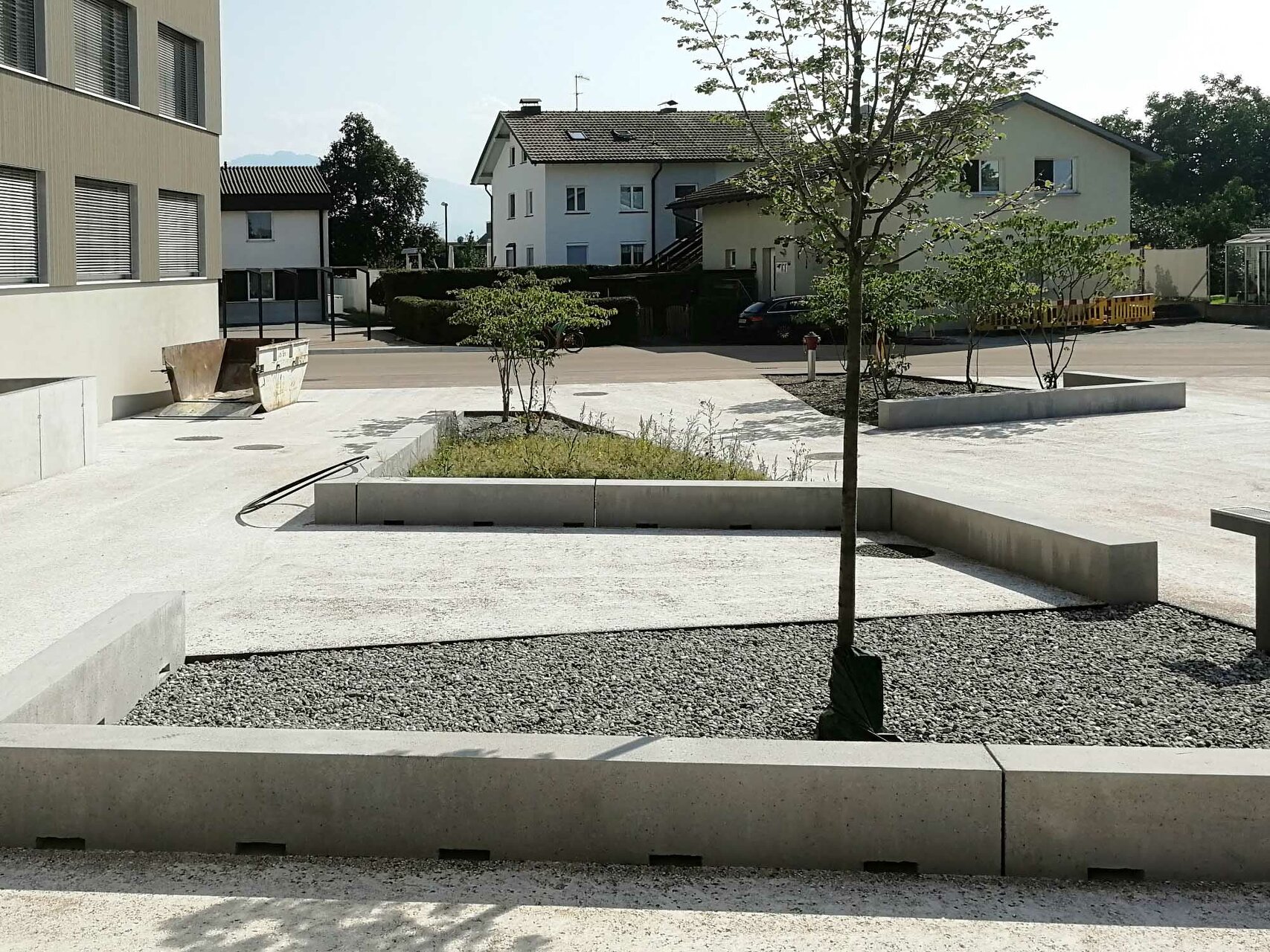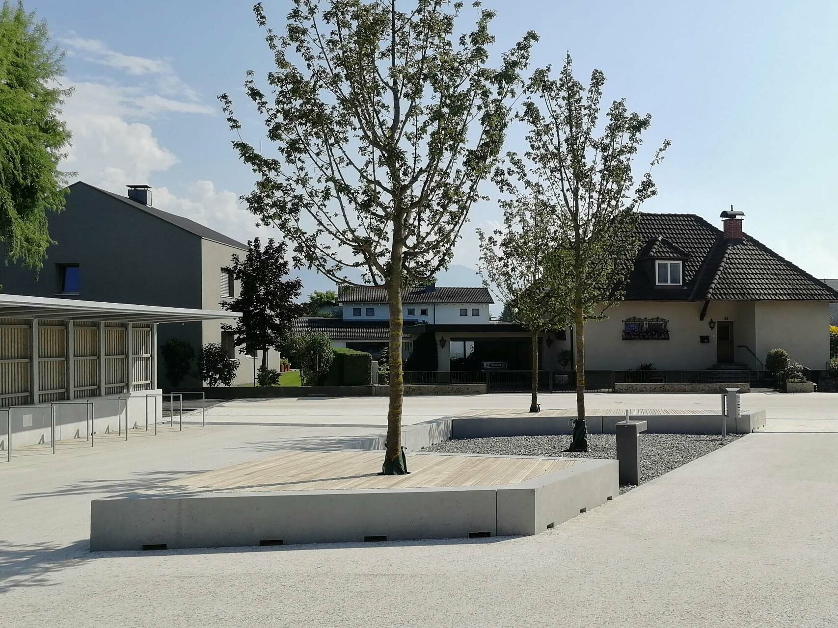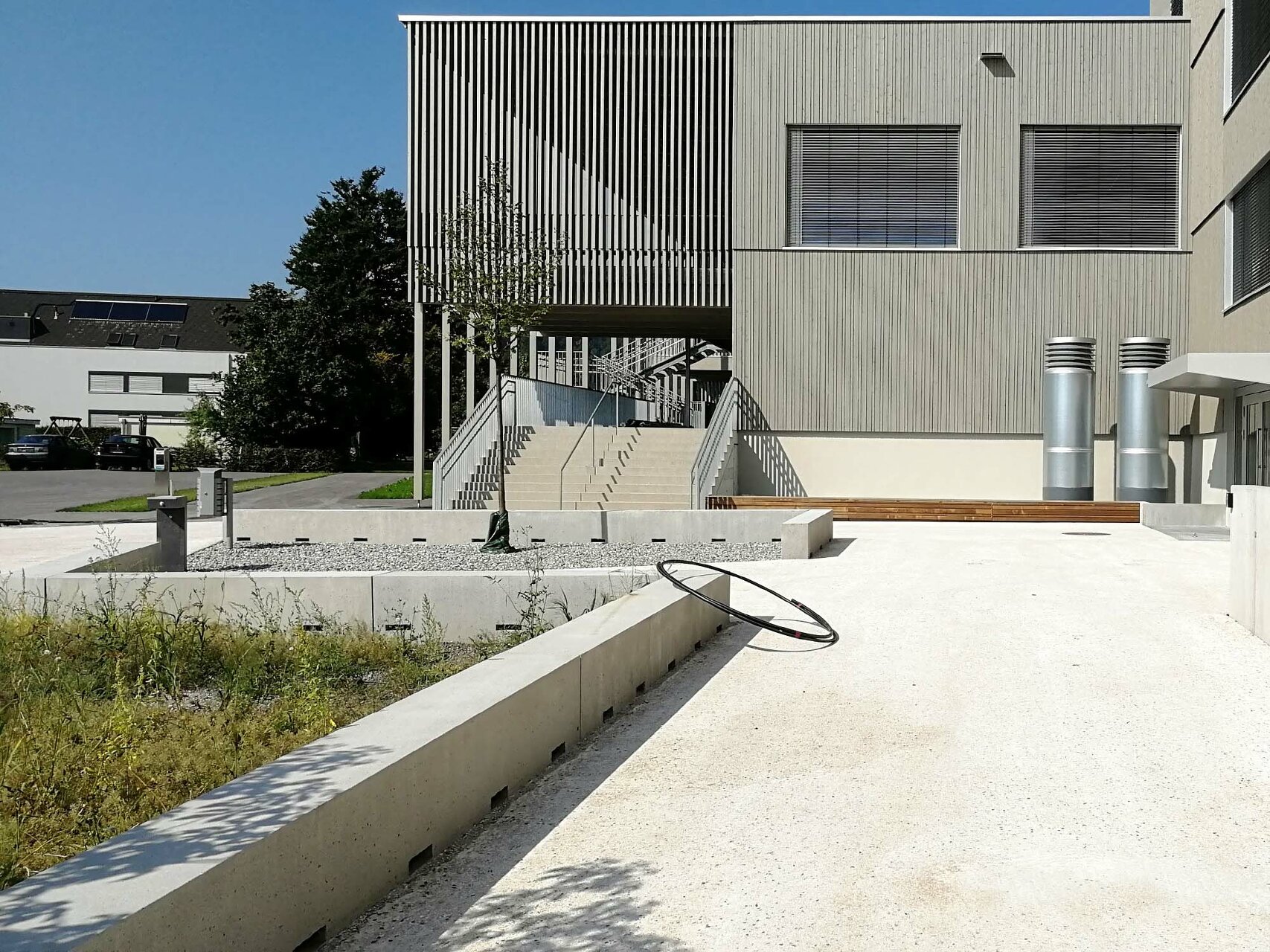 Den diversen Nutzungen des Hauses als Kindergarten, Volksschule, Turnsaal und Veranstaltungsort werden klar definierte Räumlichkeiten zugeordnet, die über die zentralen Atrien und Lichthöfe in Beziehung treten – eine Hausgemeinschaft entsteht. Innerhalb der autarken Zonen können Gemeinschaftsflächen je nach Bedarf generiert werden, unnütze Korridorbereiche werden damit vermieden. Die Pergolen an den Enden des Neubaus, die auch als Fluchtweg dienen, funktionieren wie „Kiemen“ zum Außenraum und legen die Struktur des Baus offen. Die Fensterrhythmik der dezent grauen Holzfassade orientiert sich an der Sitzhöhe von Kindern und fügt sich harmonisch in die ländliche Umgebung ein. (Text: Architekten, bearbeitet)