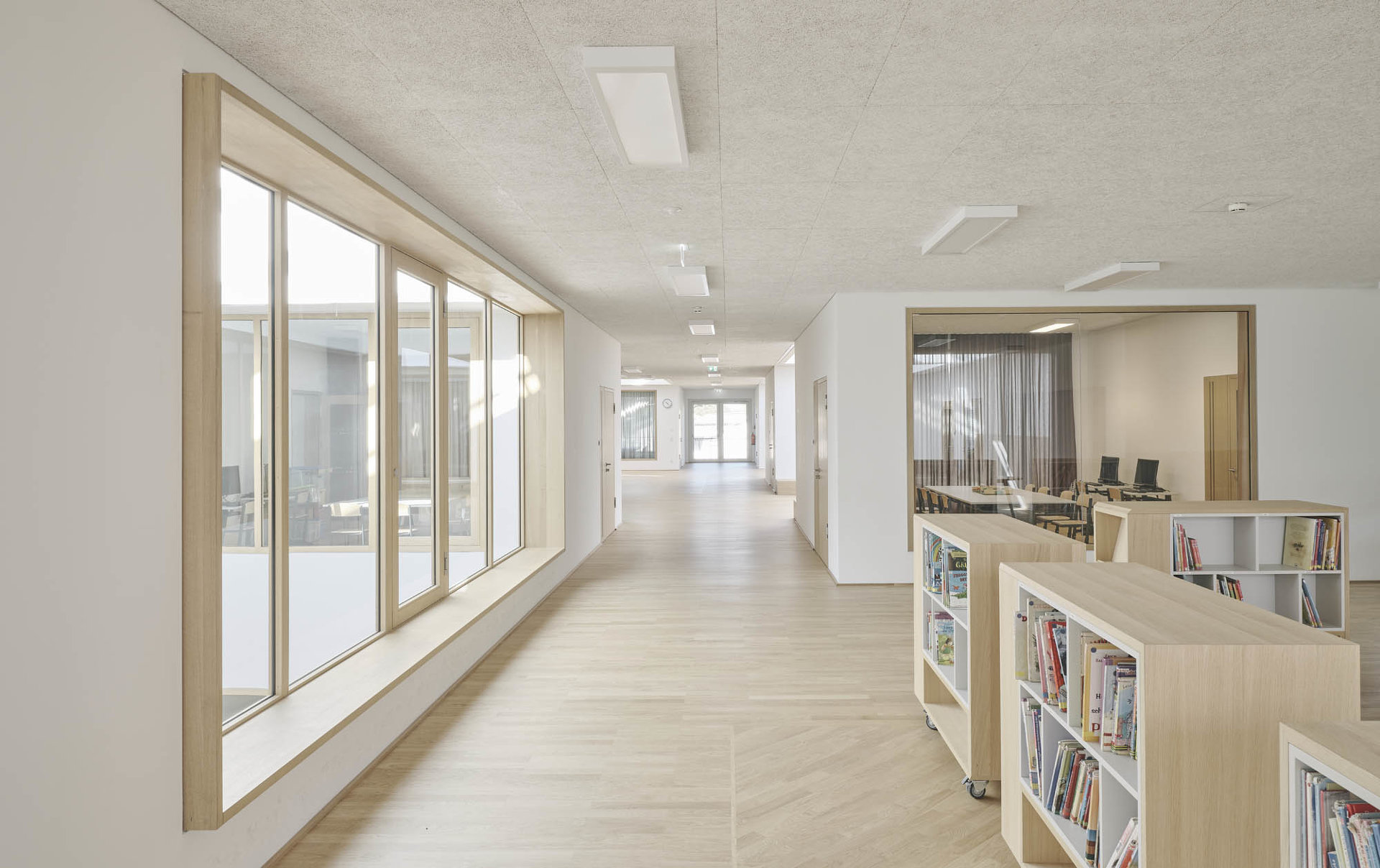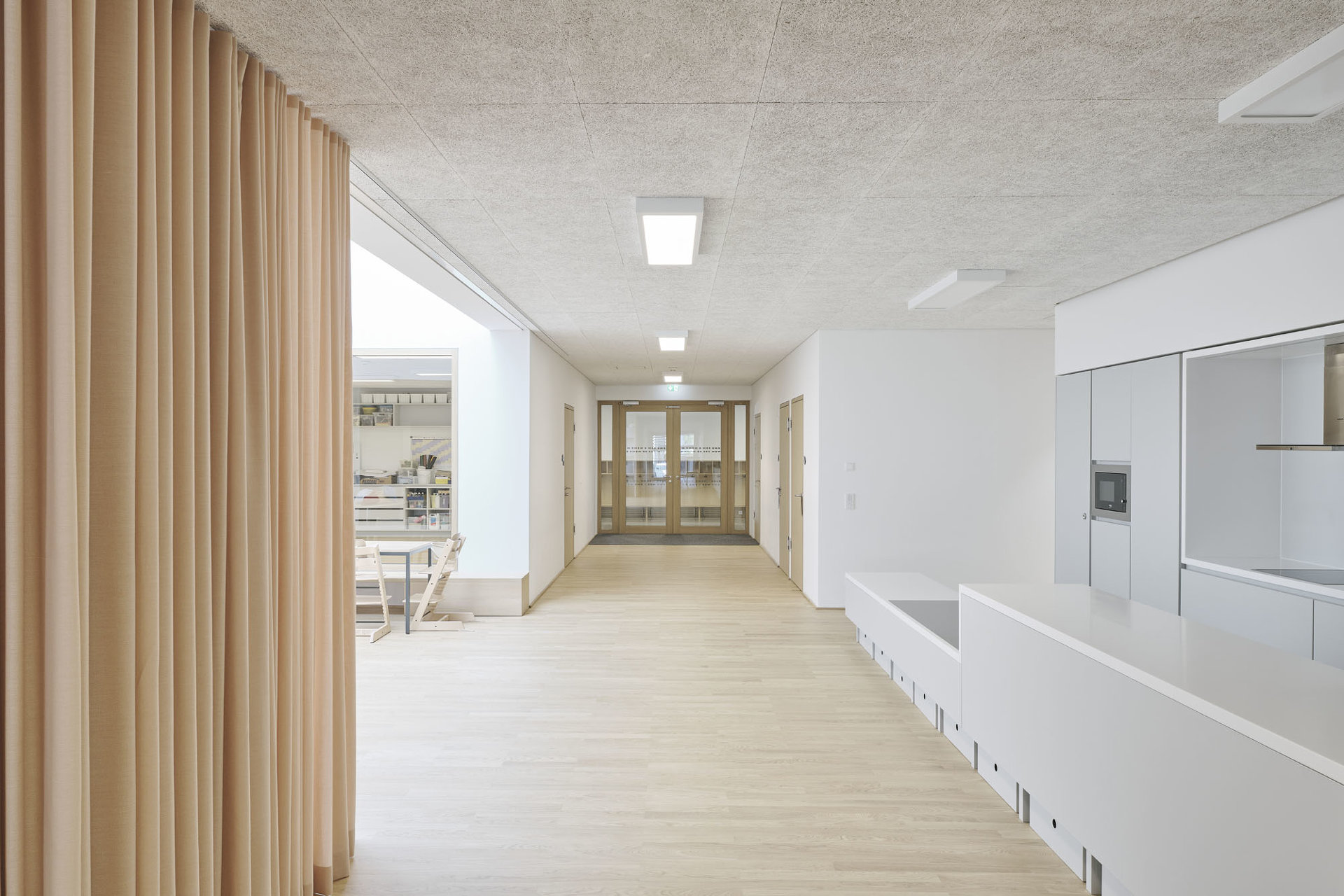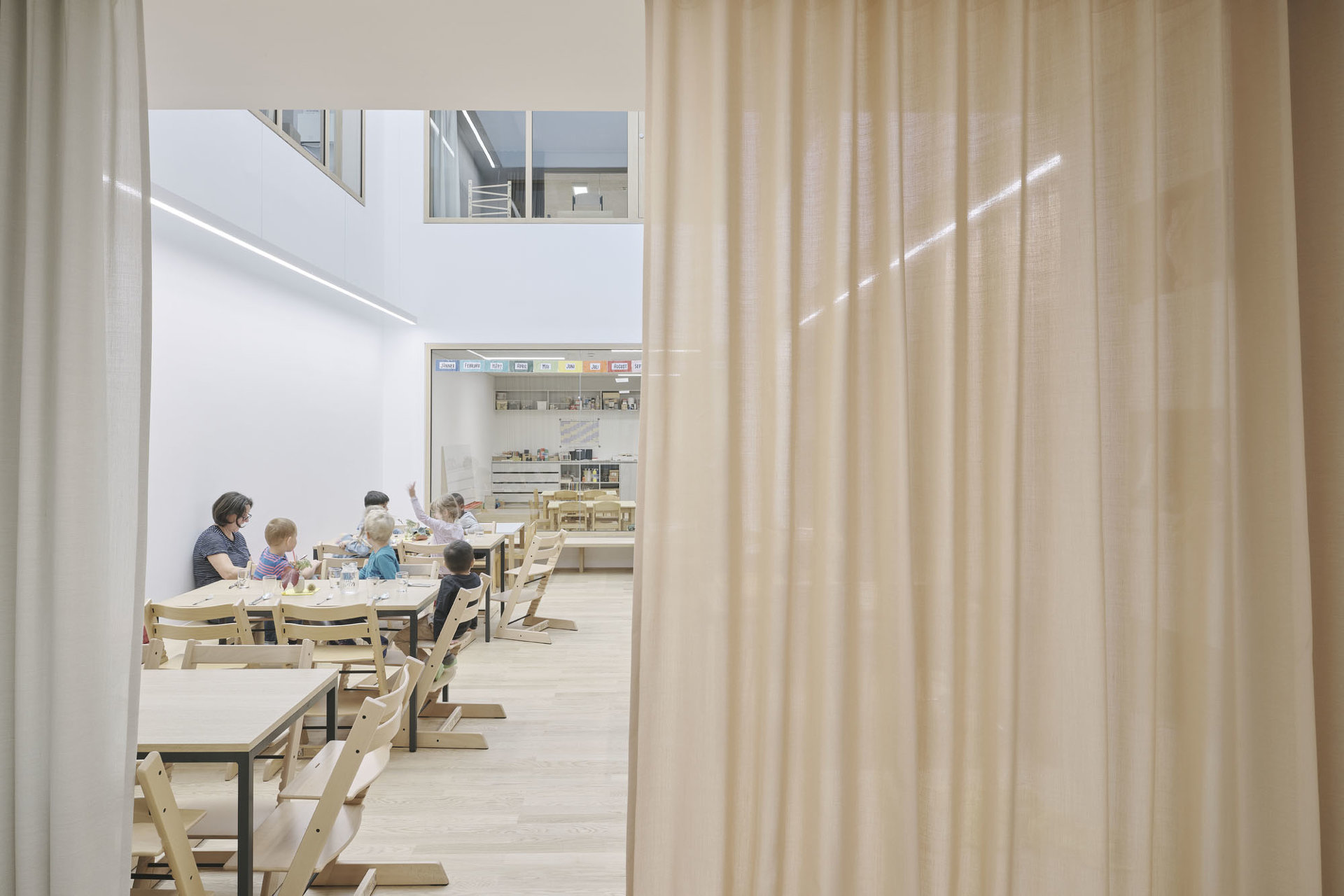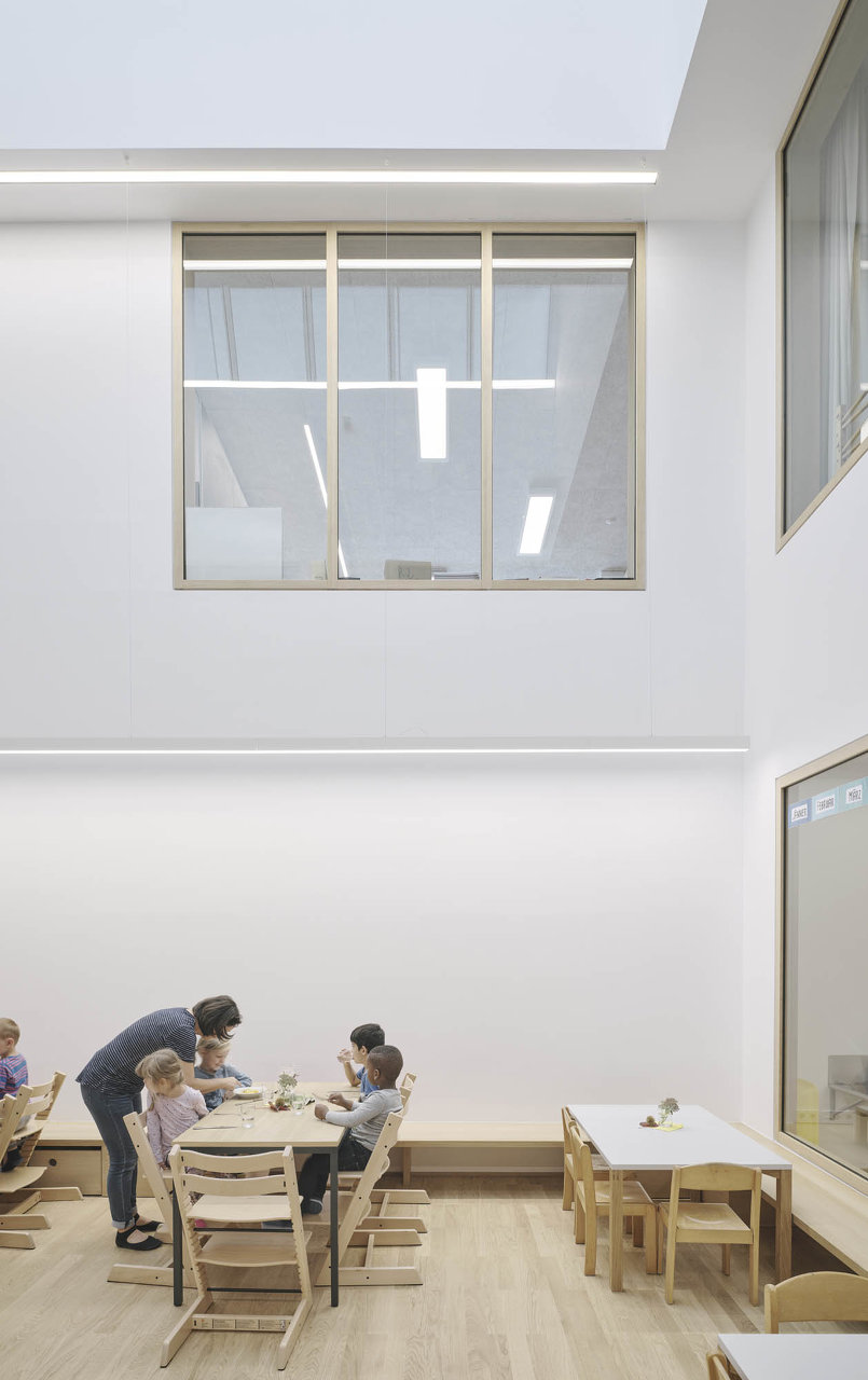 Die Schule ist ein detailreich orchestriertes Raumkontinuum mit intimen Rückzugsorten und kommunikativen Hofsituationen. Großzügige Oberlichten und Verglasungen erlauben spannende Sichtachsen, Licht- und Schattenspiele – frei nach Josef Frank: Die Schule als Weg und Platz. Behagliche Atmosphäre trifft auf lokale Handwerkskunst: Fensterrahmen, Parkett und hochwertig verarbeitete Möbel aus Eichenholz, dazu Deckenplatten aus Holzwolle für eine angenehme Akustik und eine gesunde Umgebung für die Kleinsten. Der Grundriss ist vertikal und horizontal verzahnt, um den Kindern im wahrsten Sinne des Wortes möglichst wenig Wände und Barrieren in den Weg zu stellen. Es gibt viele Freiflächen zum Toben, mobile Regale und Rollcontainer folgen den Kindern, wohin sie wollen – Vorhänge, gemütliche Kuschelecken und integrierte Sitzbänke laden zum Rasten oder zum Rückzug ein.