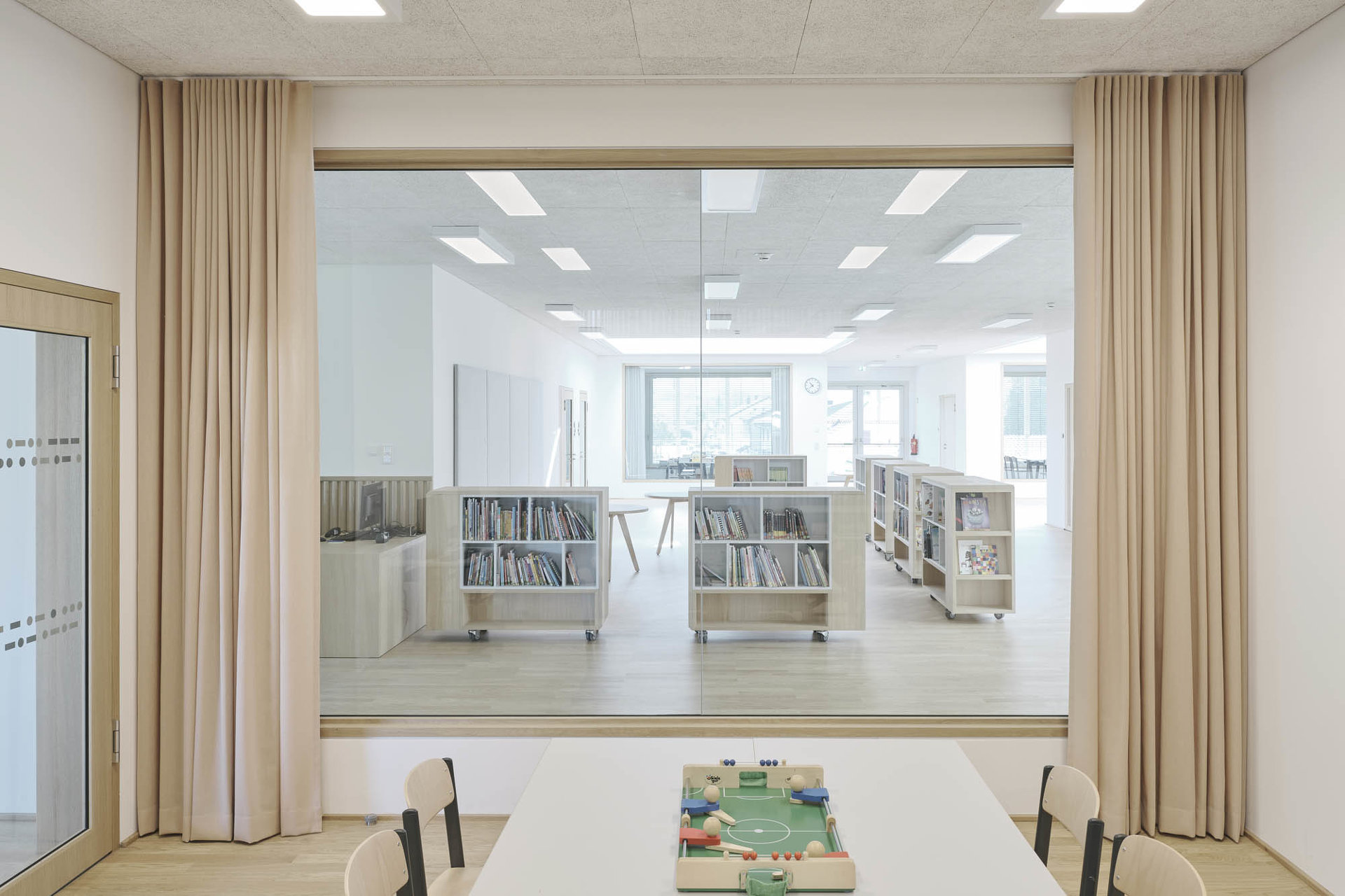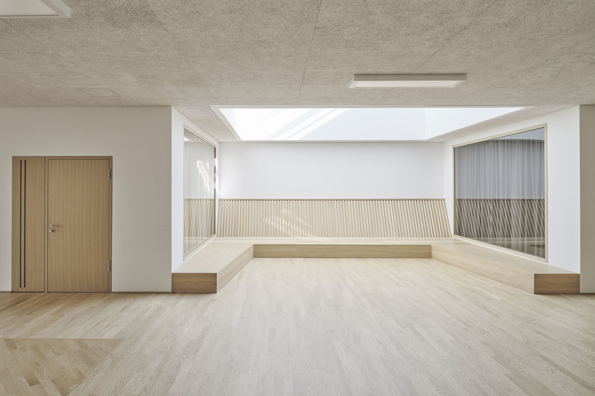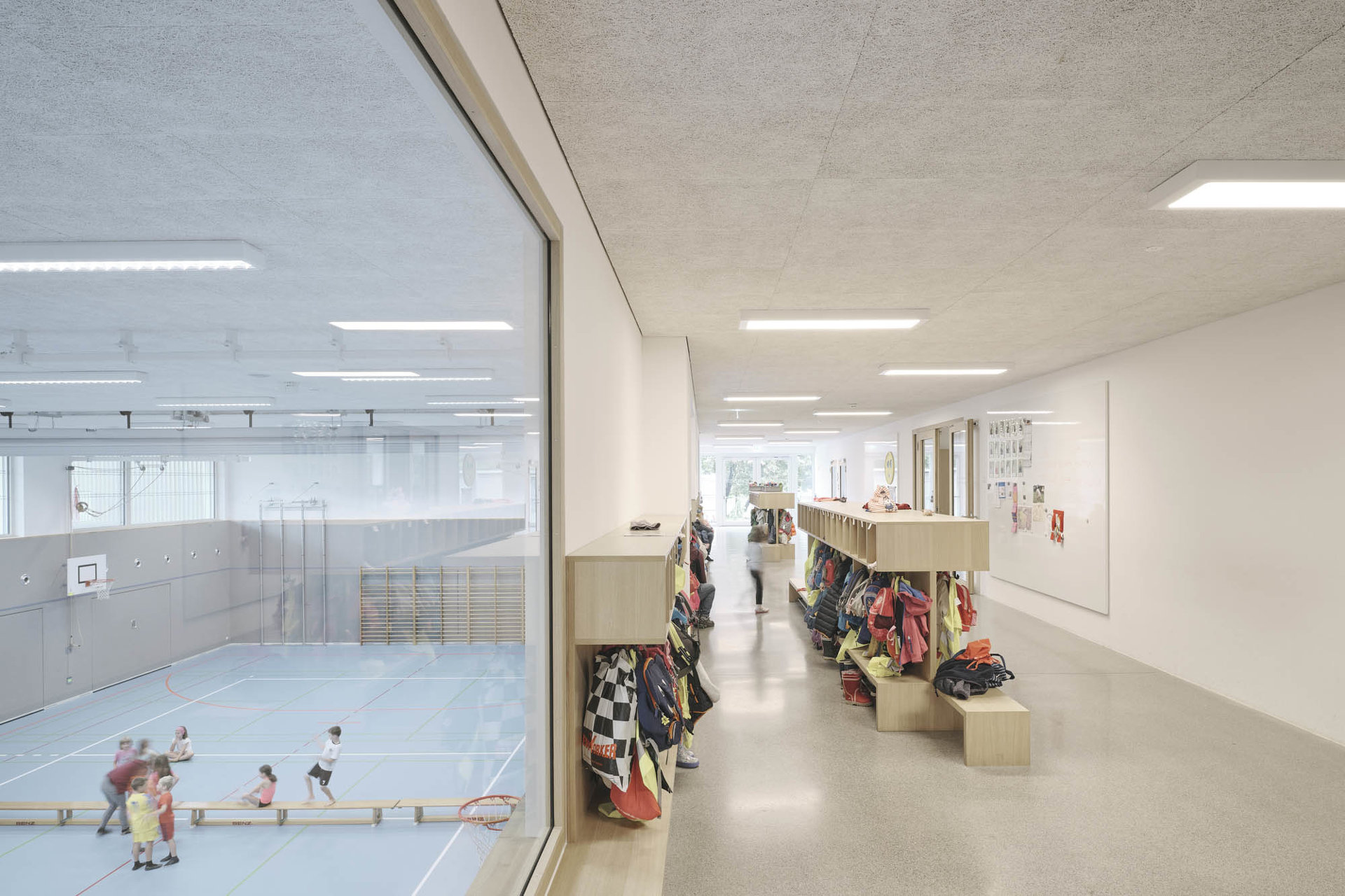 Die Schule ist ein detailreich orchestriertes Raumkontinuum mit intimen Rückzugsorten und kommunikativen Hofsituationen. Großzügige Oberlichten und Verglasungen erlauben spannende Sichtachsen, Licht- und Schattenspiele – frei nach Josef Frank: Die Schule als Weg und Platz. Behagliche Atmosphäre trifft auf lokale Handwerkskunst: Fensterrahmen, Parkett und hochwertig verarbeitete Möbel aus Eichenholz, dazu Deckenplatten aus Holzwolle für eine angenehme Akustik und eine gesunde Umgebung für die Kleinsten. Der Grundriss ist vertikal und horizontal verzahnt, um den Kindern im wahrsten Sinne des Wortes möglichst wenig Wände und Barrieren in den Weg zu stellen. Es gibt viele Freiflächen zum Toben, mobile Regale und Rollcontainer folgen den Kindern, wohin sie wollen – Vorhänge, gemütliche Kuschelecken und integrierte Sitzbänke laden zum Rasten oder zum Rückzug ein.