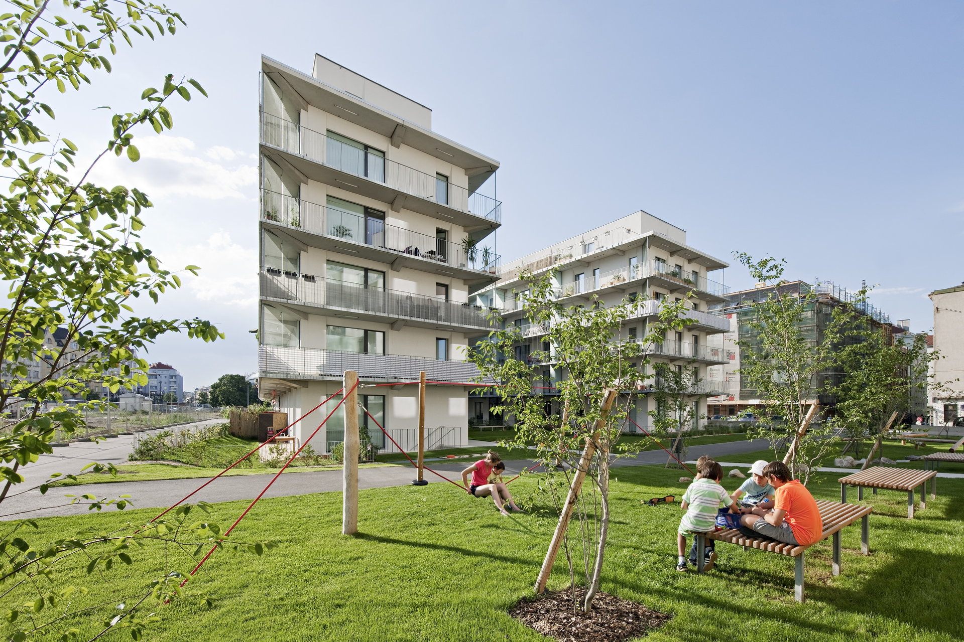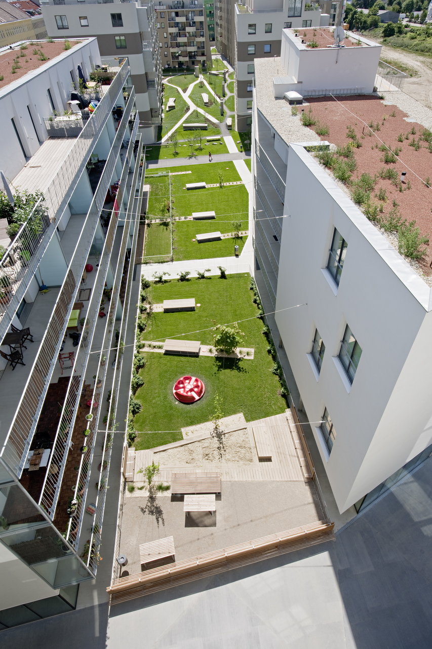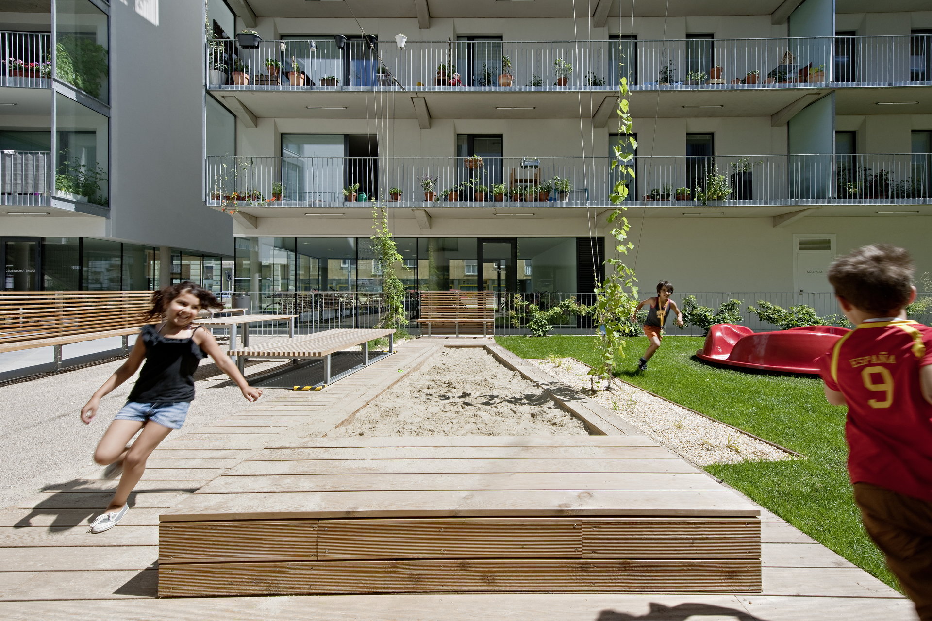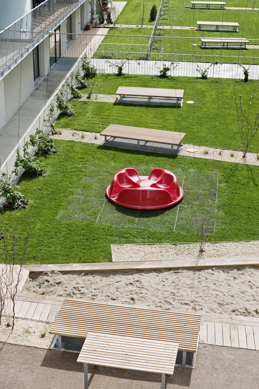 Im Hof spannen sich horizontale Kletterseile in rhythmischen Abständen zwischen den Bauteilen. Zu den horizontalen Seilen führen fächerartig vertikale Seile, an denen Kletterpflanzen emporranken. So entsteht ein üppiger grüner Hof, der die darunterliegende Tiefgarage nur vermuten lässt. Durch die lockere Anordnung dieser „Rankfächer“ entstehen interessante Durchblicke und Durchlässe, welche ebenso wie die lose verstreuten Sitz-und Liegeelemente als Spielmöglichkeiten, Treffpunkte oder Rückzugsorte dienen. Der Kleinkinderspielplatz ist mit Sandfläche, Spielelementen und Sitzmobiliar ausgestattet.