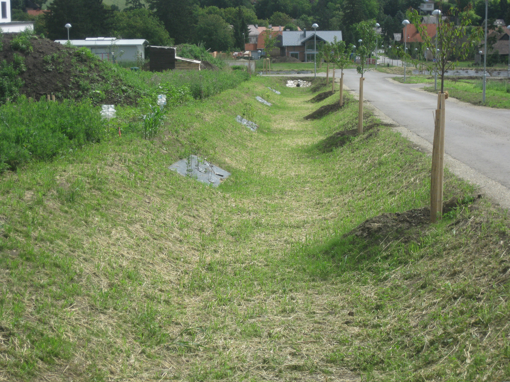 Im Netz der Erschließungsstraßen liegen in Falllinie Grünstreifen mit Entwässerungsmulden und in Schichtlinie grüne Anger, die als Retentionsmulden dienen. Bei gewöhnlichem Regen wird nur ein kleiner Teil der Grünflächen eingestaut, die überwiegende Fläche bleibt bespielbar, erst ein 100-jährlicher Niederschlag füllt die Mulden zur Gänze. Die Vereinigung von öffentlichen Grünflächen und Entwässerung zu einer grünen Infrastruktur bietet einen deutlich besseren Schutz für die Siedlung und die Unterlieger als ein konventioneller Regenwasserkanal.