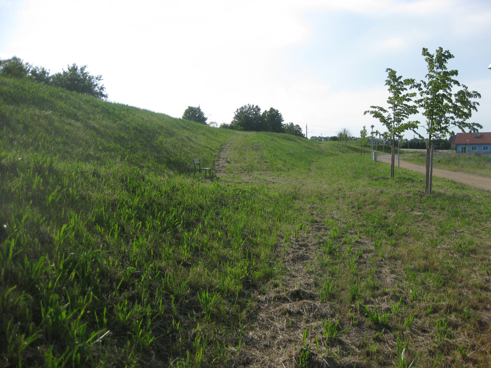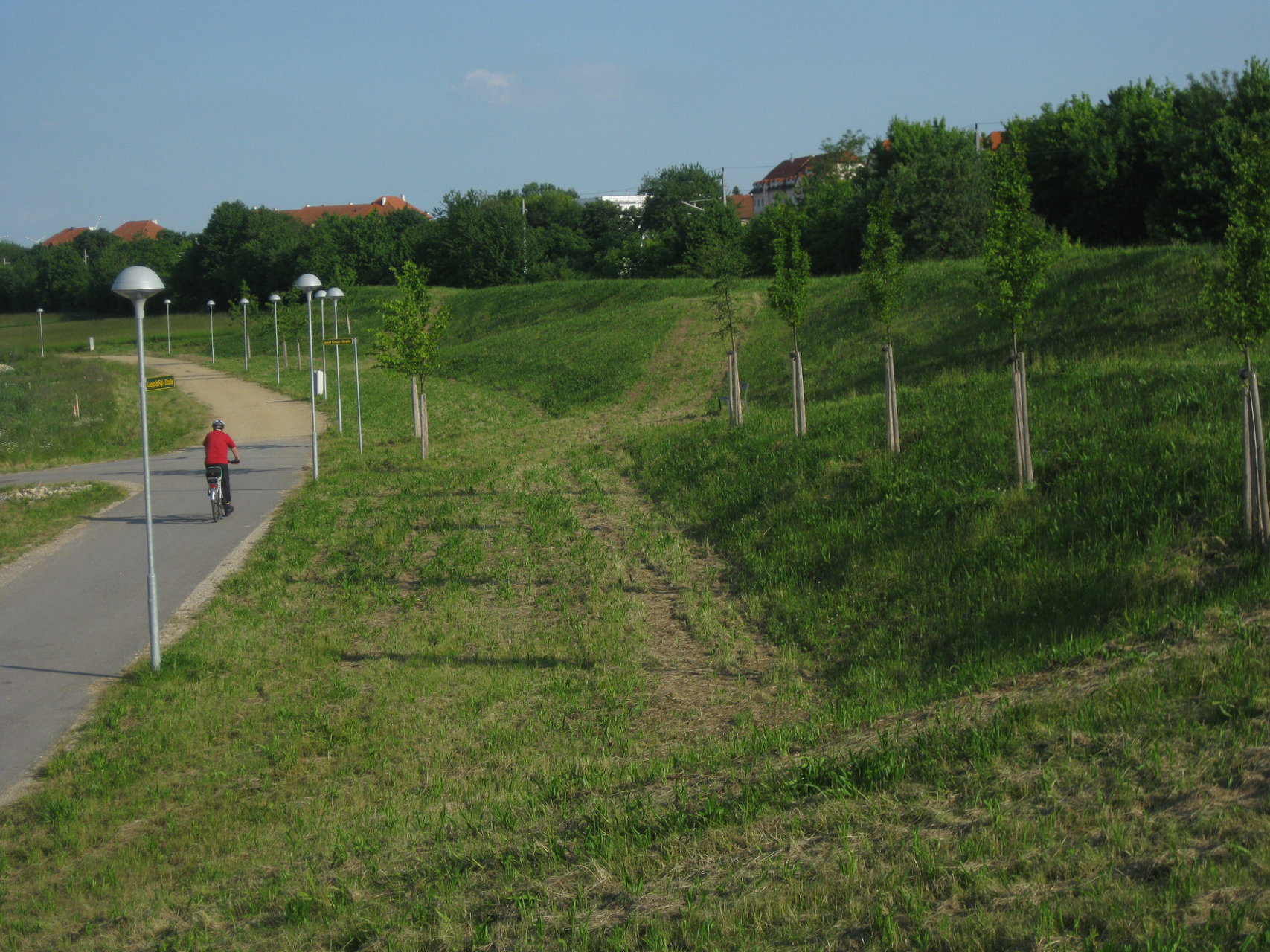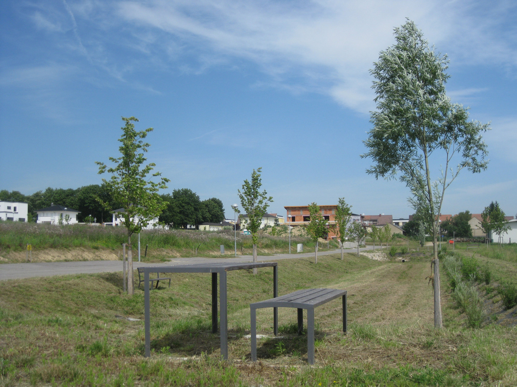 Im Rahmen des Bodenmanagements wurde der gesamte Bodenüberschuss aus Straßenbau und Entwässerung am Rande der Siedlung zu einem langgestreckten Erdkörper entlang der Bahn ausmodelliert, der die Funktionen Lärmschutz, Sichtschutz und wohnungs-nahe Erholung vereint.