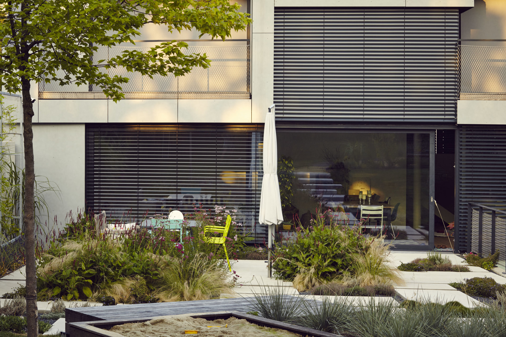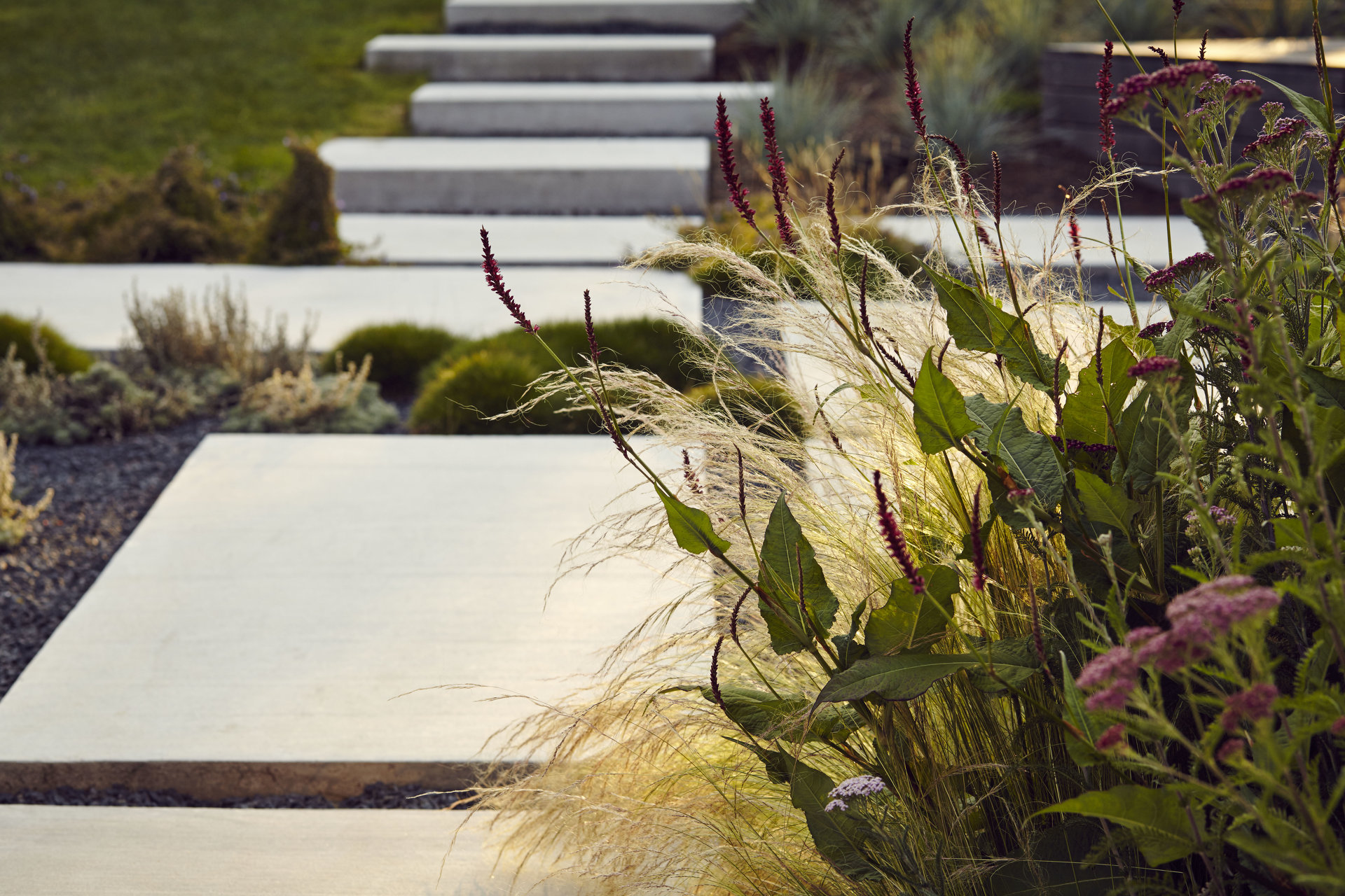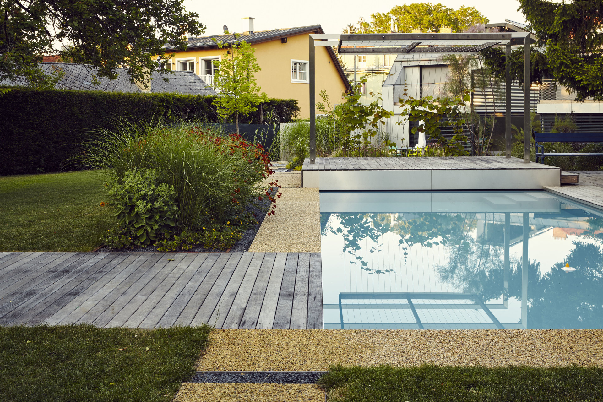 Der Garten auf diesem langen Grundstück in Wien–Mauer ist eine Art Adapter zwischen Architektur und Natur. Wie Eisschollen in einem Meer aus Schotter und Rasen treiben die rechteckigen „Teppiche“ und „Handtücher“ aus Holz, Beton und kunstharzgebundenem Kies im Garten. Dank Strukturierung ist es gelungen, den bestehenden Swimming-Pool in den neuen Entwurf übergangslos zu integrieren. Glockenblumen, Veilchen, Mädchenaugen, Goldkörbchen, Federgras und kleines Chinaschilf lockern das geometrische Bild wieder etwas auf. (Text: Wojciech Czaja)