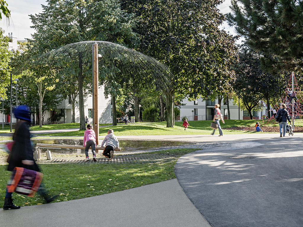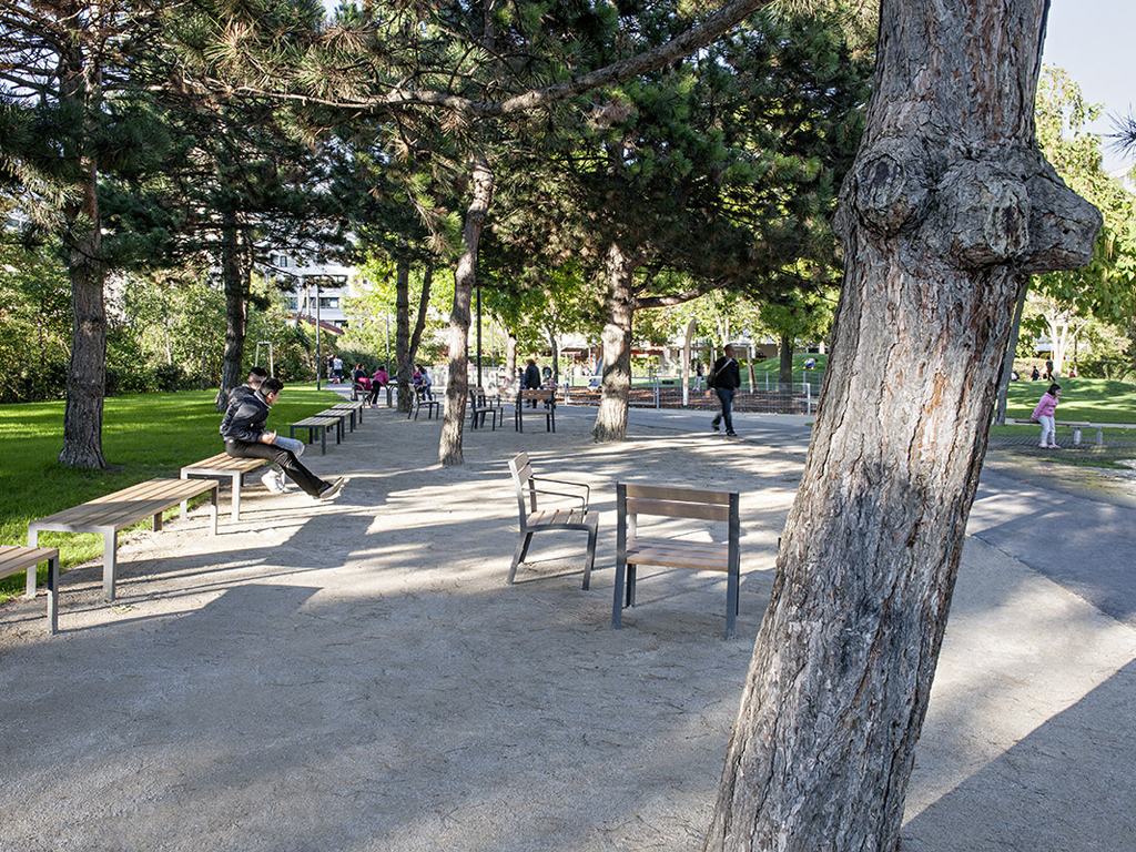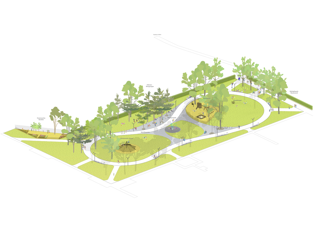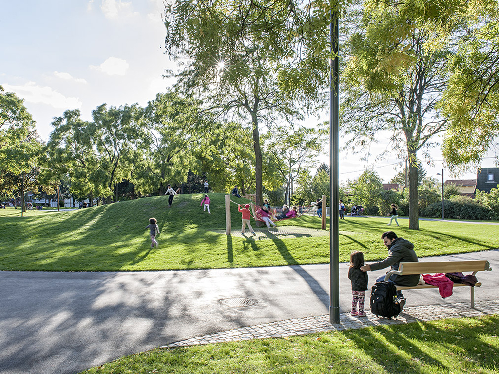 Der Hügelpark in der Wohnhausanlage Am Schöpfwerk ist in die Jahre gekommen und wurde nun auf Wunsch des Bezirks und auf Basis eines Bürgerbeteiligungsverfahrens revitalisiert. Die Wegeführung blieb zum Teil erhalten, wurde jedoch zu einer weichen Achter-Schleife mit neuen Querungsmöglichkeiten ausgebaut. Unterschiedliche Bodenbeläge und Spielplatzgestaltungen machen den Park vielfältig nutzbar und für Jung und Alt attraktiv. Die Freiraummöblierung wurde erneuert, die Baumbepflanzung um Zieräpfel und rosa blühende Tamarisken erweitert.