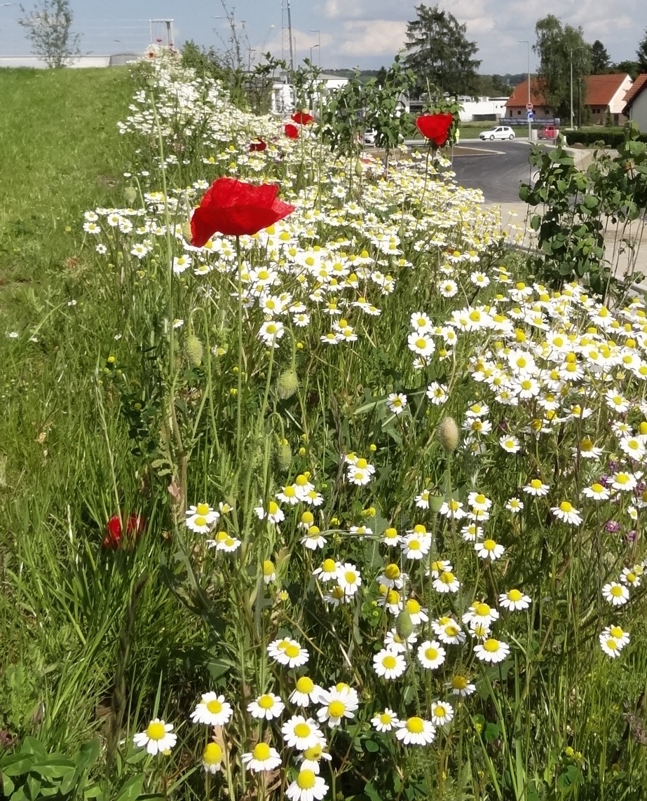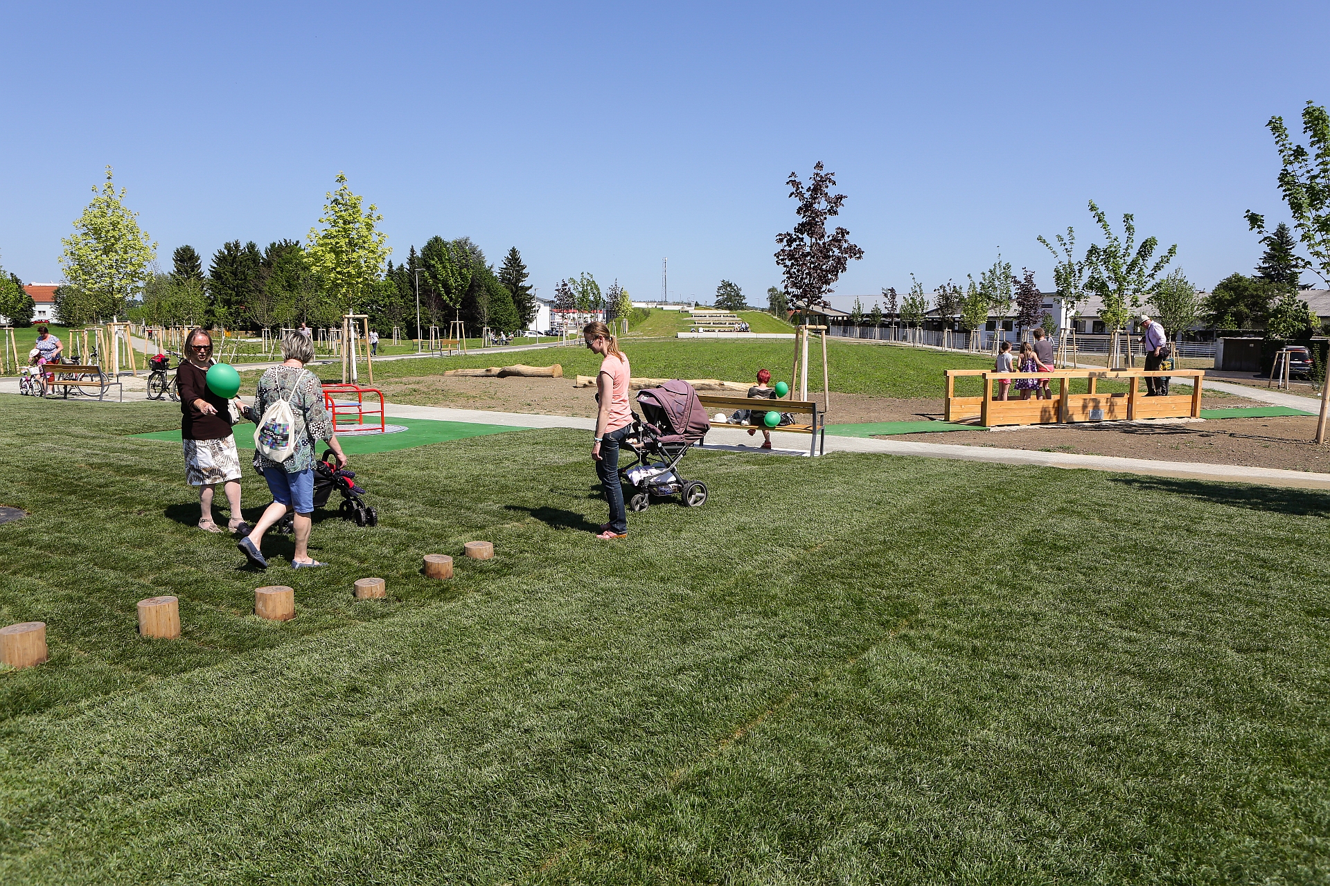 Der Hauptweg verläuft abseits des Siedlungsverkehrs, Bänke laden hier zum Verweilen ein. Nicht befestigte Fußpfade führen durch extensiv gepflegte Blumenwiesen zu Holzdecks, die wie Inseln aus den Naturflächen ragen und qualitätsvolle Rückzugsräume und Ruheplätze bilden.