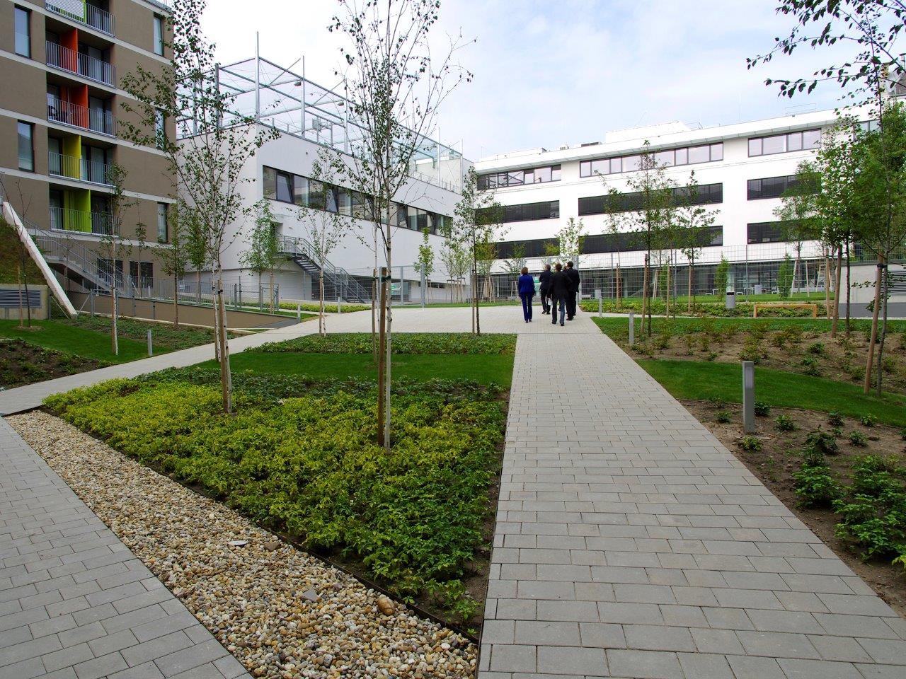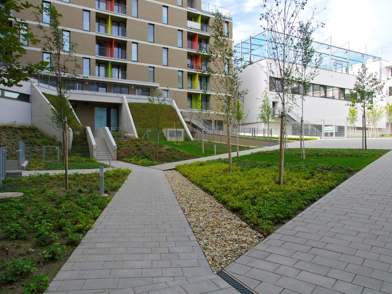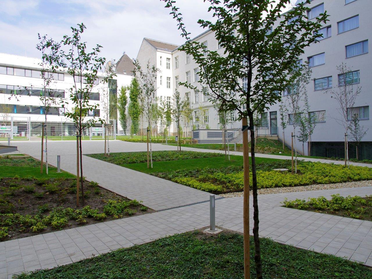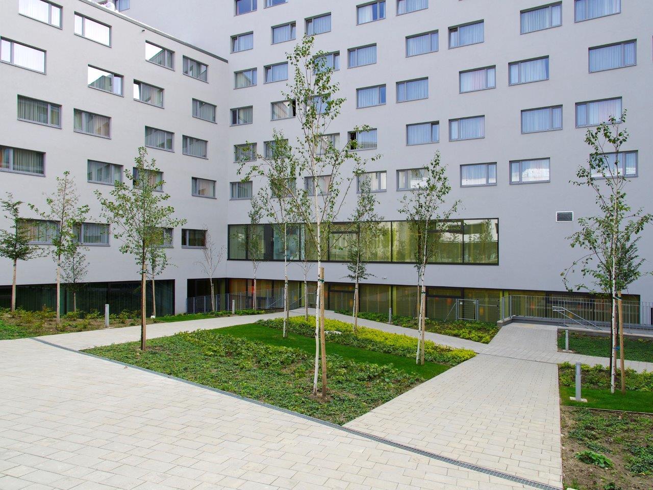 Die Terrasse des Studentenheims liegt im 1.OG. Die notwendigen Fluchtwege und Fluchtstiegen münden aus dem 1.UG und dem EG und durchziehen das terrassierte Gelände. Eine Sammlung von Bäumen, im Raster gepflanzt und aufgelockert, bildet ein dichtes Blätterdach. Es ist ein lebendiges Volumen, das den Hofraum konstituiert und für den Betrachter erfahrbar macht, wobei je nach Standort unterschiedliche Aspekte sichtbar werden. Ob im Garten stehend, aus dem Hotelzimmer oder vom Studentenheim blickend, es ergibt sich immer ein anderes Bild. Die Stämme, Kronen oder das hainartige Blätterdach sind jeweils nur als Ausschnitte wahrnehmbar.