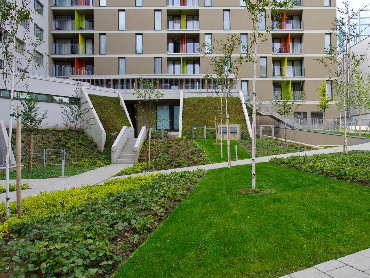 Ein in Streifen strukturierter Teppich unterstreicht den waldigen Charakter. Waldgeißbart (Aruncus dioicus), Elfenblume (Epimedium grandiflorum), Schneerose (Helleborus niger) und Efeu (Herdera helix) halten dem Schatten stand. Sie verbinden die diversen Niveaus und durchziehen abwechselnd mit Rasenstreifen den Hofraum. Der Pflanzteppich wird durchschnitten von den notwendigen Fluchtwegen, die mit einem winterfesten Belag ausgebildet sind. Im Bereich dieser Wege ist auch der informelle Aufenthalt möglich, die primäre Erfahrung des Hofraumes passiert jedoch über die Terrassen und die Blickbeziehungen vom Fenster. Aus dem Zimmer blickend zeigt sich der Wechsel der Jahreszeiten im Blattgrün der Bäume. (Text: Anna Detzlhofer)