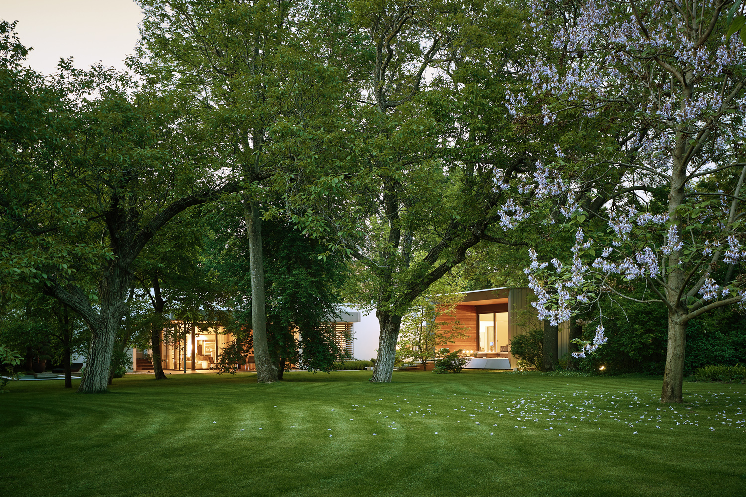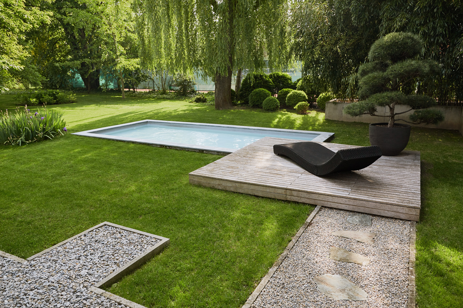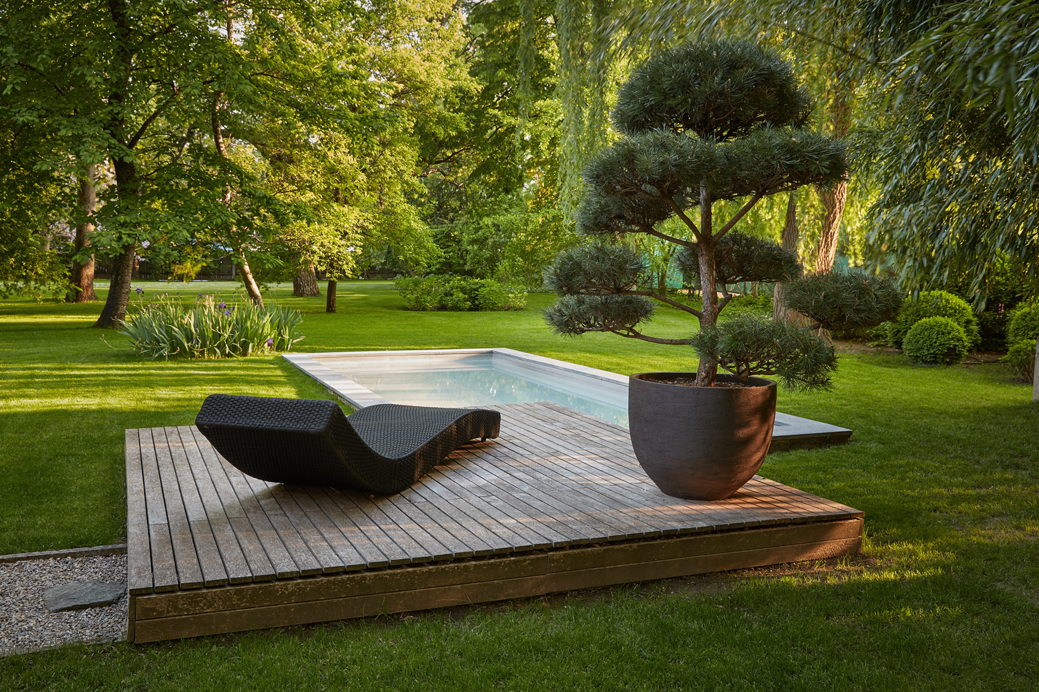 Der rückseitige Gartenbereich wird vom Altbaumbestand, neu gepflanzten Solitärgehölzen wie Blauglocken- und Tulpenbaum, der großzügigen Rasenfläche sowie der Wasserfläche geprägt.