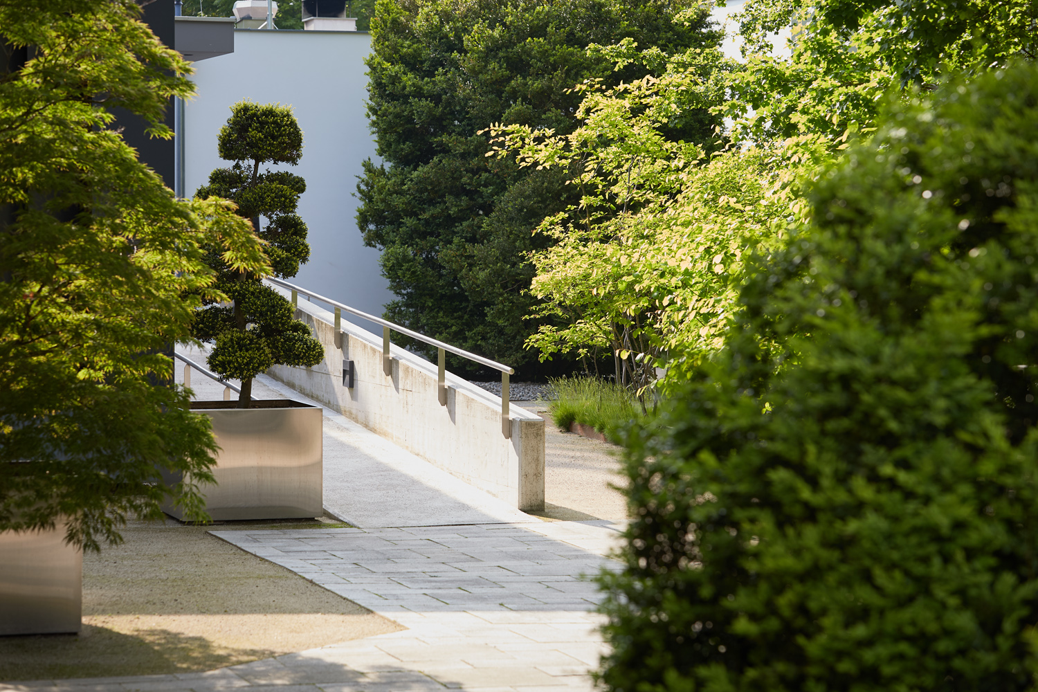Der Eingangsbereich ist durch klare Formen und Materialien sowie eine zurückhaltende, aber akzentuierende Bepflanzungen charakterisiert.