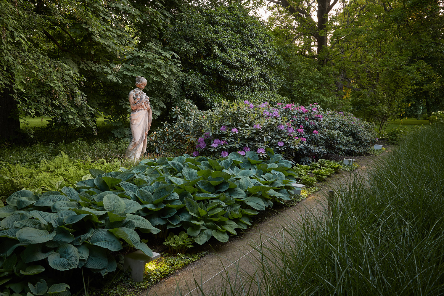 Im Nahbereich des Zubaus schaffen Rhododendren, Schattenstauden und Altbäume in Kombination mit einer Steinskulptur eine besondere Atmosphäre, alles wirkt, als wäre es schon immer so gewesen.