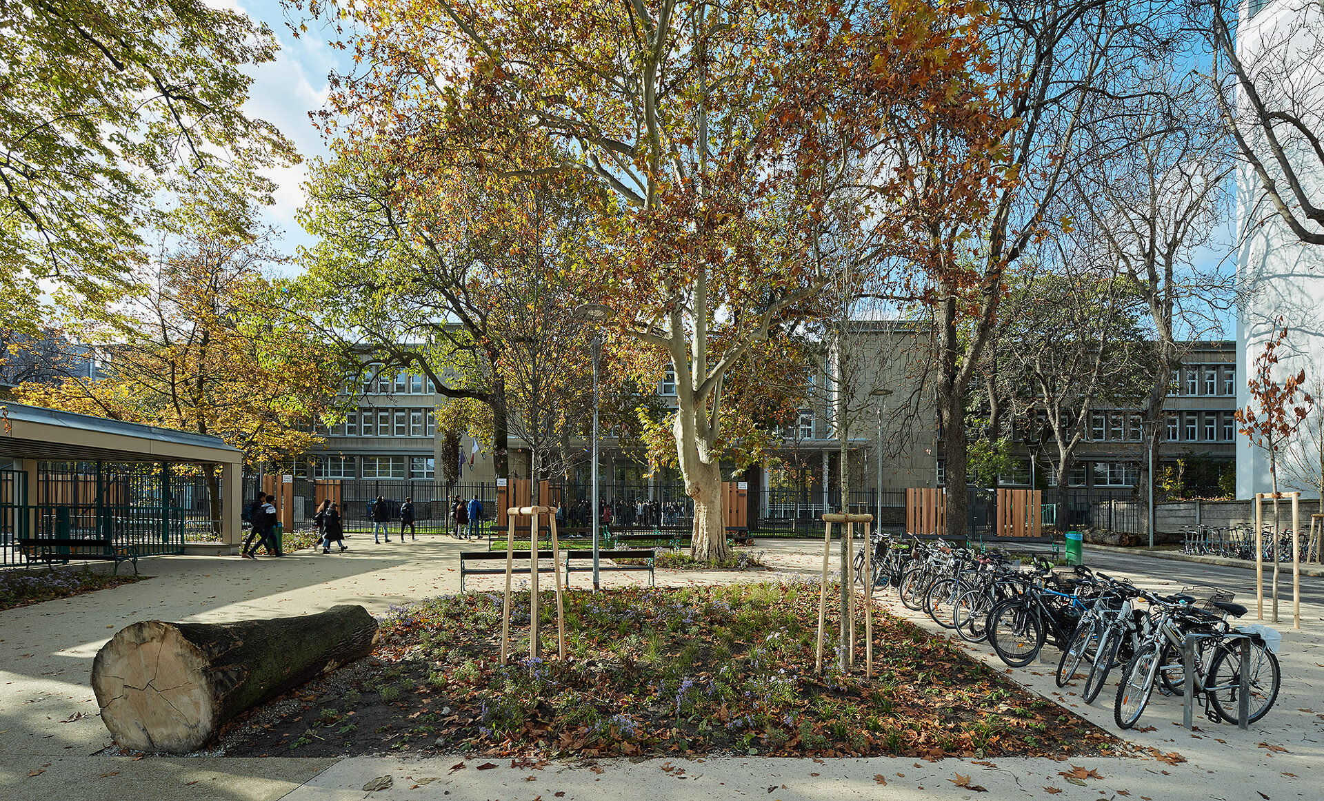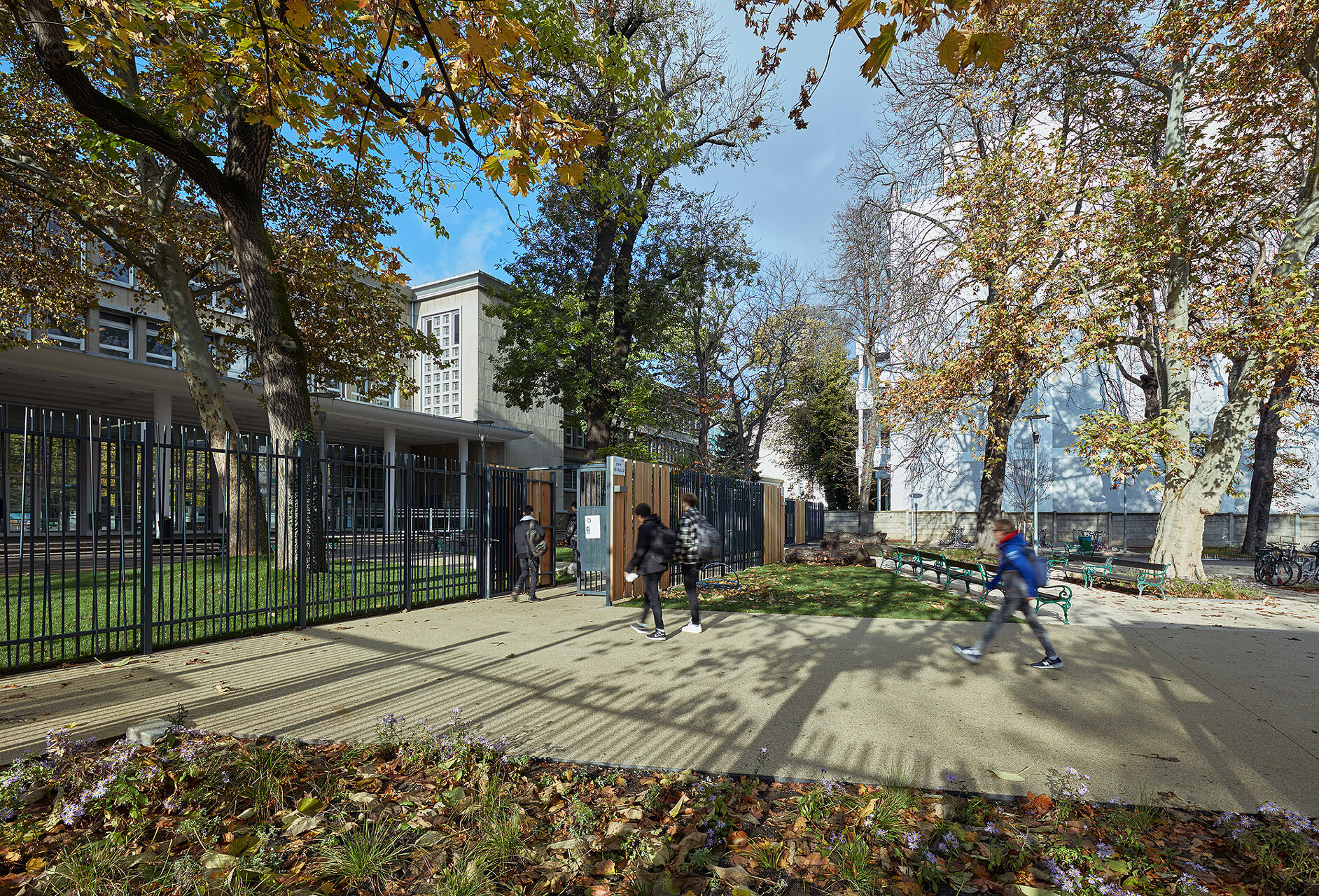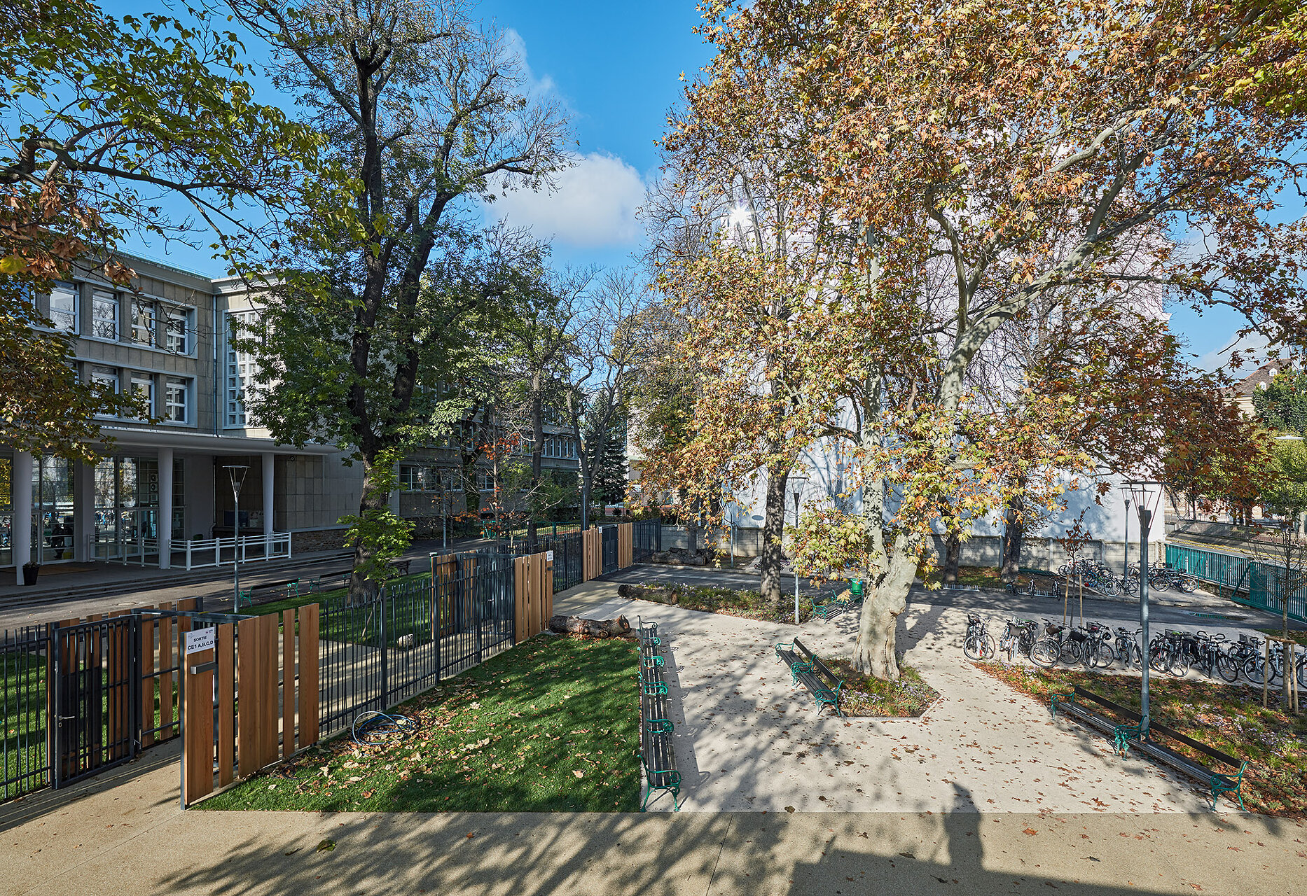 Darüber erstreckt sich ein Weg aus beige und quarzfarbigem Terraway, der wunderbar mit dem Fassadenstil der Schule harmoniert. Rechts und links davon erstrecken sich zwei grüne Rollrasenflächen. Im Osten sind die modern angelegten Fahrradabstellplätze und Scooter Parkplätze auf einer wassergebundenen Decke situiert.