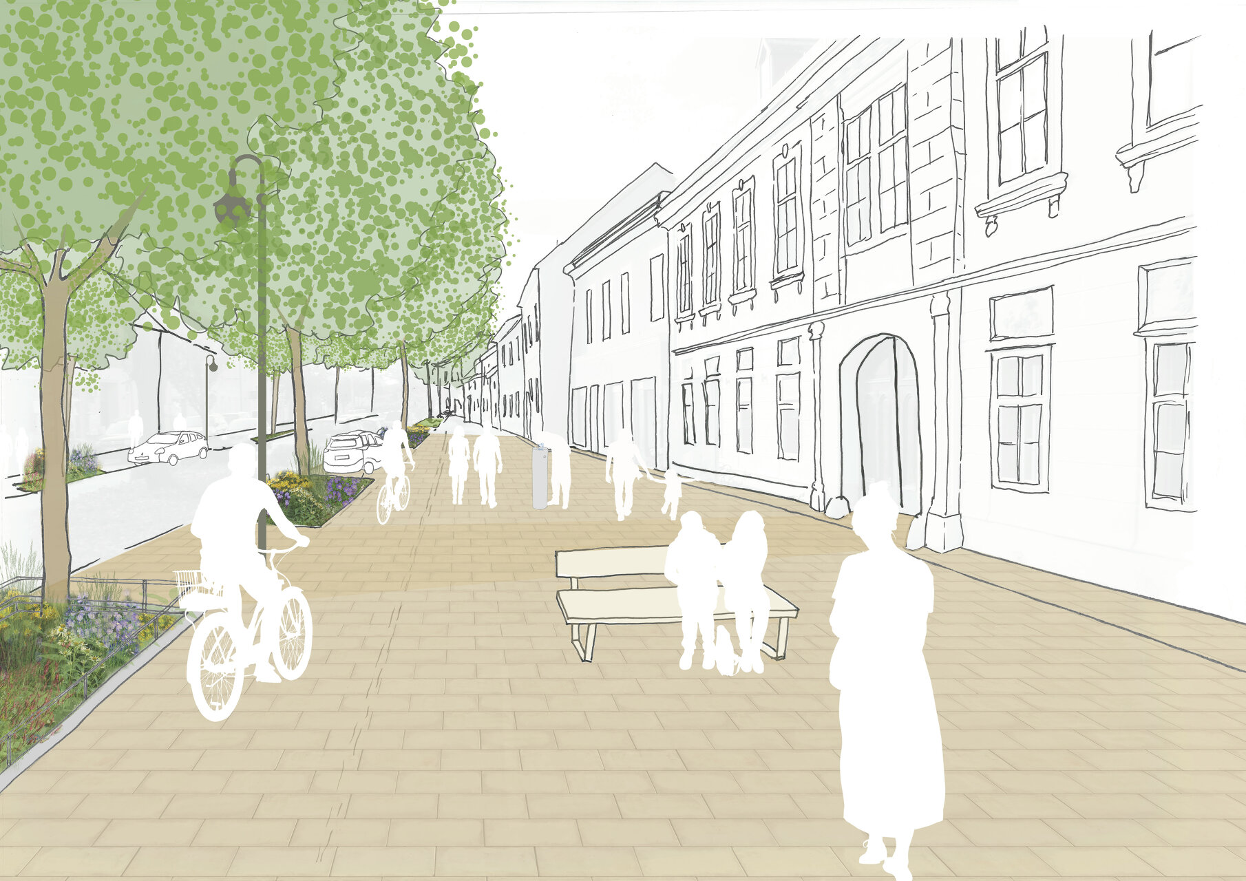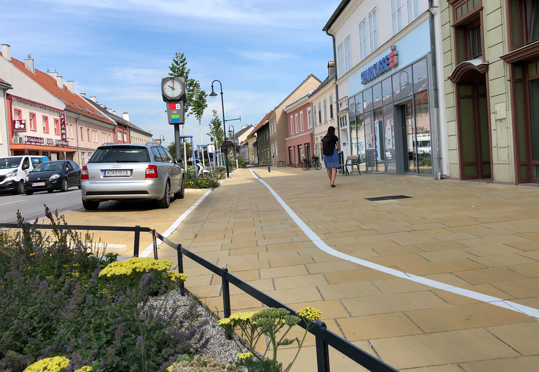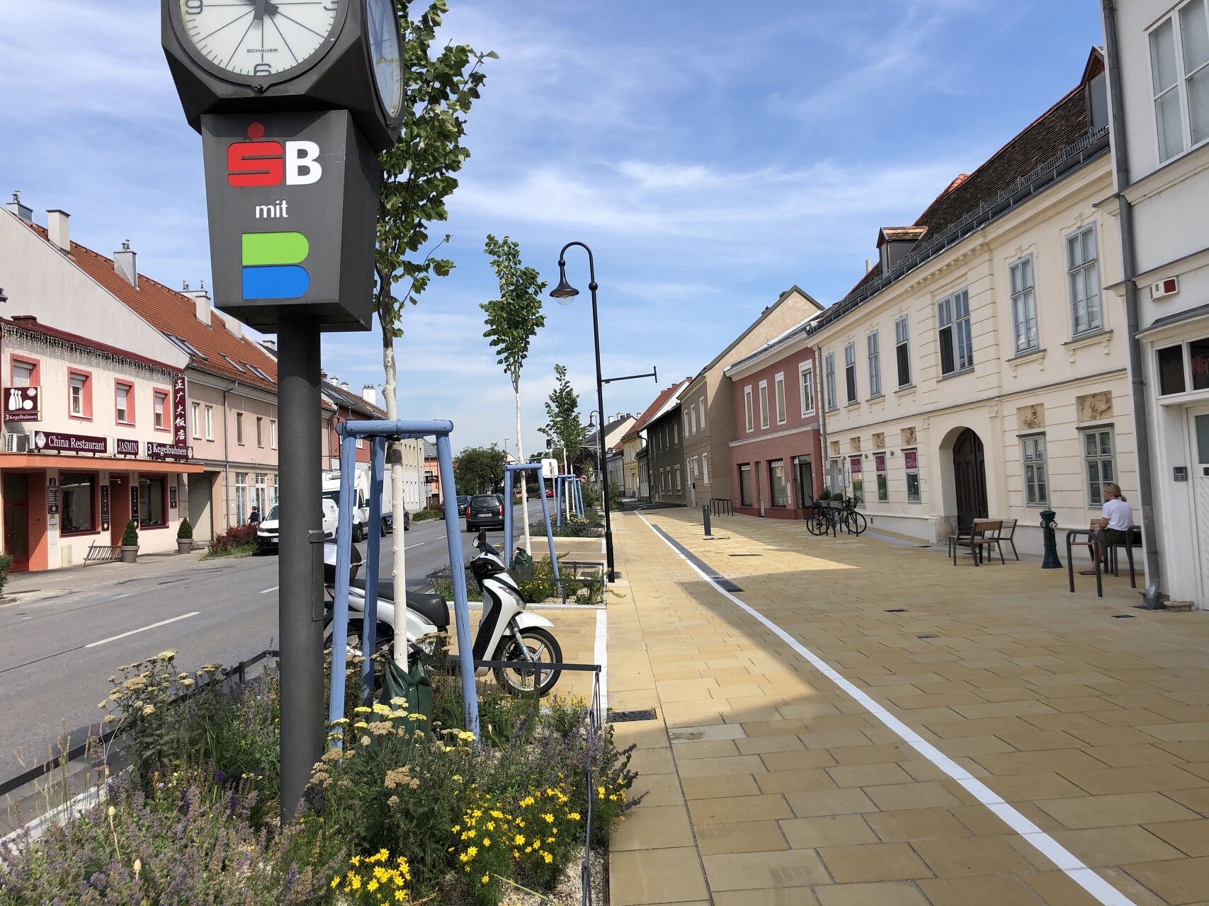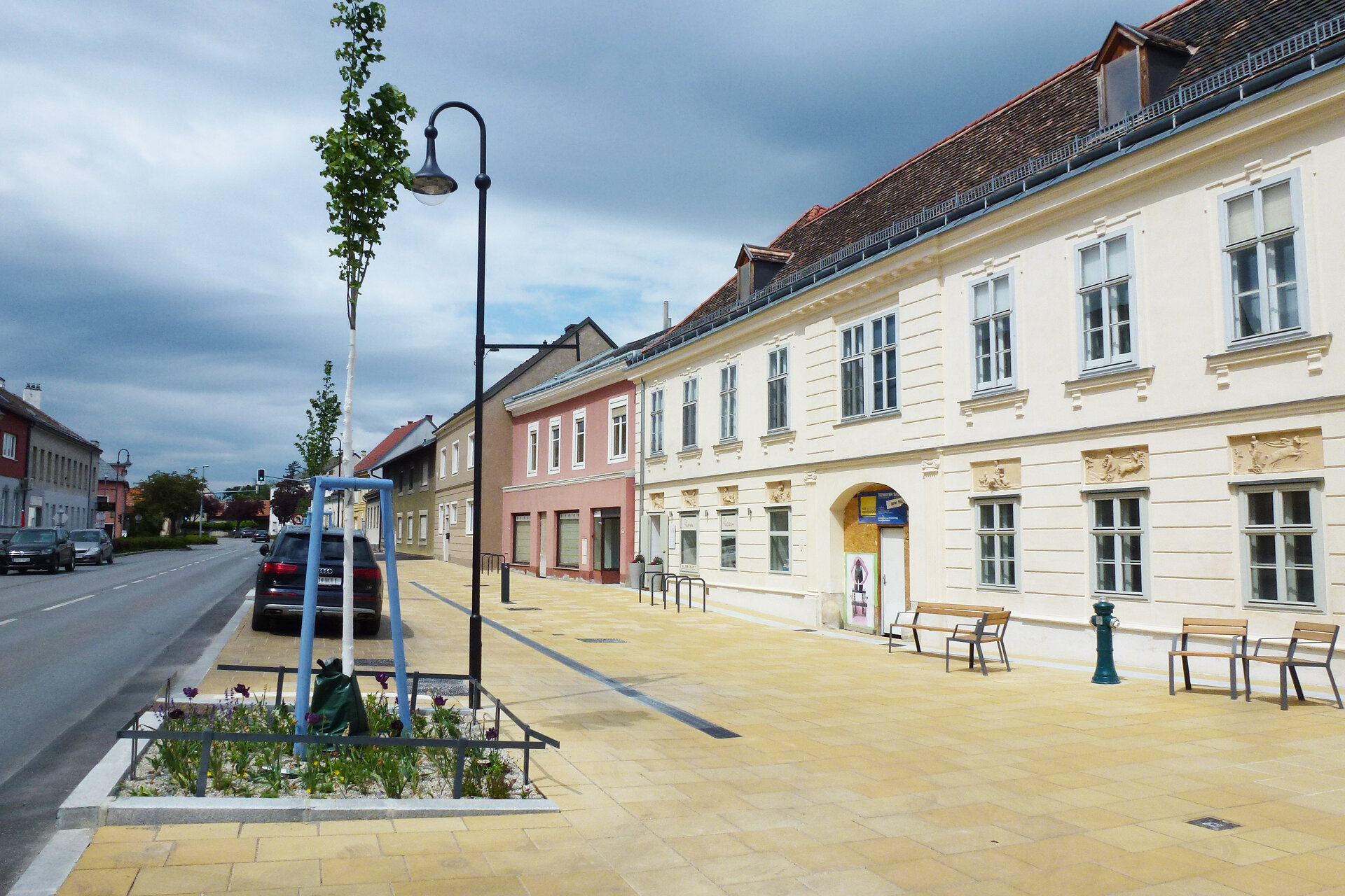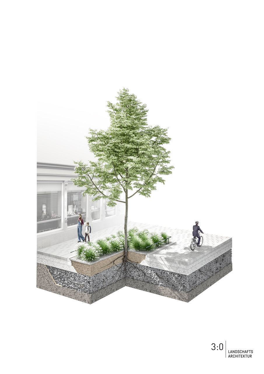 Die Bäume sind von großer Bedeutung für das Projekt, da sie künftig Schatten spenden und für ein verbessertes, angenehmeres Mikroklima sorgen sollen und somit den Aufenthalt auch an einem heißen Sommertag ermöglichen. Damit den Bäumen die Möglichkeit zur besseren Entwicklung geboten wird und künftig als Schattenspender dienen zu können, benötigen sie einen ausgeweiteten Wurzelraum der genügend Porenvolumen für Luft und Wasser aufweist. Dies soll ihnen durch einen entsprechenden überbaubaren Untergrund zur Verfügung stehen. Als Faustformel gilt pro m² Kronenüberschirmung durch Bäume benötigt der Baum einen m³ durchwurzelbaren Untergrund. (Text: Architekten)
