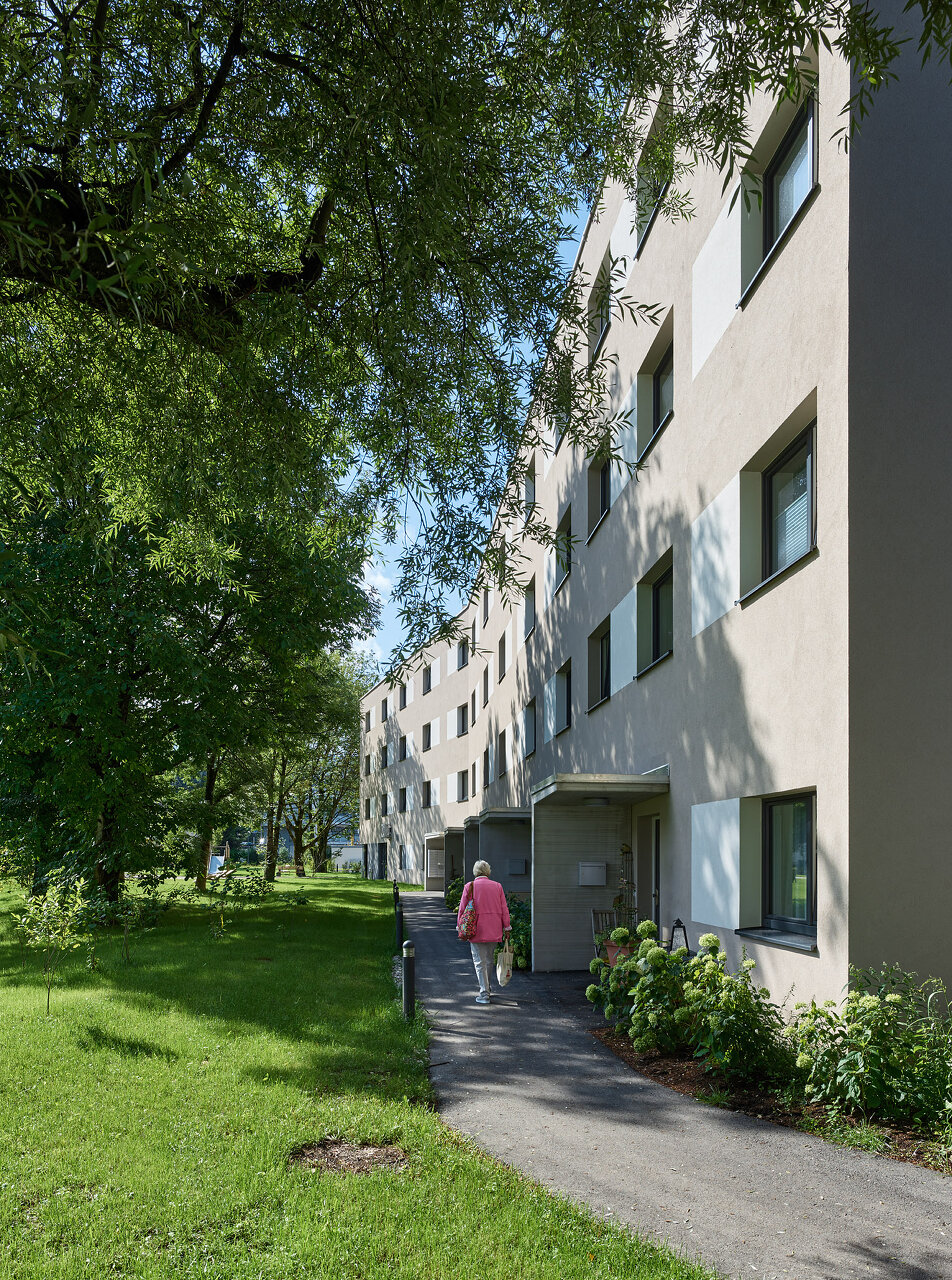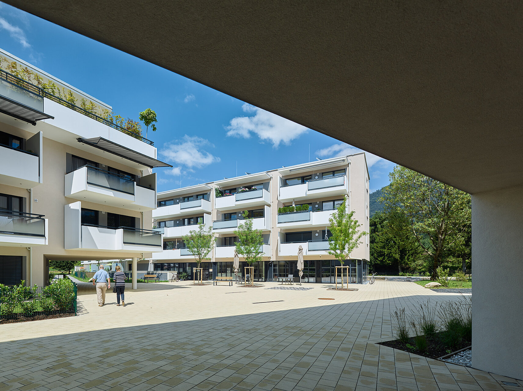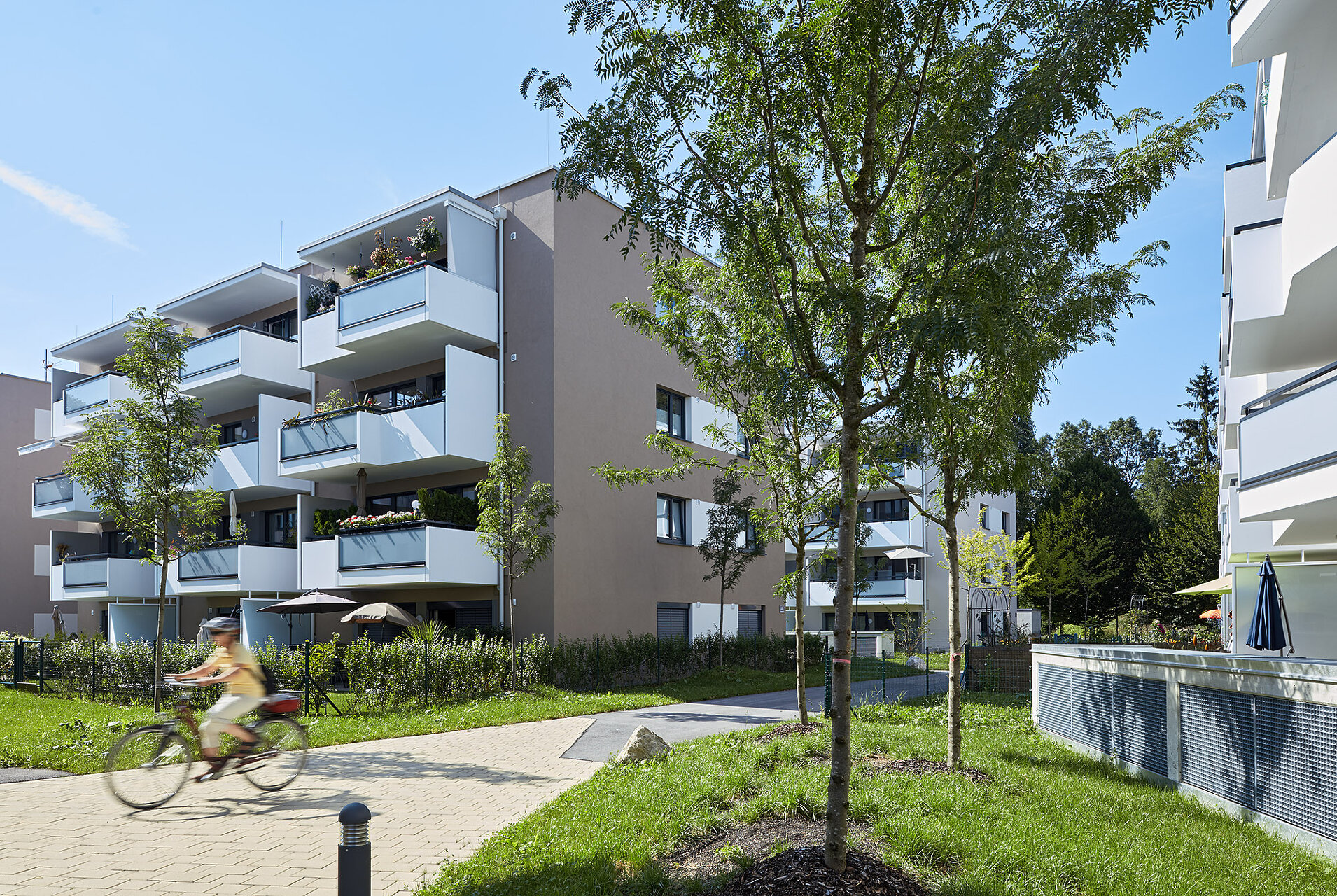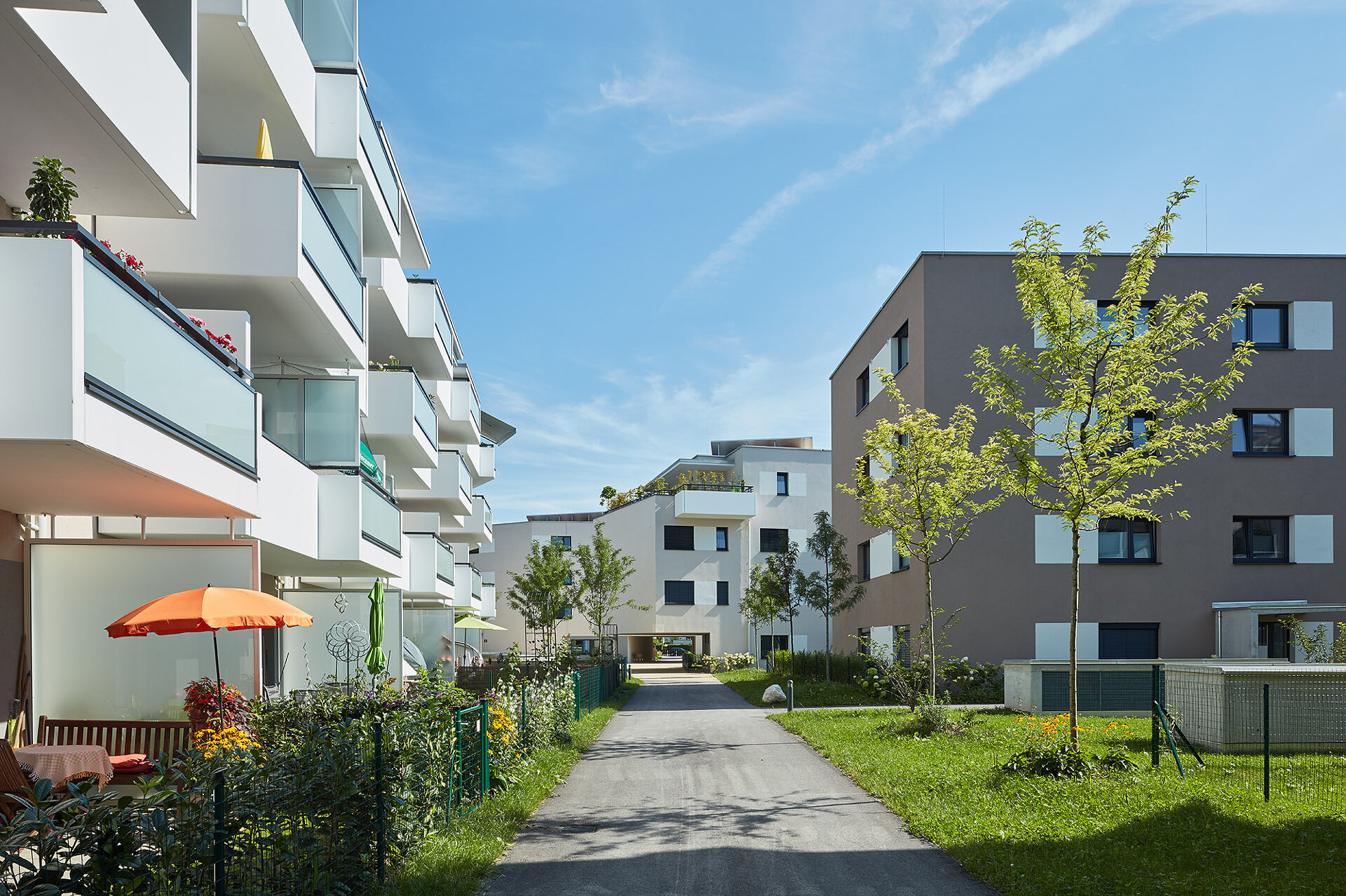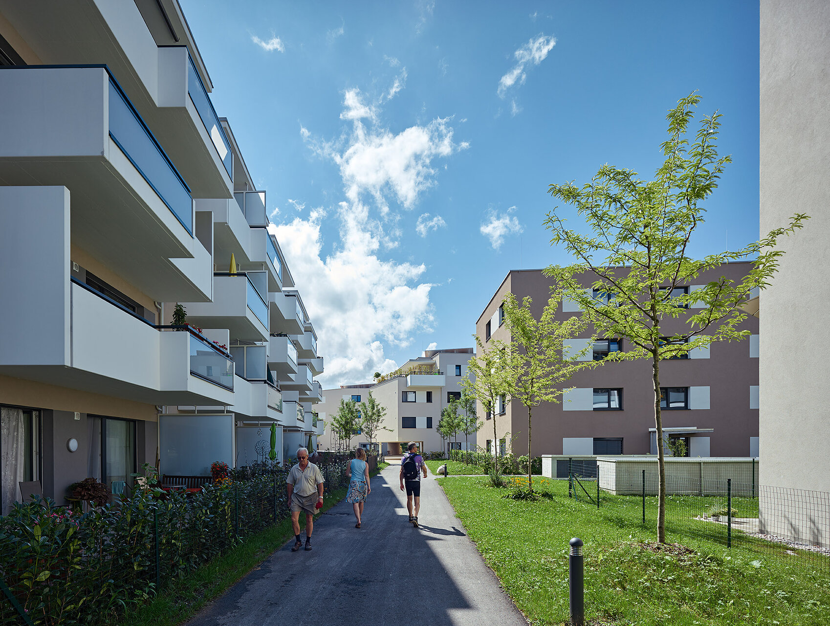 Die Haupterschließung wird durch lockerkronige, gelblaubige Lederhülsenbäume gesäumt, die den Weg als zentrale Achse betonen. Dieses grüne Rückgrat erschließt alle drei Höfe und die Zugänge der Wohnhäuser. Sie vereint die Funktionen Erschließung, Aufenthalt, Begegnung und Spiel.