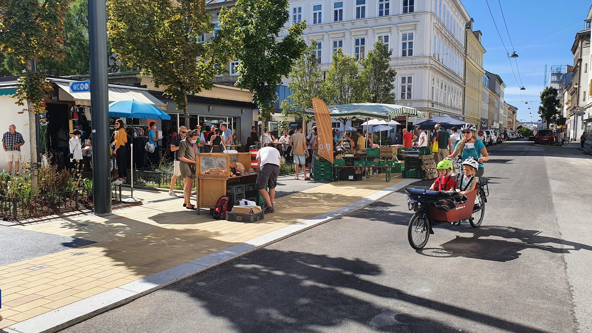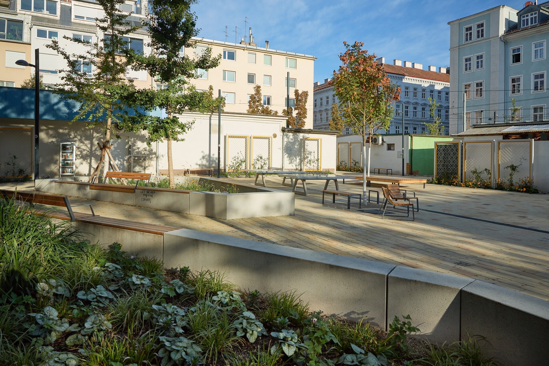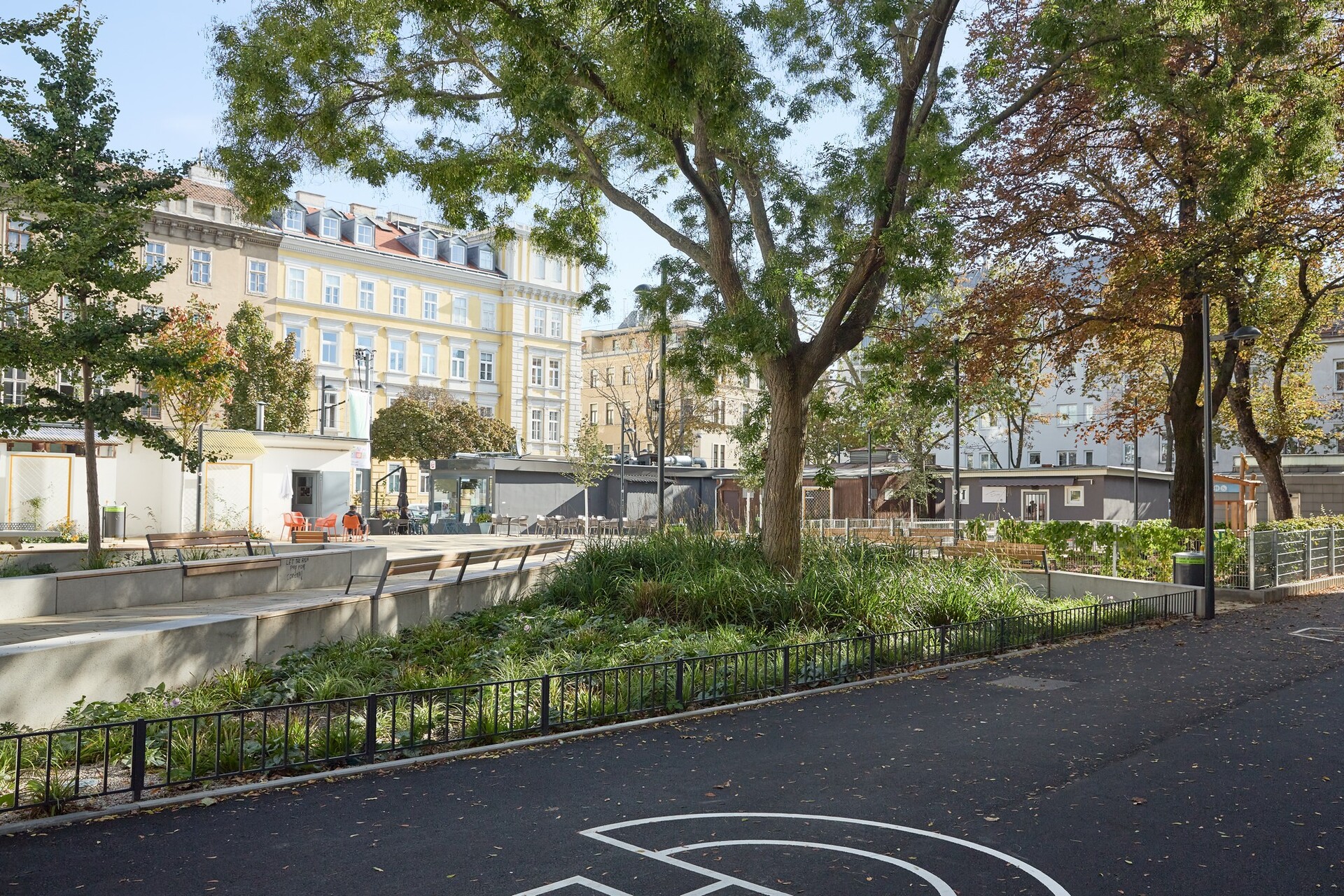Das Planungsgebiet umfasste den inneren Platz, umrahmt von Zeilen fixer Marktstände, die äußeren Gehsteigzonen und ein Straßenareal für einen Wochenmarkt. Der zentrale Platzbereich wurde von störenden Bauobjekten befreit, mit Sitzgelegenheiten ausgestattet und nutzungsoffen konzipiert. Er wurde mit hellen Betonsteinen gestaltet. Zwölf neue Bäume, davon 6 im Schwammstadtprinzip für Stadtbäume, wurden gepflanzt sowie neue Sitzgelegenheiten und Spielangebote, Gehsteigzonen für Gastgärten und für einen Straßenmarkt, ein Wasserspiel mit Bodenfontänen und Nebeldüsen, Beete für „Urban Gardening“ im Straßenraum geschaffen. Beim Schwammstadtprinzip wird unterhalb der befestigten Oberfläche eine Schicht aus grobkörnigem Schotter und feineren, wasserspeichernden Materialien angelegt. Die Bäume können diese Schicht durchwurzeln. Regenwasser und überschüssiges Wasser (z.B. vom Wasserspiel) werden in die Schotterschicht geleitet und hier gespeichert. Den Bäumen stehen somit mehr Wurzelraum und eine ausreichende Menge Wasser über einen längeren Zeitraum zur Verfügung.