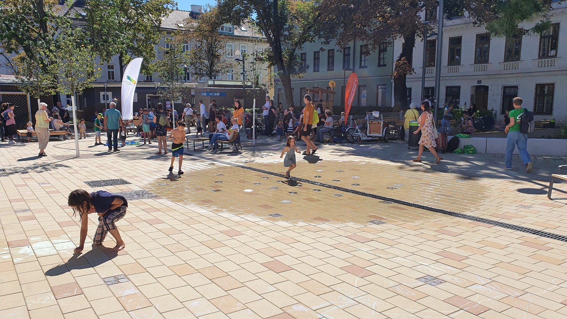 Durch das Verlegen von WC-Anlage und der Altstoffsammelstelle wurde die Freifläche in der Mitte des Platzes aufgeweitet. An drei Seiten wird sie von den Marktständen eingefasst. An einer Seite begrenzen ein eingezäunter, mit Kletterpflanzen begrünter, Kinderspielplatz und ein Fußgängerbereich mit aufgemalten Hüpfspielen den Platz. Staudenbeete an den Rückseiten der Marktstände werden von den Marktstandlern betreut. Die Baumscheiben wurden mit Podesten ergänzt und laden zum Verweilen ein. (Text: Landschaftsarchitekt)