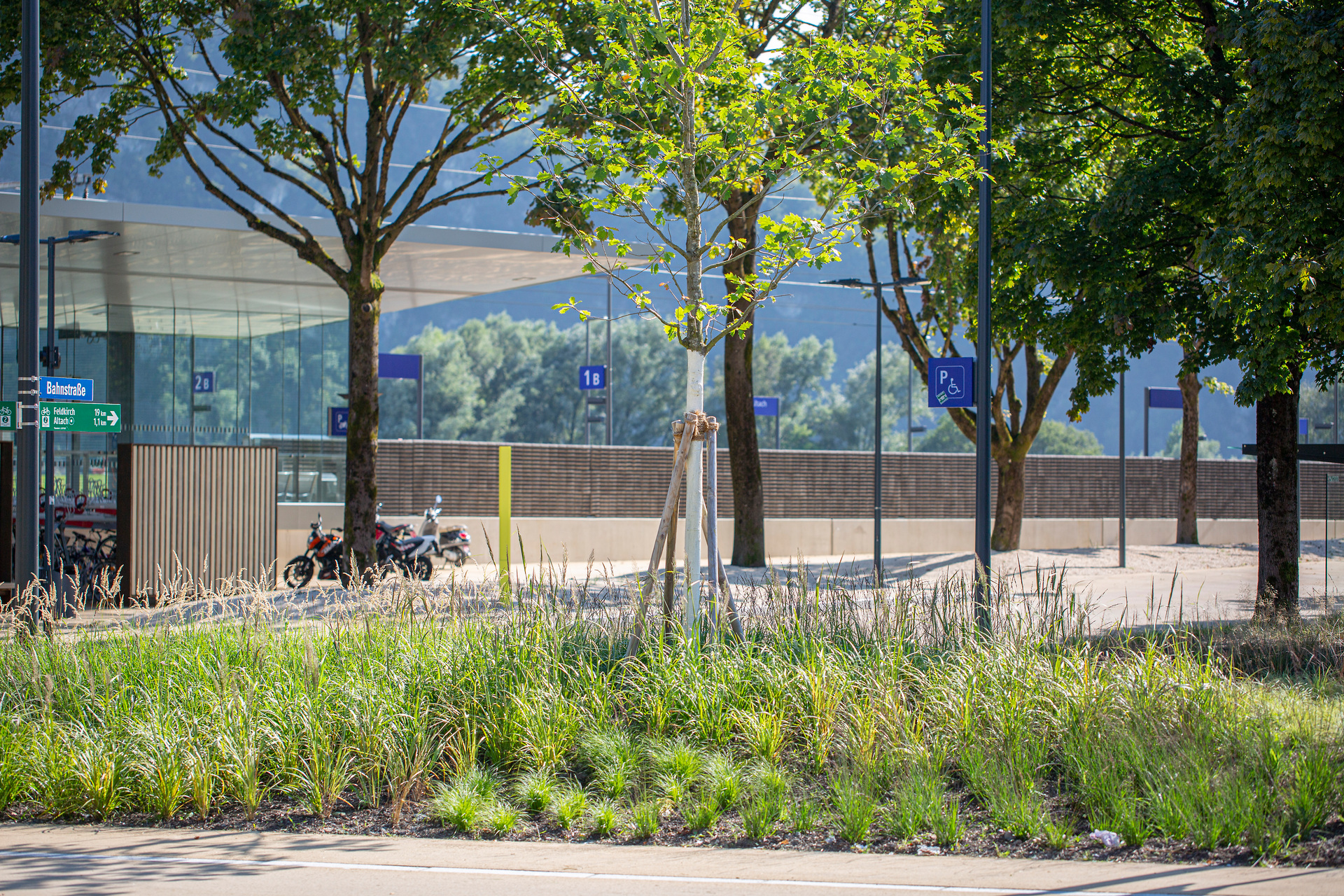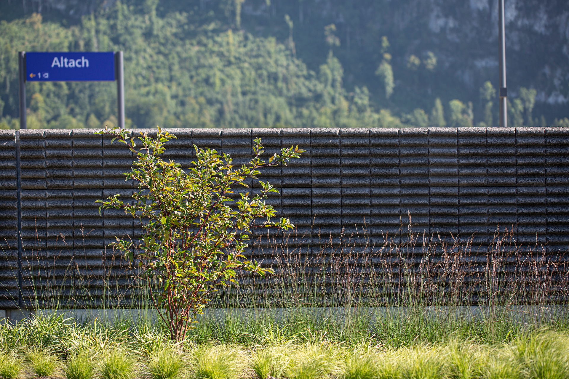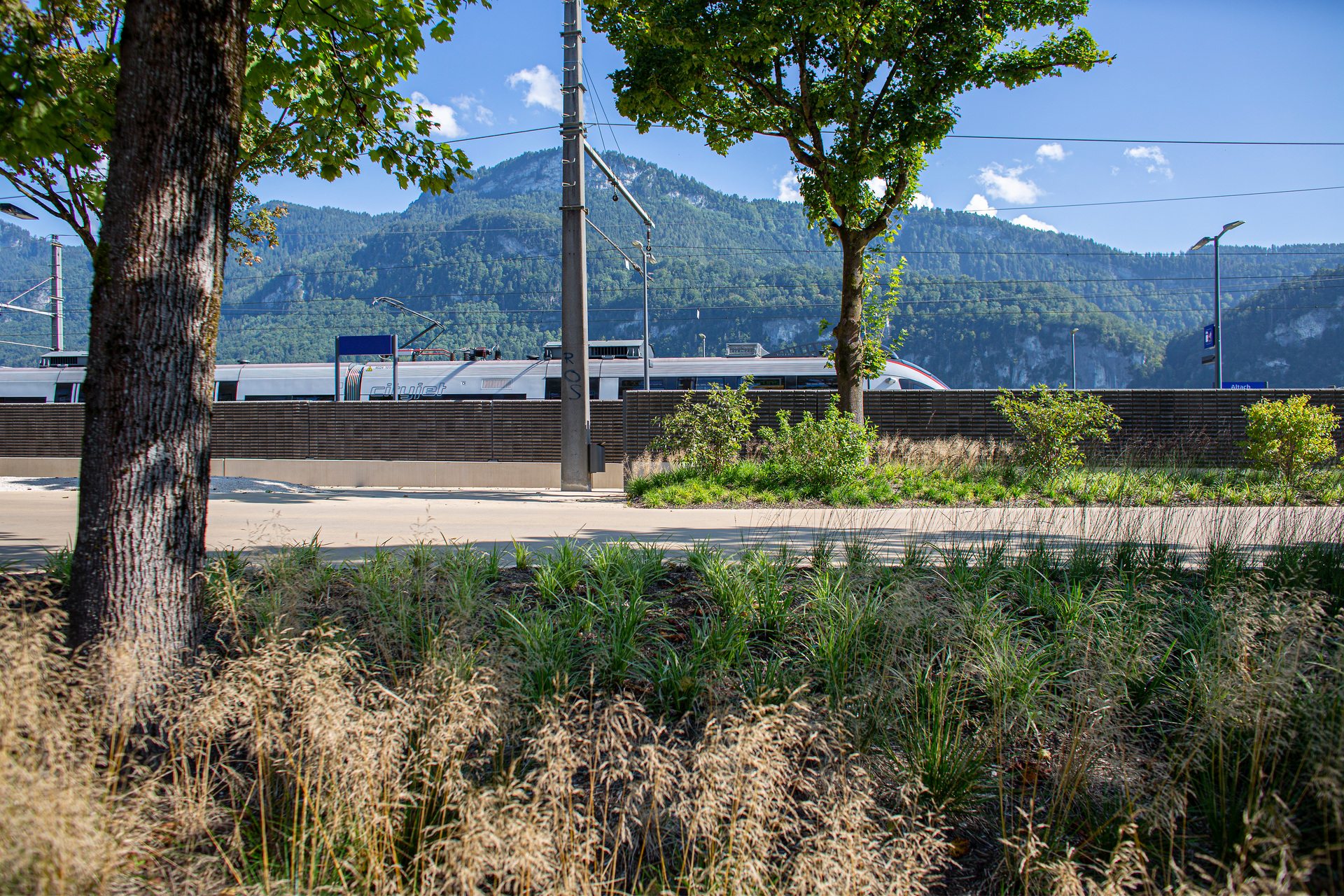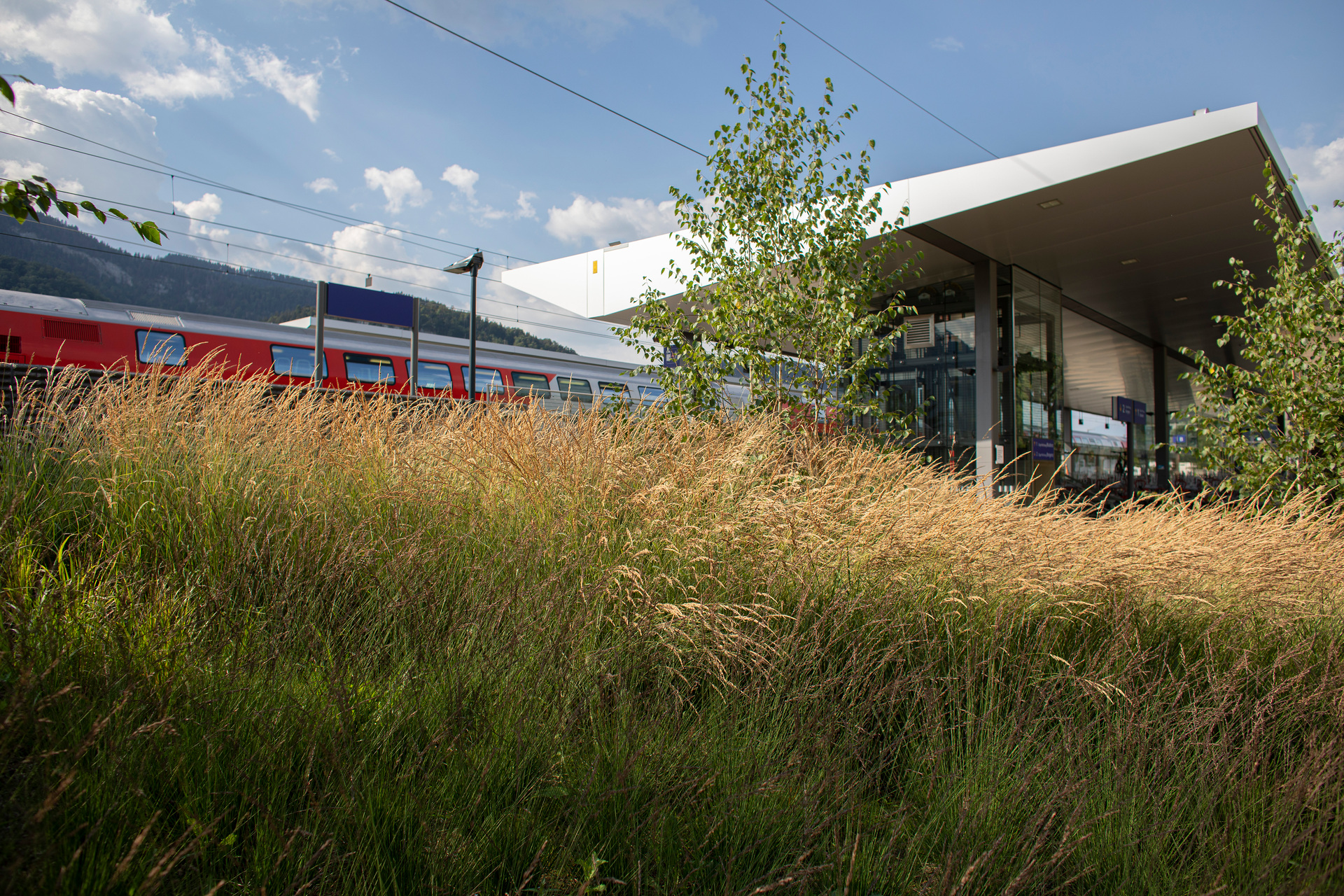 Cornus Clumbs mit Schwarzholz-Hartriegel, Rotem Hartriegel und Gelbholz Hartriegel geben das Begleitthema zwischen Parkplatz und Landesstraße. Nordwestlich des Bahnhofsgebäudes, entlang dem Fuß- und Radweg zur Gleisanlage prägen Himalaja-Birken als Birken-Ried den Bahnhofsvorplatz. Zwei Stieleichen in zentralen Grüninseln komplettieren das Ried-Zitat am Bahnhof. Die Pflanzung der Gehölze und Gräser hatte insbesondere im Bereich der Cornus Clumps unter bestmöglicher Schonung des Wurzelraumes der Bestandsbäume zu erfolgen. Handarbeit war hier durch den ausführenden Gärtner zu leisten. Östlich der Gleisanlage, entlang der Böschung und darüber hinaus, wurden auf rund 1.700 m² eine extensive Blumenwiese auf magerem Kiessandsubstrat angelegt. (Text: Landschaftsarchitektin)