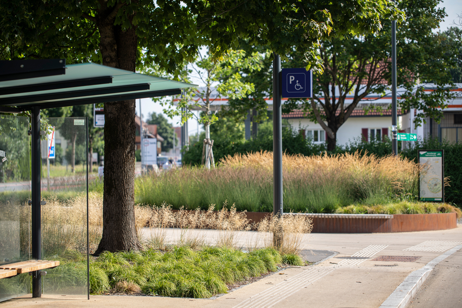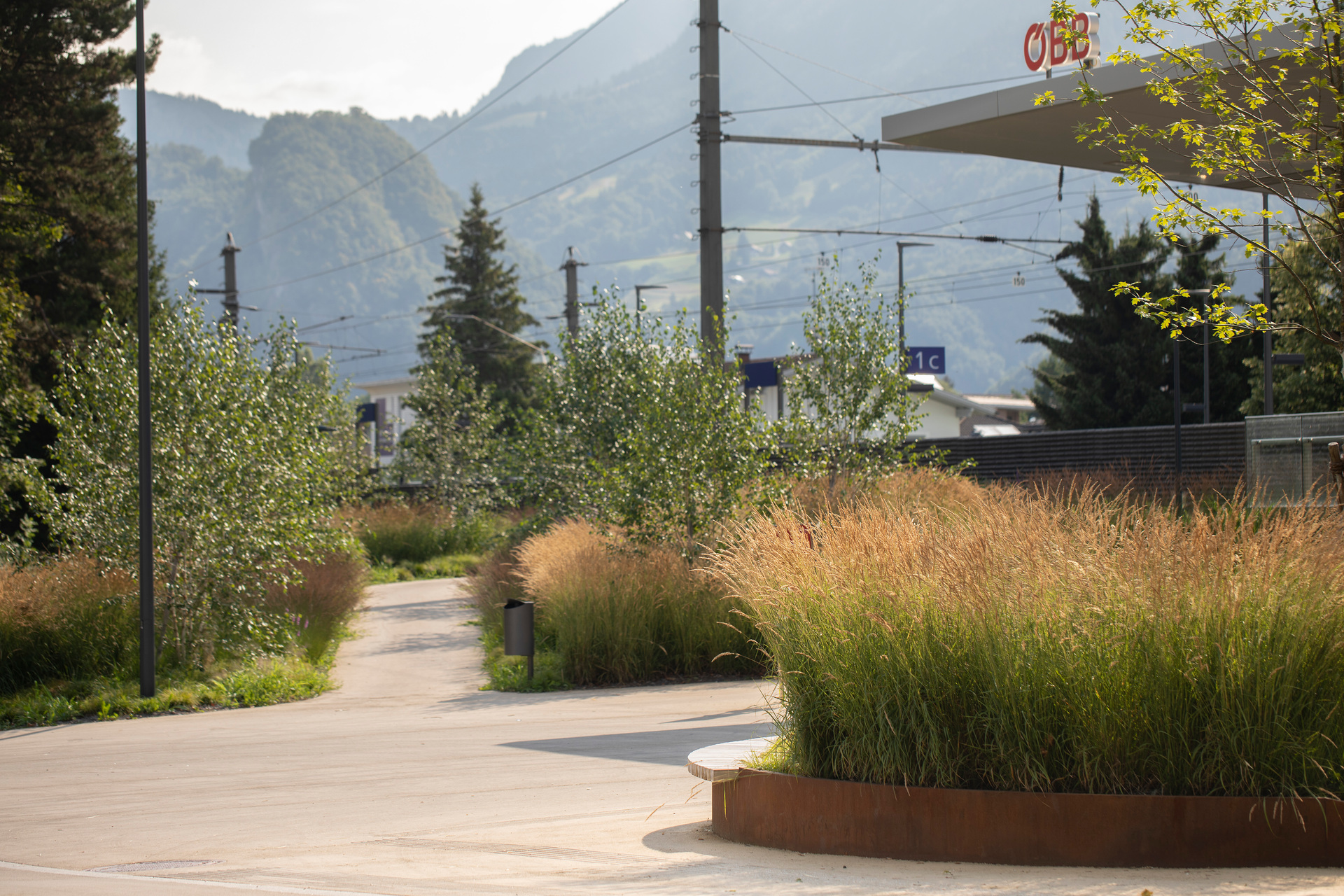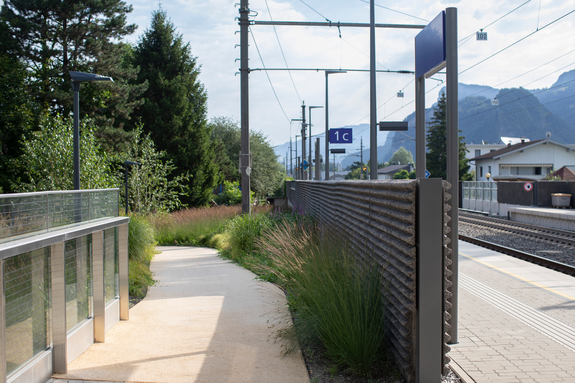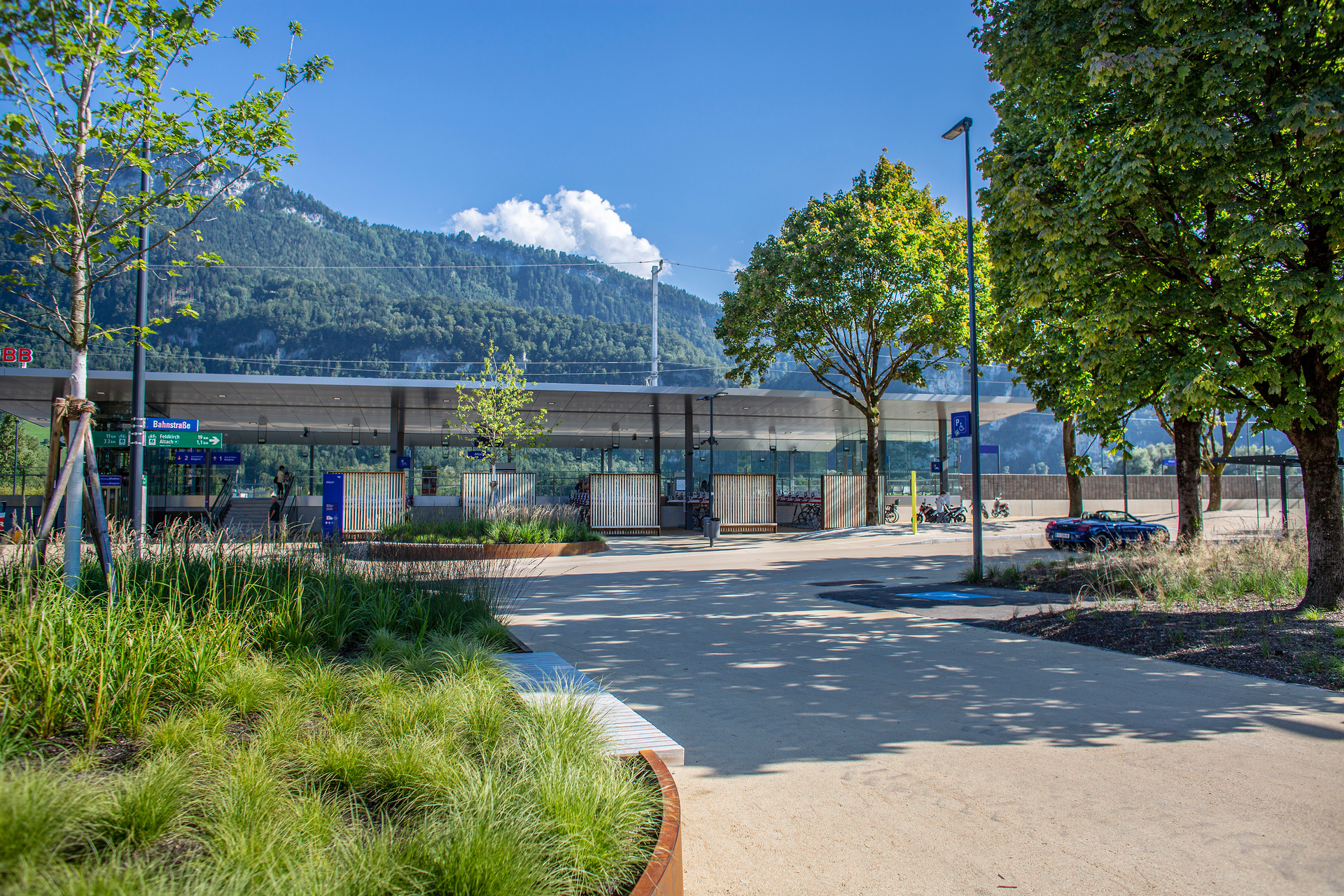 Cornus Clumbs mit Schwarzholz-Hartriegel, Rotem Hartriegel und Gelbholz Hartriegel geben das Begleitthema zwischen Parkplatz und Landesstraße. Nordwestlich des Bahnhofsgebäudes, entlang dem Fuß- und Radweg zur Gleisanlage prägen Himalaja-Birken als Birken-Ried den Bahnhofsvorplatz. Zwei Stieleichen in zentralen Grüninseln komplettieren das Ried-Zitat am Bahnhof. Die Pflanzung der Gehölze und Gräser hatte insbesondere im Bereich der Cornus Clumps unter bestmöglicher Schonung des Wurzelraumes der Bestandsbäume zu erfolgen. Handarbeit war hier durch den ausführenden Gärtner zu leisten. Östlich der Gleisanlage, entlang der Böschung und darüber hinaus, wurden auf rund 1.700 m² eine extensive Blumenwiese auf magerem Kiessandsubstrat angelegt. (Text: Landschaftsarchitektin)