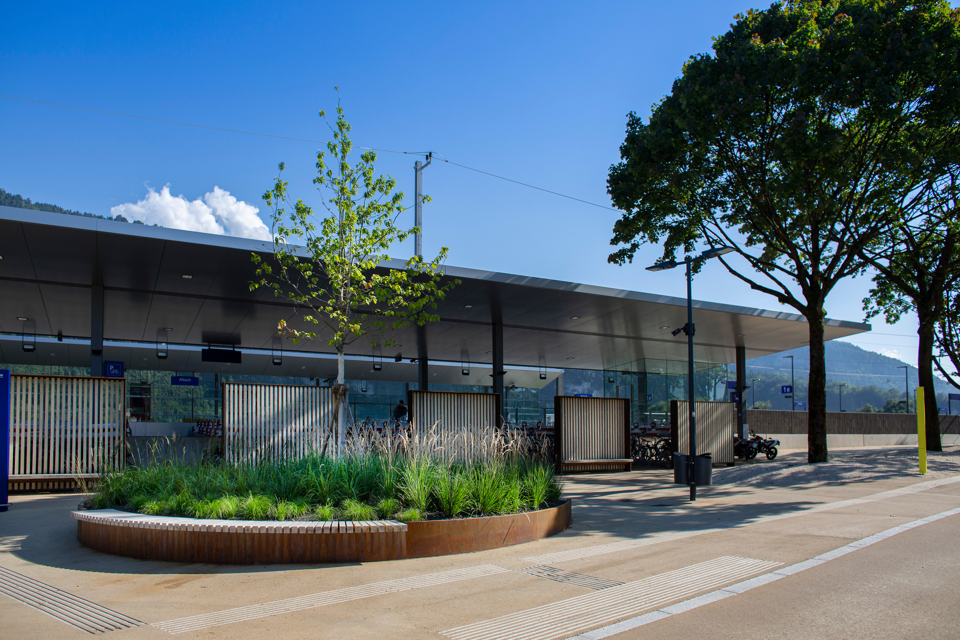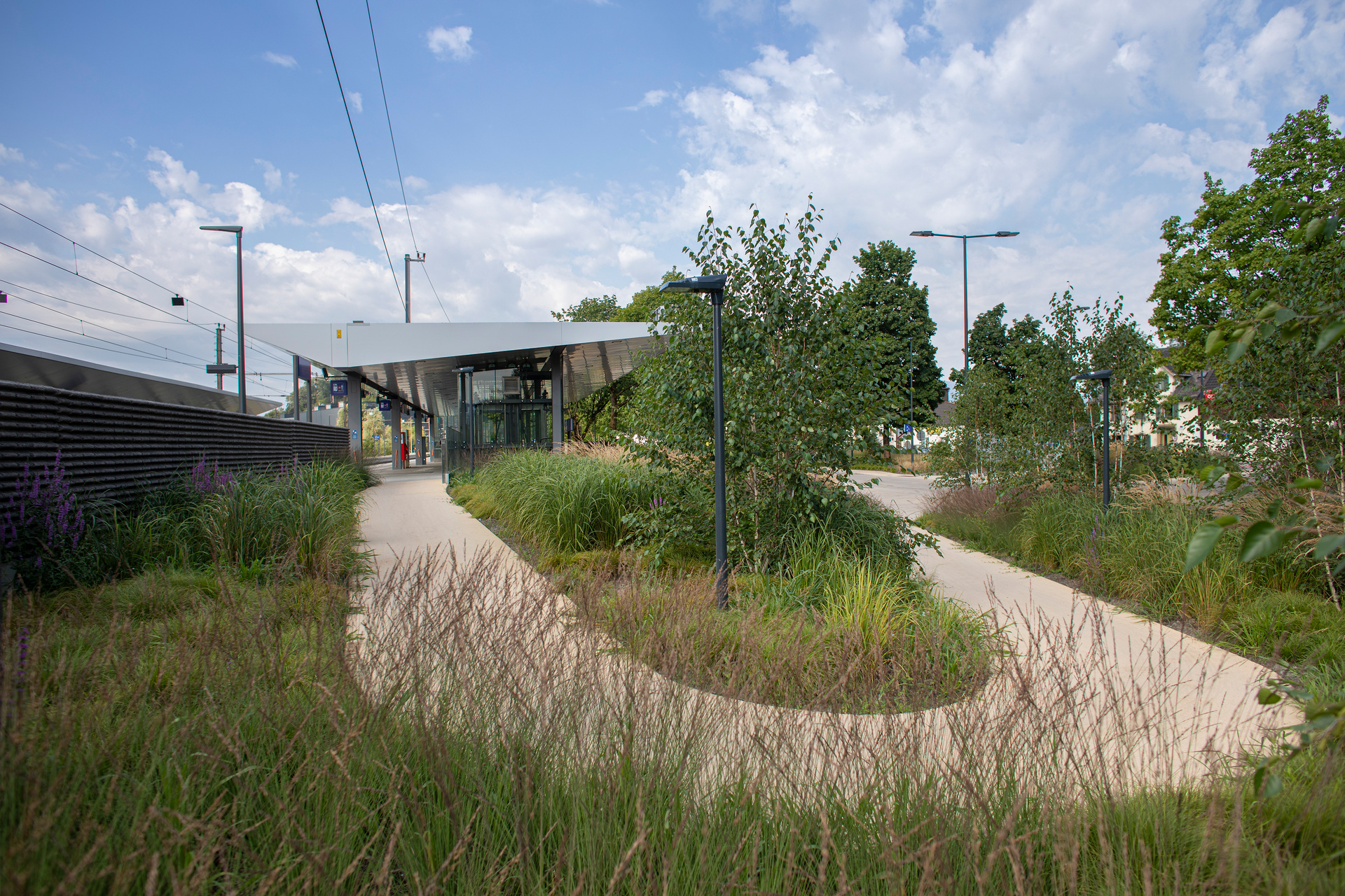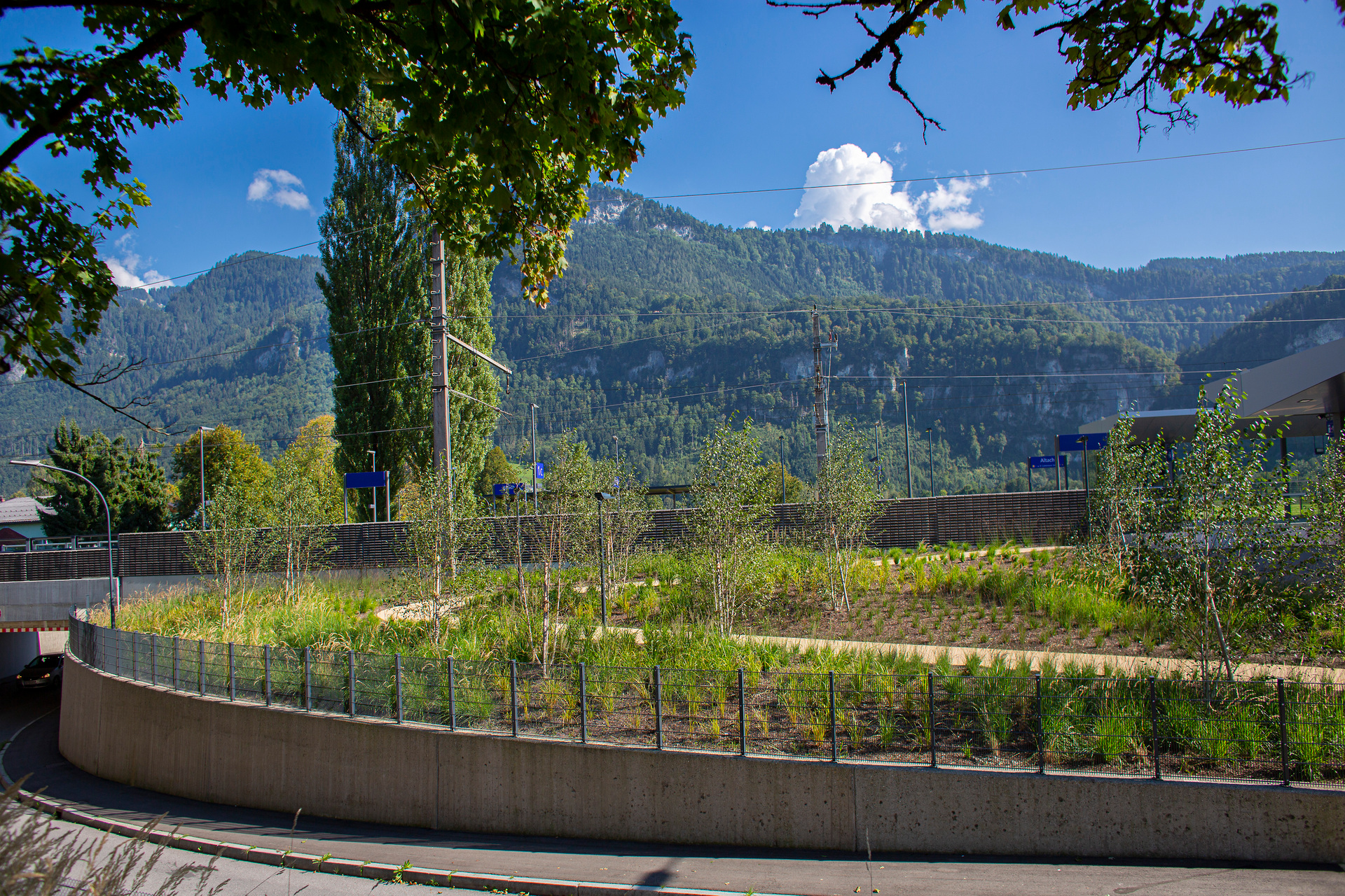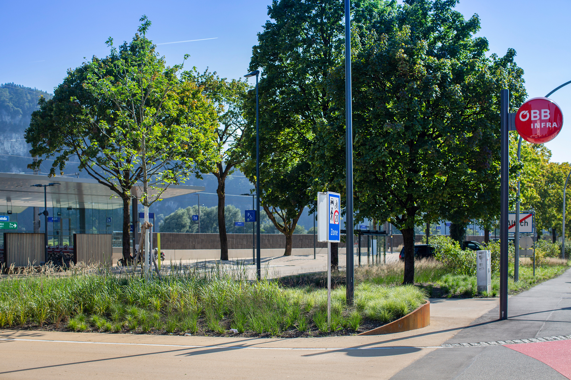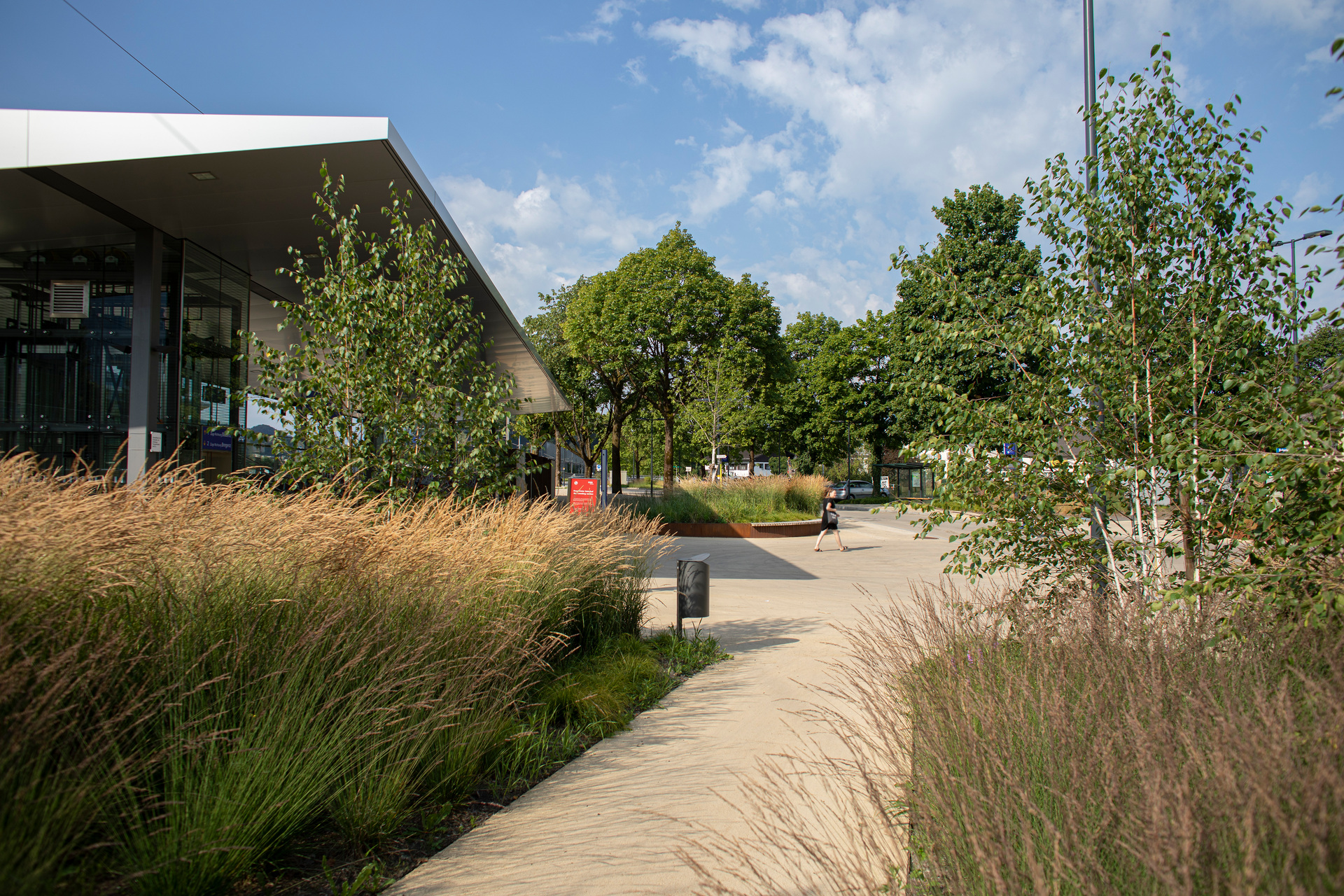 Cornus Clumbs mit Schwarzholz-Hartriegel, Rotem Hartriegel und Gelbholz Hartriegel geben das Begleitthema zwischen Parkplatz und Landesstraße. Nordwestlich des Bahnhofsgebäudes, entlang dem Fuß- und Radweg zur Gleisanlage prägen Himalaja-Birken als Birken-Ried den Bahnhofsvorplatz. Zwei Stieleichen in zentralen Grüninseln komplettieren das Ried-Zitat am Bahnhof. Die Pflanzung der Gehölze und Gräser hatte insbesondere im Bereich der Cornus Clumps unter bestmöglicher Schonung des Wurzelraumes der Bestandsbäume zu erfolgen. Handarbeit war hier durch den ausführenden Gärtner zu leisten. Östlich der Gleisanlage, entlang der Böschung und darüber hinaus, wurden auf rund 1.700 m² eine extensive Blumenwiese auf magerem Kiessandsubstrat angelegt. (Text: Landschaftsarchitektin)