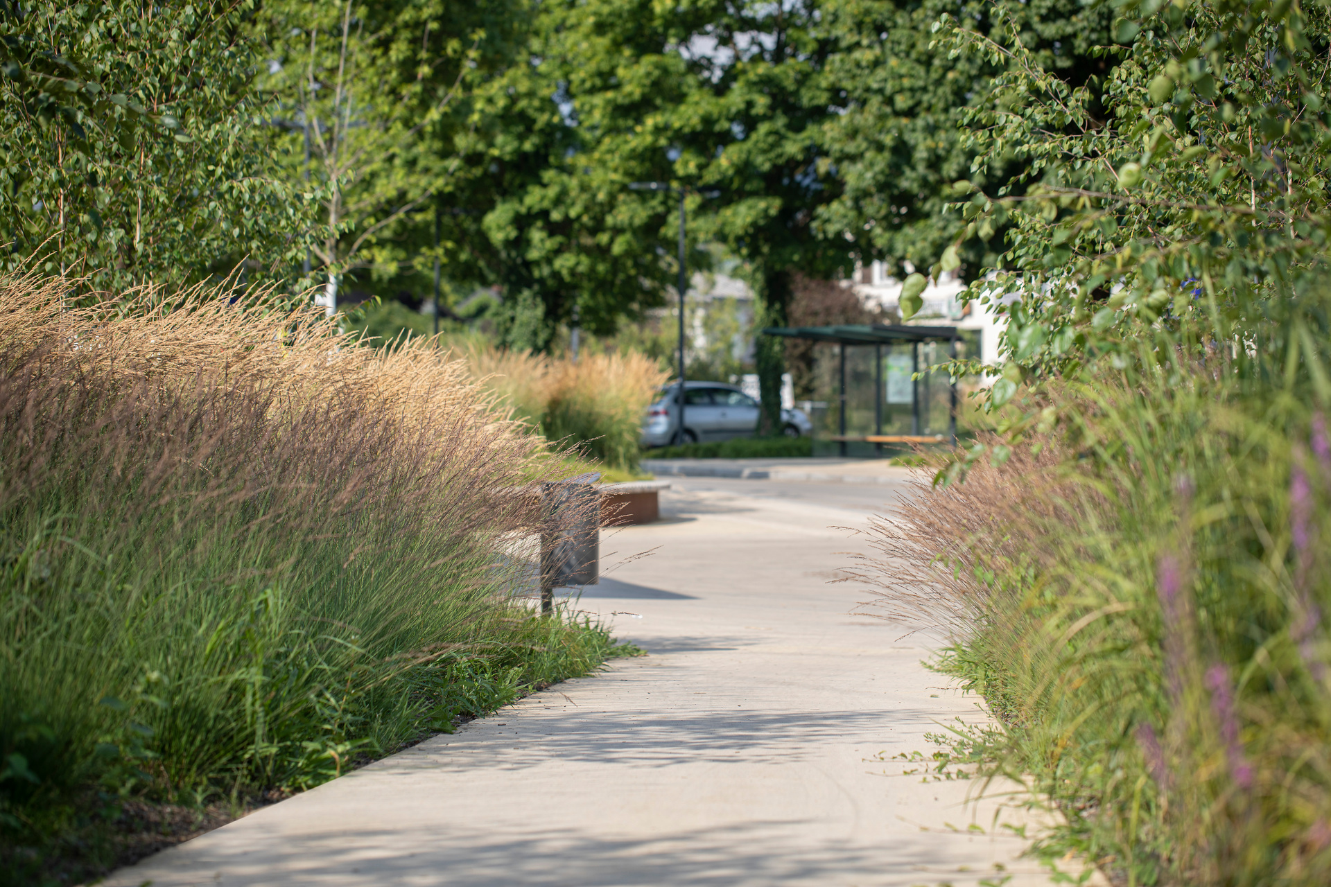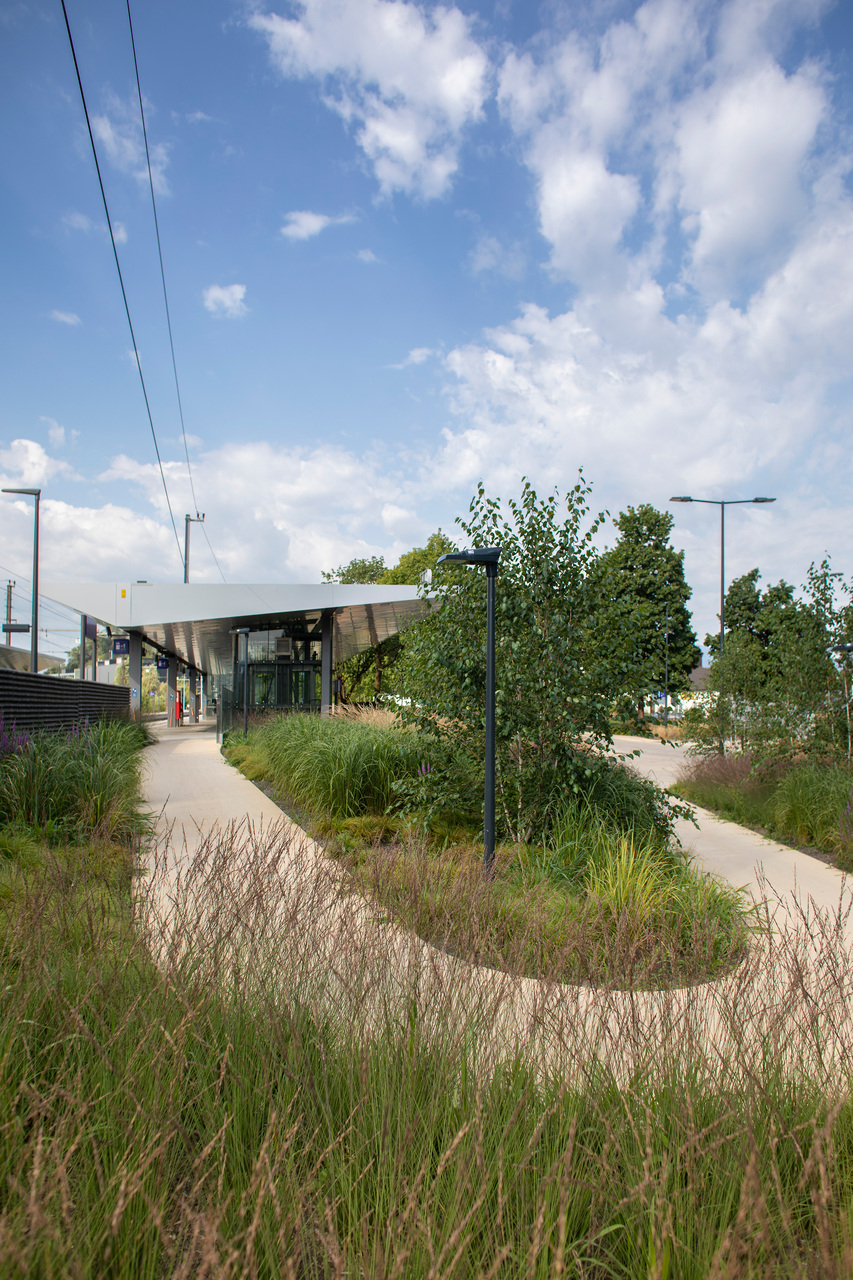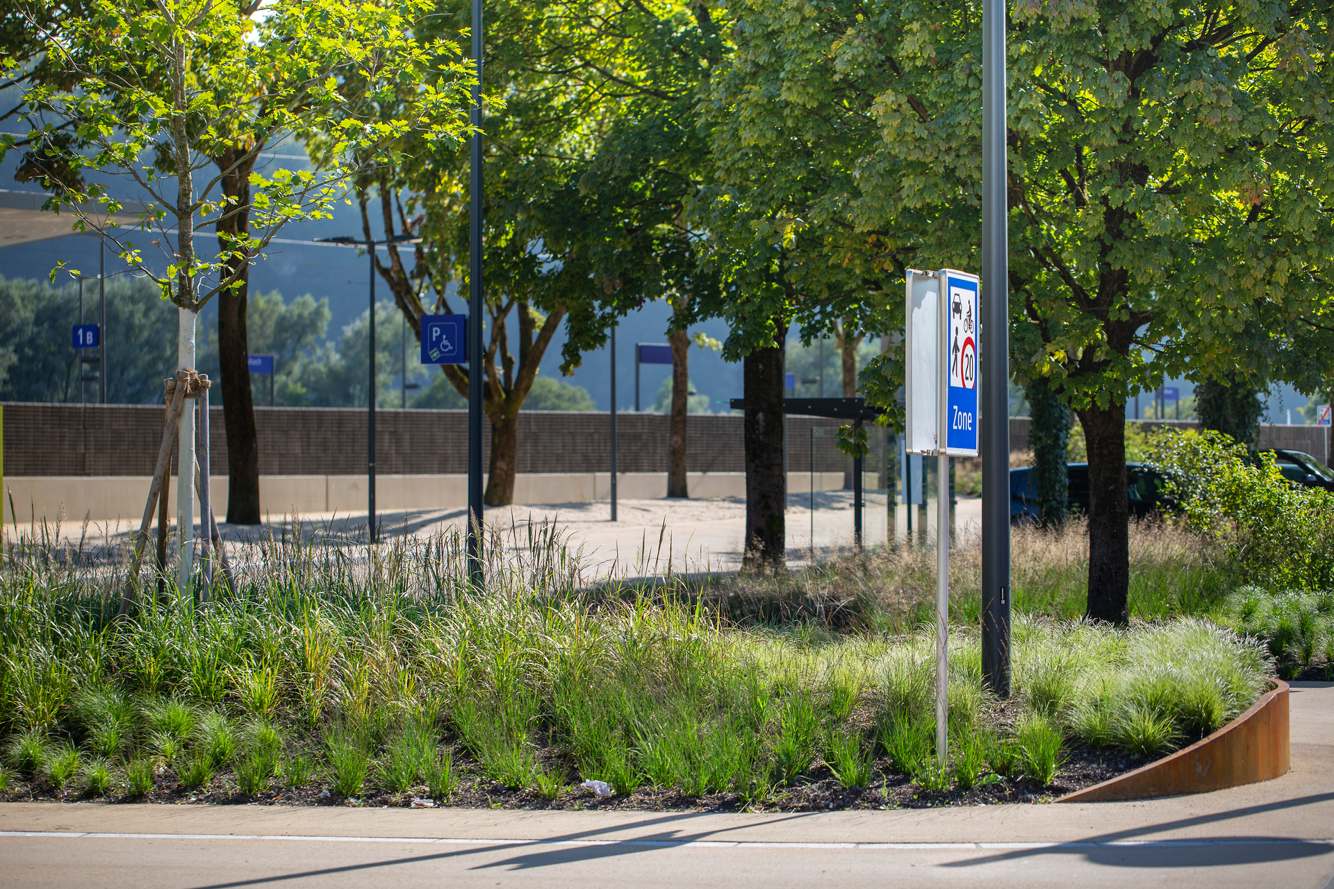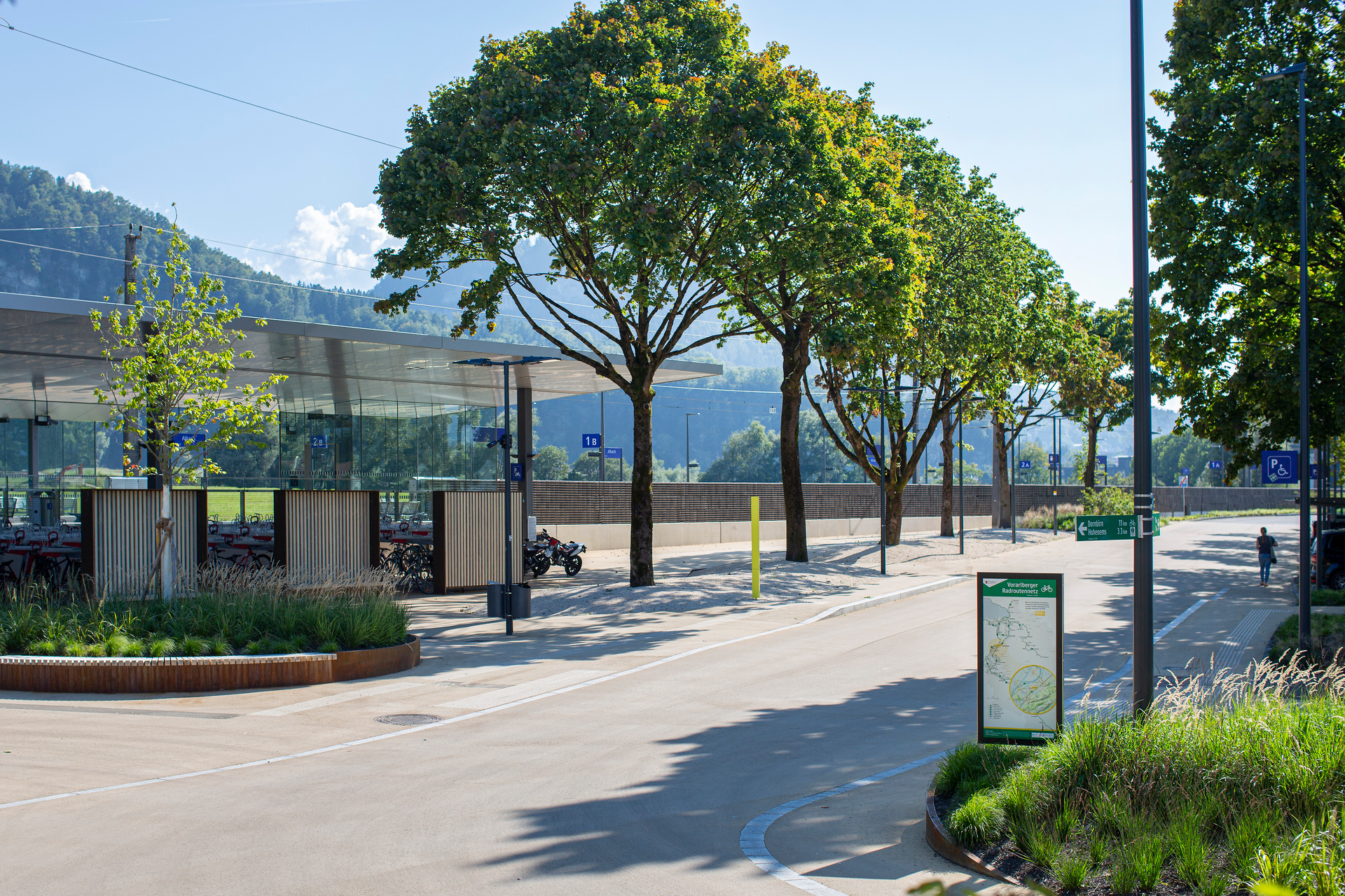 Cornus Clumbs mit Schwarzholz-Hartriegel, Rotem Hartriegel und Gelbholz Hartriegel geben das Begleitthema zwischen Parkplatz und Landesstraße. Nordwestlich des Bahnhofsgebäudes, entlang dem Fuß- und Radweg zur Gleisanlage prägen Himalaja-Birken als Birken-Ried den Bahnhofsvorplatz. Zwei Stieleichen in zentralen Grüninseln komplettieren das Ried-Zitat am Bahnhof. Die Pflanzung der Gehölze und Gräser hatte insbesondere im Bereich der Cornus Clumps unter bestmöglicher Schonung des Wurzelraumes der Bestandsbäume zu erfolgen. Handarbeit war hier durch den ausführenden Gärtner zu leisten. Östlich der Gleisanlage, entlang der Böschung und darüber hinaus, wurden auf rund 1.700 m² eine extensive Blumenwiese auf magerem Kiessandsubstrat angelegt. (Text: Landschaftsarchitektin)