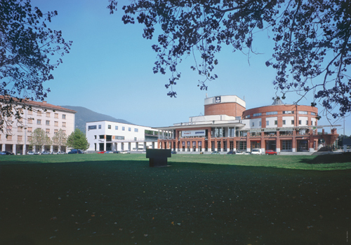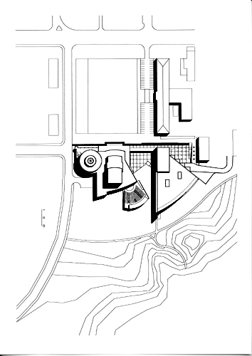 With its form the library adapts to the existing geometry of the space, following the theory of critical regionalism, according to which an intervention can be contemporary in every sense but still needs to adapt to the context. Thus on one side the building the town hall facade is continued by means of a wall backdrop, while on the other side it opens like a fan into the park.