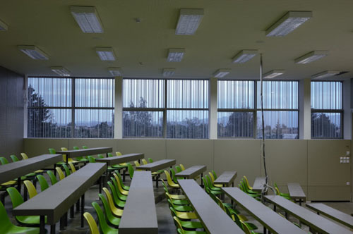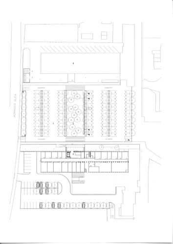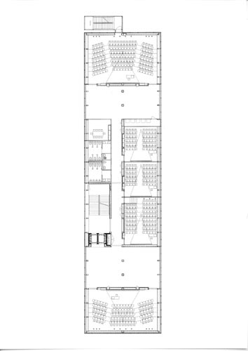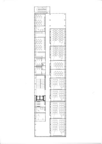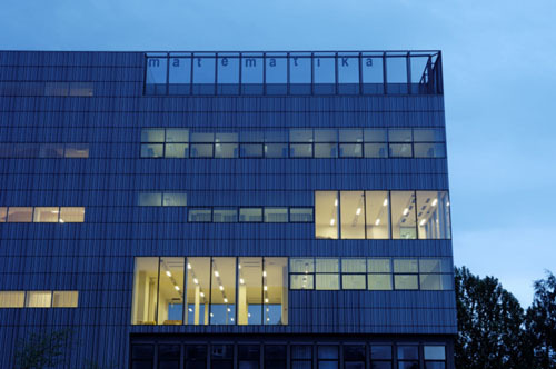 At first sight the whole story seems illogical, but it is true that the new Faculty of Mathematic Building is built on top of a privately owned computer company building, currently under reconstruction by another architect. The plot along Jadranska Street in Ljubljana was reserved for two faculty buildings, but in 1968 they built only the Faculty of Physics, while of the mathematical building only the foundations were made before the money ran out. Instead they built a building that hosted the central Slovenian computer system. In the times of political and economic changes the centre was privatised and became a private computer company. When the money for the new building for the Faculty of Mathematics finally came, it was logical that the new building would be built on their own land, not to mention the foundations. This decision brought some problems with it. First, they had to solve the construction that had to protrude through two lover floors, second problem is that the faculty has no hall on the ground floor, as would be normal, as the ground floor belongs to the other company. There is only enough space for the stairs and elevators and visitors have to reach the third floor where the faculty really starts. In this floor there are two large halls in front of two large lecture rooms. In the fourth floor there are normal lecture rooms along the central corridor, the public spaces – two halls are situated in the end corners of the building. In the fifth floor there are cabinets for professors with small reception rooms in the middle of the two parallel corridors, where professors can meet with their students. The teacher’s staff room with a cafeteria act as public space on this floor. The last floor is devoted to offices and there is still enough space for three terraces. The money was, as always in such cases, limited and for the interior the architects used simple and clear solutions. The only part where architects could show their ambition is the façade itself. As the terraces are covered with steel frames the whole volume of the building is a clear rectangular box where only the sun protection screens an South façade and fire escape stairs on the back façade are added. The rest is glass façade, treated in three ways. The parts in front of public spaces are covered with clear glass, the rest is glass printed with vertical stripes. Some glass is in front of windows the rest covers the façade. In this way the unique volume of the building is treated in different ways, making different effects during the day and night. The printed glass also diminishes its transparency and takes away some of the reflex so typical for glass facades. The lower part of the building is a story of its own, and the new façade covers it only in the entrance part thus marking it. The connection with the old Faculty of Physics building is marked with a small park with trees leading across the parking space from which is divided by a long bench and a roof of bicycle stand. Both elements accent the connection between buildings who are, among other things, similar in shape and dimension.