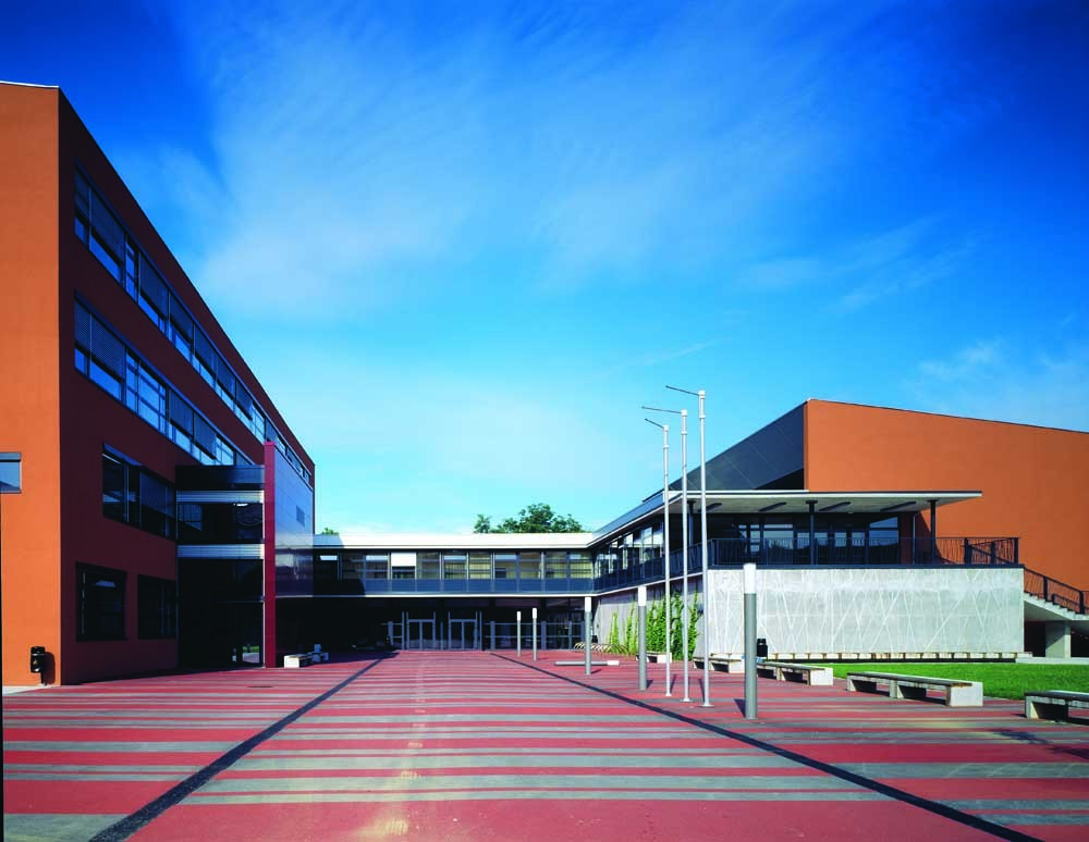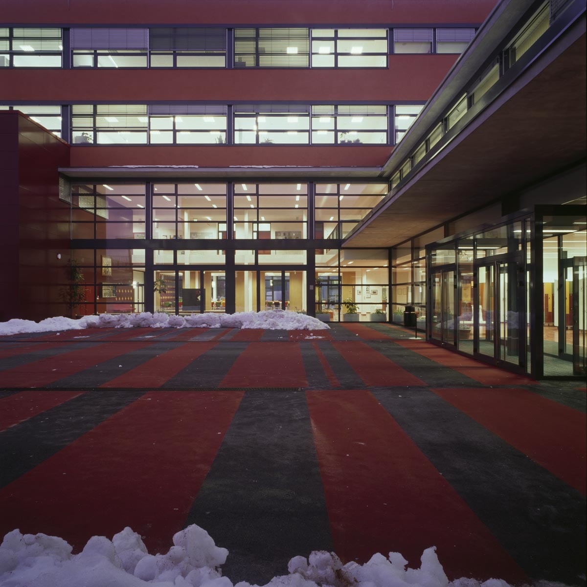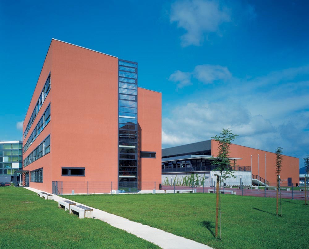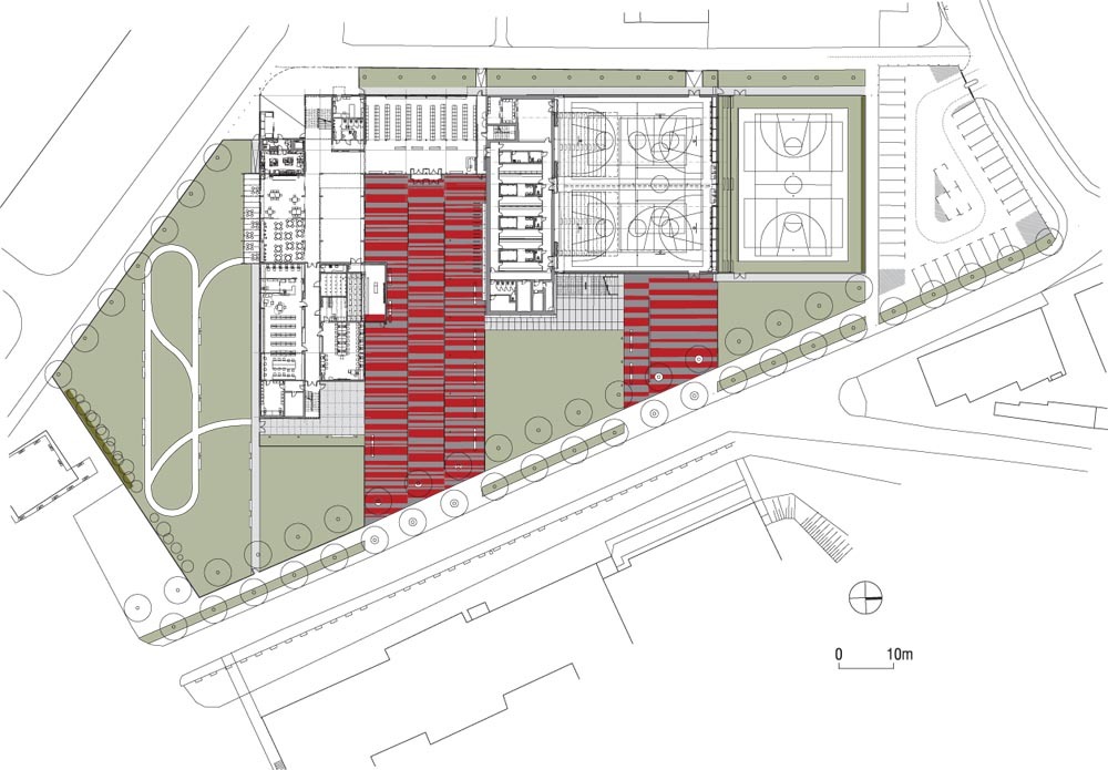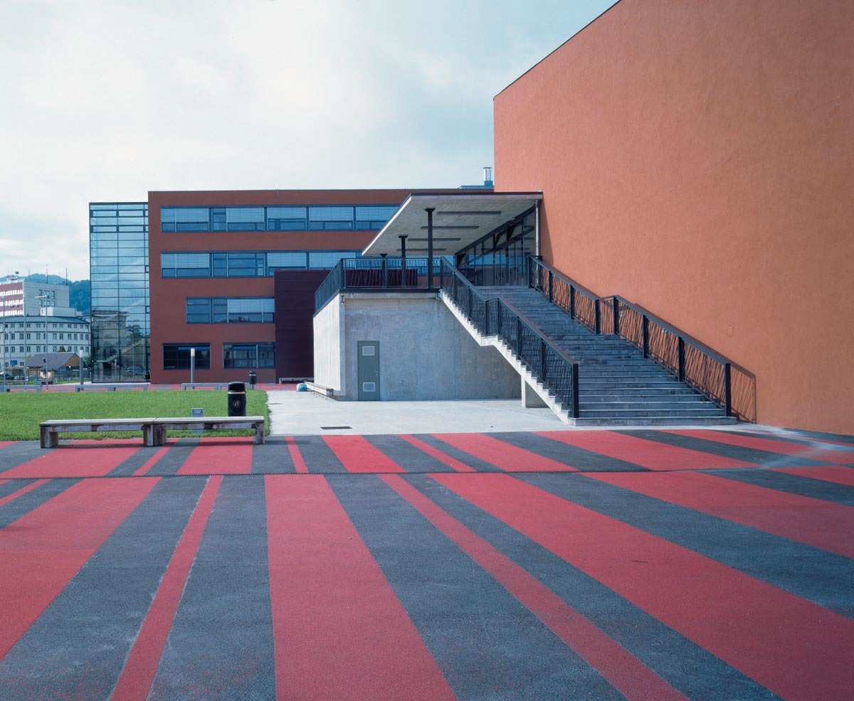 The building is formed in the shape of the letter U, whose sides are a classroom tract, a central cloakroom with administration board and a tract of a gym with dressing rooms in the shelter area. The classroom tract itself is composed of two longitudinal building volumes (connected by a line of communications) that at some distance follow the building line. This school square is connected with a tree-planted walk along the Ipavčeva Street that passes the gym tract and ends at the outer sports grounds. From the side of the Ipavčeva Street, the school square turns into a space limited on the right by a green wall of the shelter and gym, on the left a space intended for different activities is created, and in the axis, through the filter of the dressing rooms, the square is optically connected with the green area by the primary school and kindergarten.