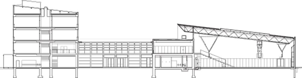Compactness of the more solid part of the composition ends with the gym, which the volume of the whole school building flows into and which at the same time represents a sequence – a passage from a full space, i.e. the classroom tract, over the gym to an open space of the outer grounds. The dimensions of the space intended for different activities are determined by the volume of a lecture room taken out of the ordinary height of the classrooms; besides showing its particularity among the uniformed classrooms, it also establishes a transverse sequence in the longitudinal space of the school square.