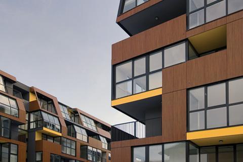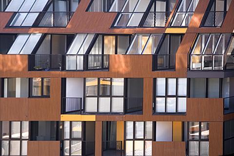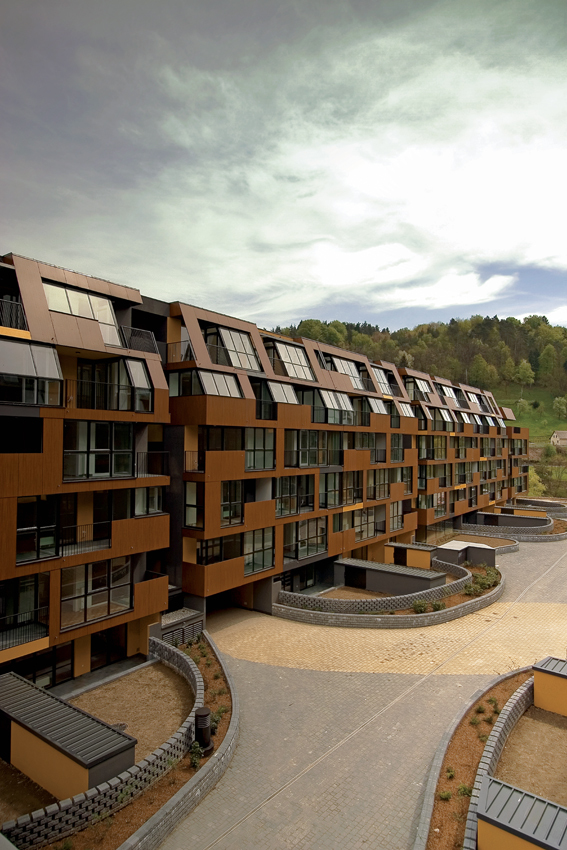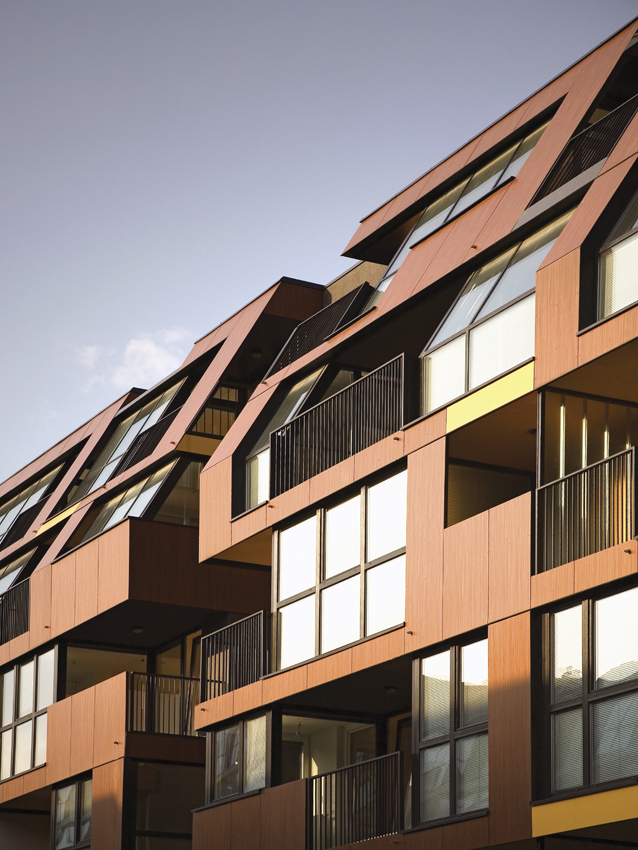 The facade is designed in two layers, the inner facade and outdoor space being formed by items such as glazed loggias, balconies, terraces and verandas. The second skin is constructed with pre-formed wooden panels, glass and metal rails. The structure of the apartments is such that each apartment gets at least one balcony and loggia that connects outdoor and indoor space. Like the modules, the facade layer is also repeated four times, but given the different geometry of the elements the repetition passes virtually unnoticed.