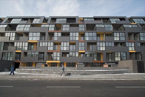 Each building is divided into four identical modules, each with its own vertical communications core. There are 42 apartments in each module, varying from small 30 m² studios to 1.5-bedroom 60 m² apartments on four identical floors, and larger duplex apartments from 85 to 105 m² on the top two floors. The module is repeated four times with slight variations at the far ends of the building.