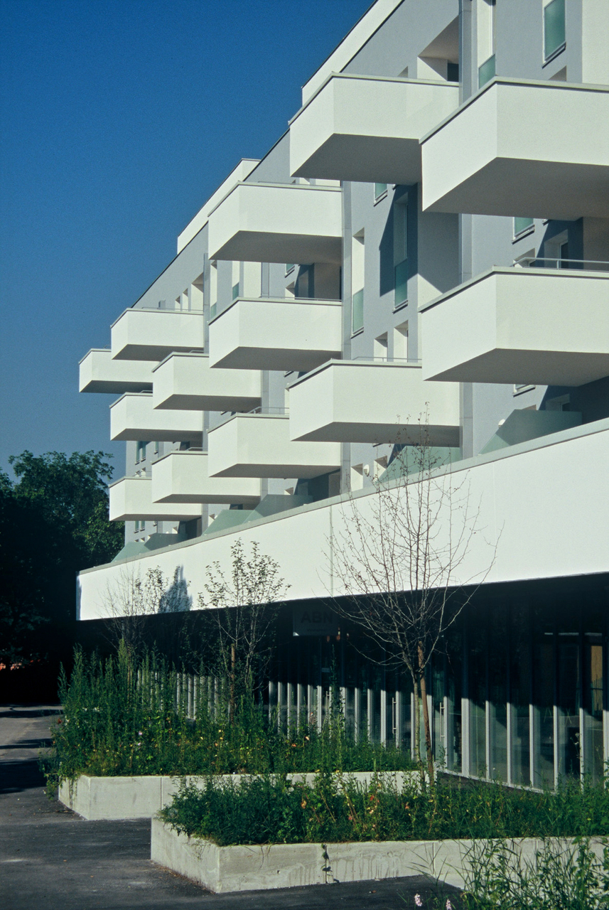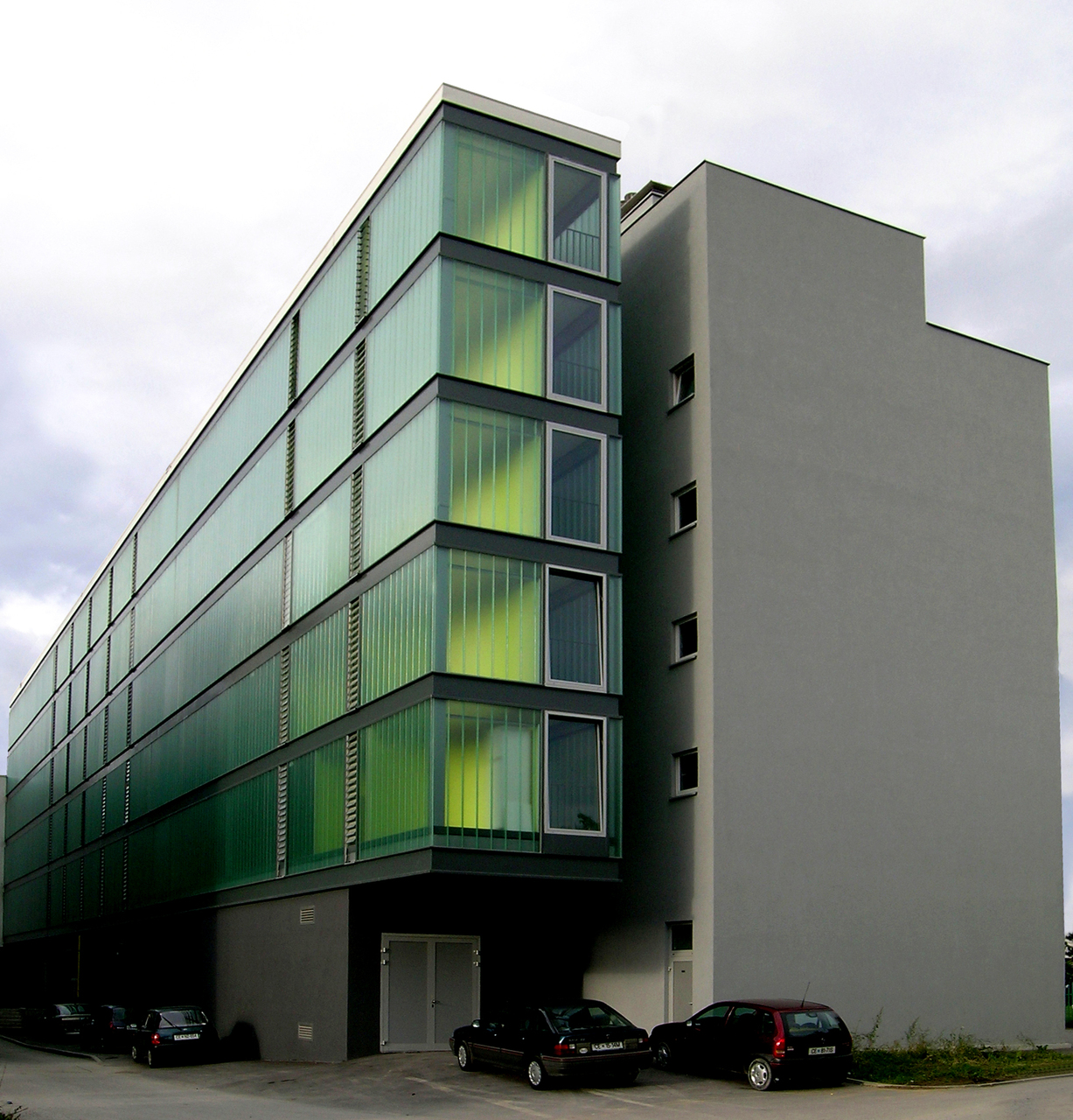 Specific element of residence part is the communication block witch is located on the back side of the object. It protects the residential part from gas fumes coming from multi floor garage and enabling air-conditioning of apartment service rooms (bathroom, toilette, kitchen utility room) through the space in between communication block and residence volume. Communications block also serves as an anti-noise protection for resident area by reducing noise from the multi floor garage and Spar store.