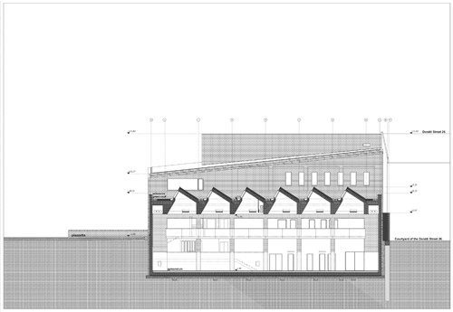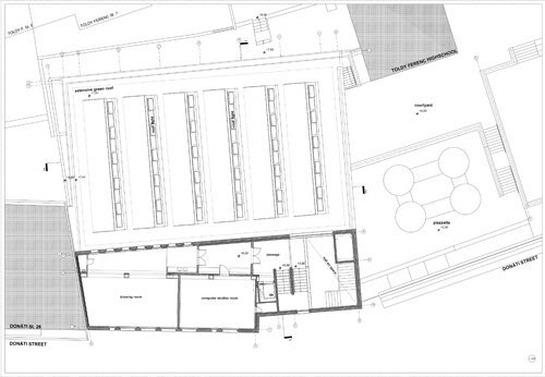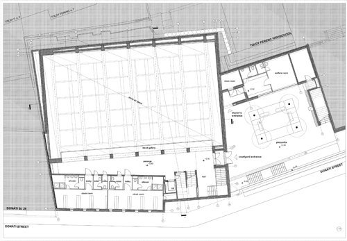 The mono-pitched roof of the building unit containing the changing rooms, offices and stairway is an organic continuum of the closed street front created by the neighboring houses. Due to the area’s topography, the street entrance is situated on the ground floor, whereas the courtyard entrance provides access to the first floor. The nurse’s office is located in the wing to its right.