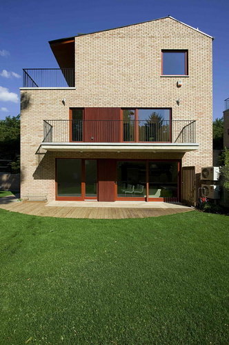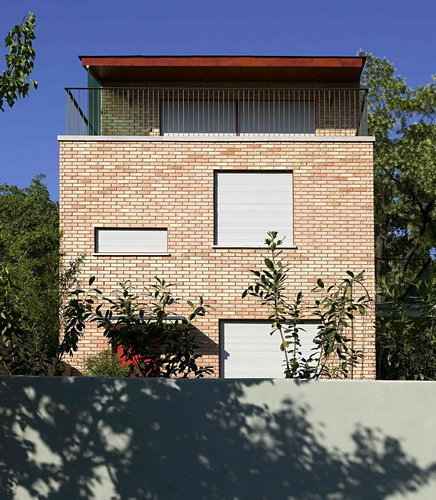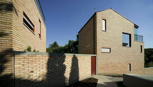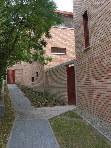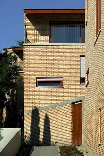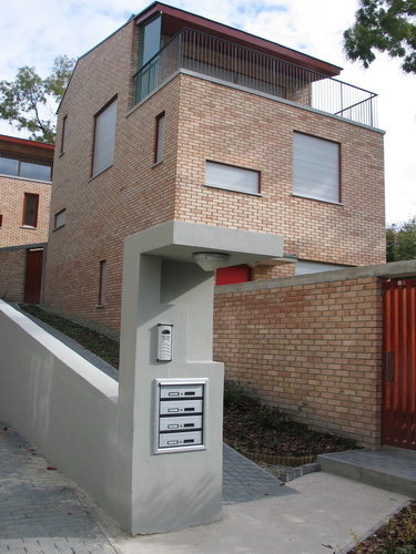 The houses are slightly different variations of one single basic form. The buildings and even the fence is made of brick; the roof and the eaves are of zinc sheets, the front doors and the gate of wood. The plain, strictly geometric brick-cubes are articulated by the seemingly random-placed window openings. They remain truly openings: not divided by transoms, but appear as simple rectangular figures, differing in size and orientation. The homogeneous brick surface is split by concrete elements in the same way. The sills of the windows and terraces are of prefabricated concrete. An other emphasized geometric form is the concrete ’beam’ running on the top of the fence – and turning down to the ground at the gate.