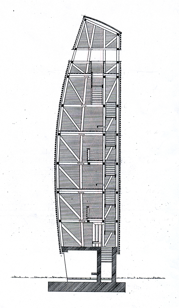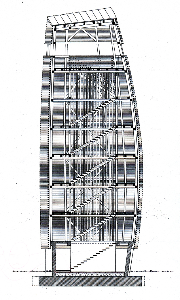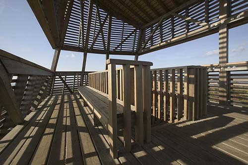 Except the ground level, the lookout tower is made of larch, and the structural beams are connected by specially designed and manufactured steel joints. All the heavy larch elements were lifted by hand, because there was no opportunity to use machines.