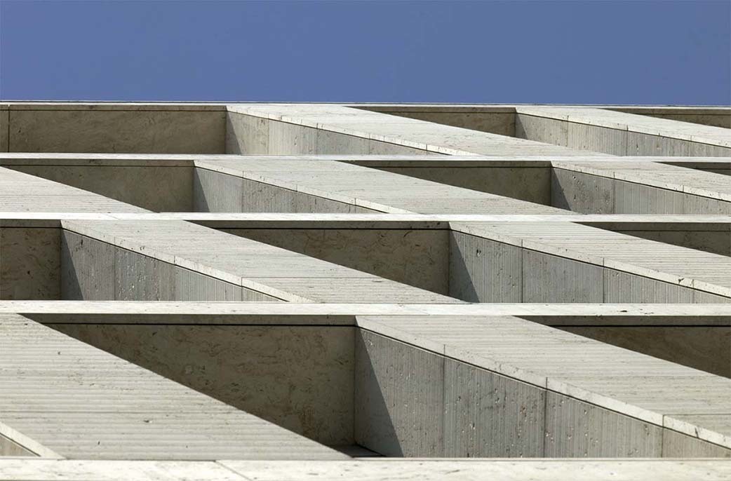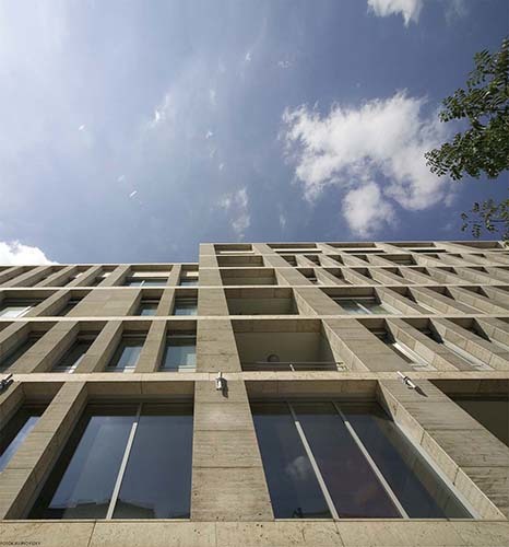 The street facade got a limestone coating, the horizontal parts are polished unglazed, the vertical elements have seamed surface. The delicate change of the textures, and the „mistakes” by the arranging of the elements give a fine lightness to the facade.