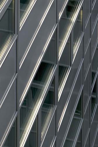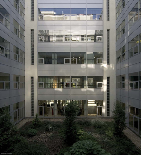 The arrangement of the building is very economic, the rate of the office areas is almost 95%, only the lobby and the three staircases make up the common place. From the main entrance you can get to all three staircases, and behind the foyer the green court separated by a glass wall is a lovely dash of color. (architects' text)