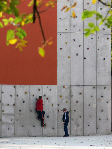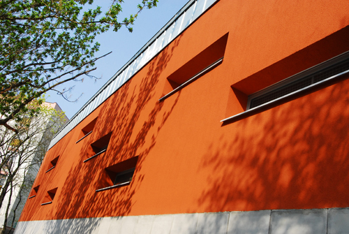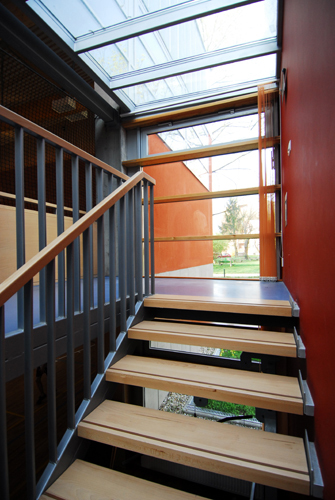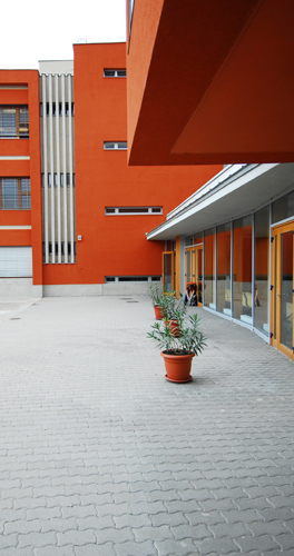 After the esablishment of the new locker rooms, the old ones were reconstructed as vocational classrooms. All of the vocational class rooms and library were placed on the ground floor. The general classrooms were placed on the upper floors. Above the lobby lies the administration and the teacher’s room with a separated smoking room and a little kitchen. The old electrcity and mechanical structure of the class room wing was renovated simillarly to the lobby and the kitchen.
