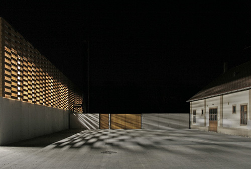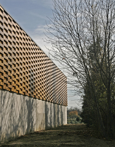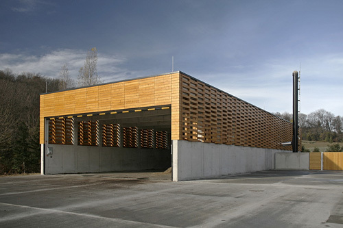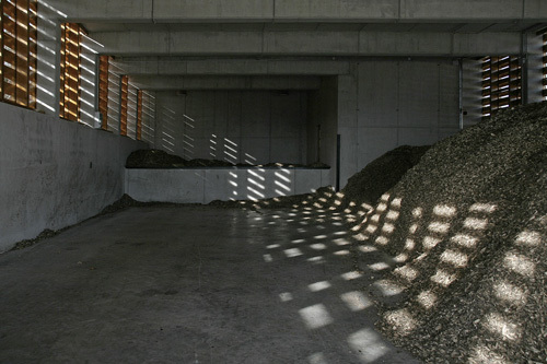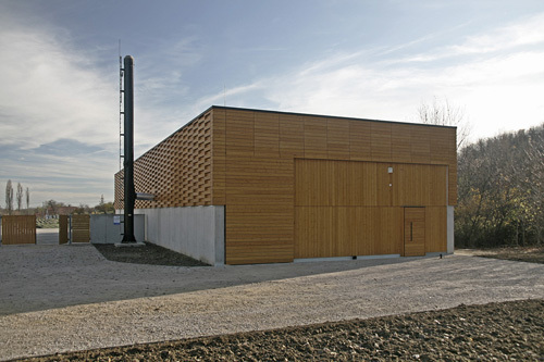 The new building consists of two parts: the storage area, where wood waste of a nearby forestry is dried and stored and the machine room, located underground, where the heating energy is generated.